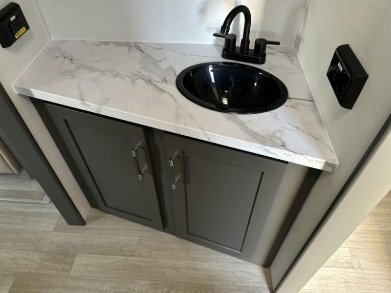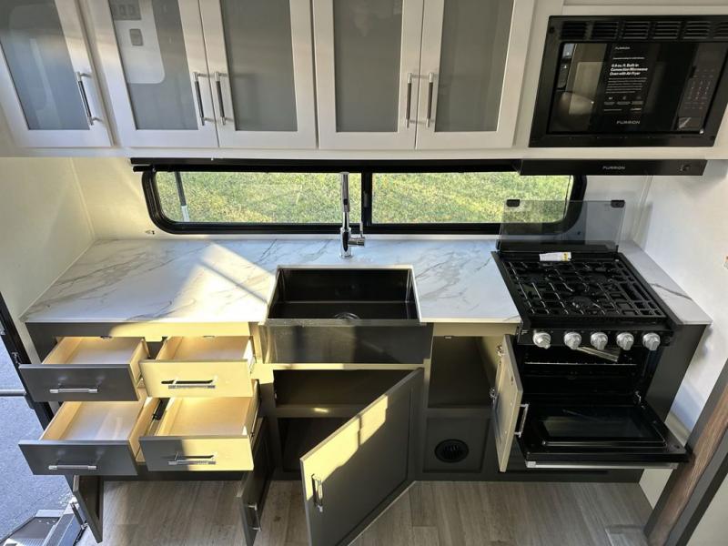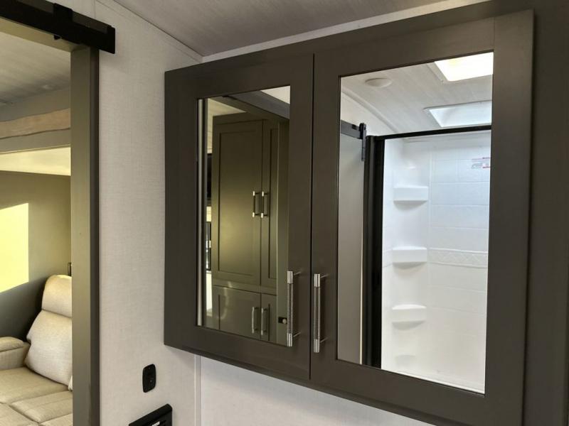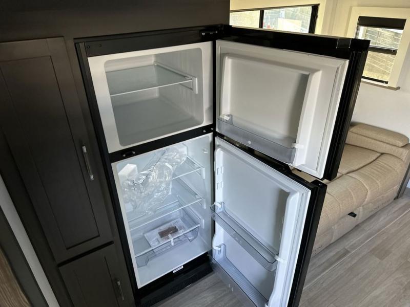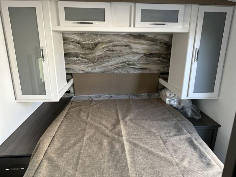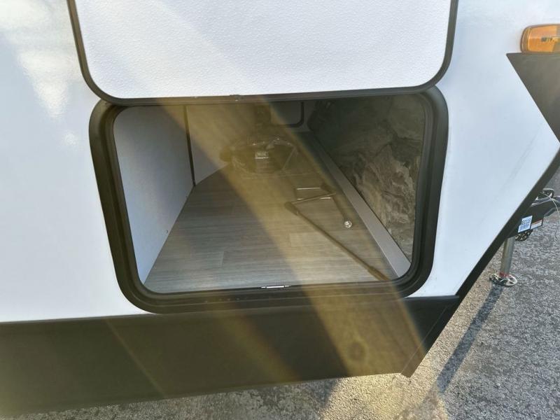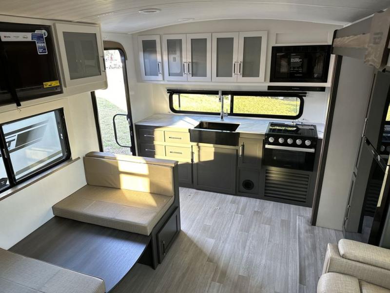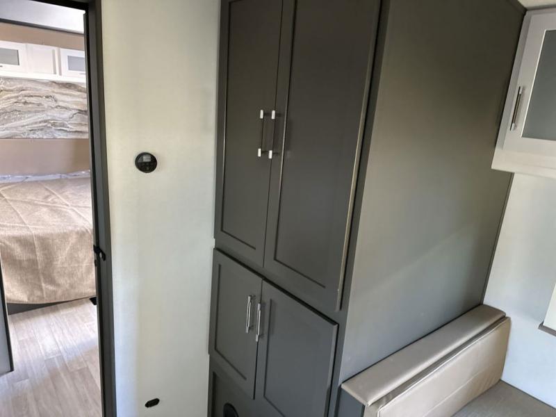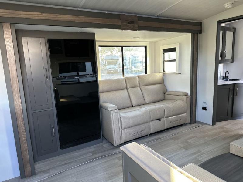 One step inside this dual entry travel trailer and you'll be sold! The rear kitchen features ample counter space to prep meals, and the booth dinette provides a place to dine together. There is also an outdoor kitchen with a griddle and mini fridge plus a 19' awning if you want to cook and eat outdoors. Two pantries and a 12V refrigerator will let you keep food stocked, and the tri-fold sofa slide provides sleeping space for guests. A walk-thru bath will create a front master bedroom you are sure to love, complete with a queen bed plus dual nightstands and dual wardrobes to keep everything tidy!