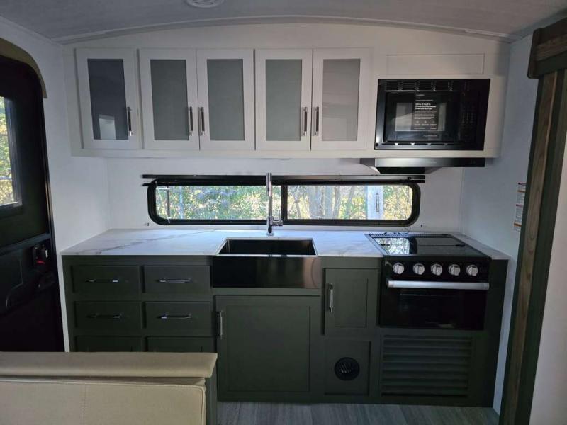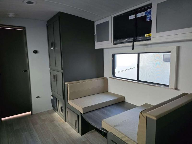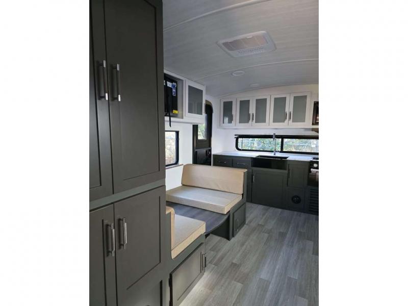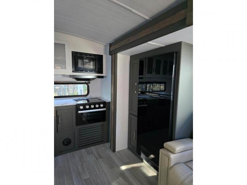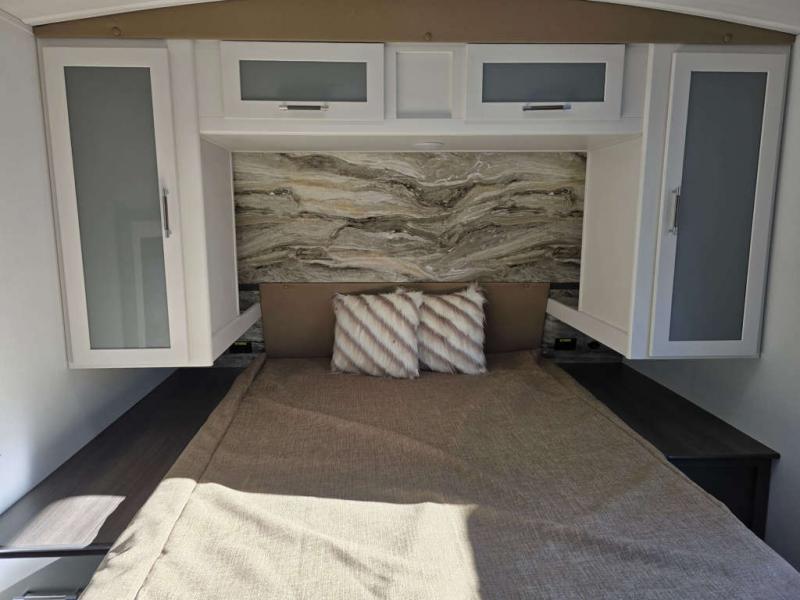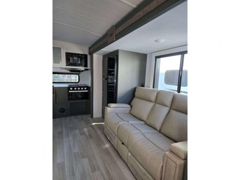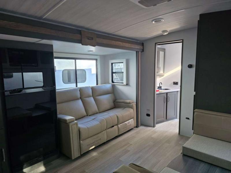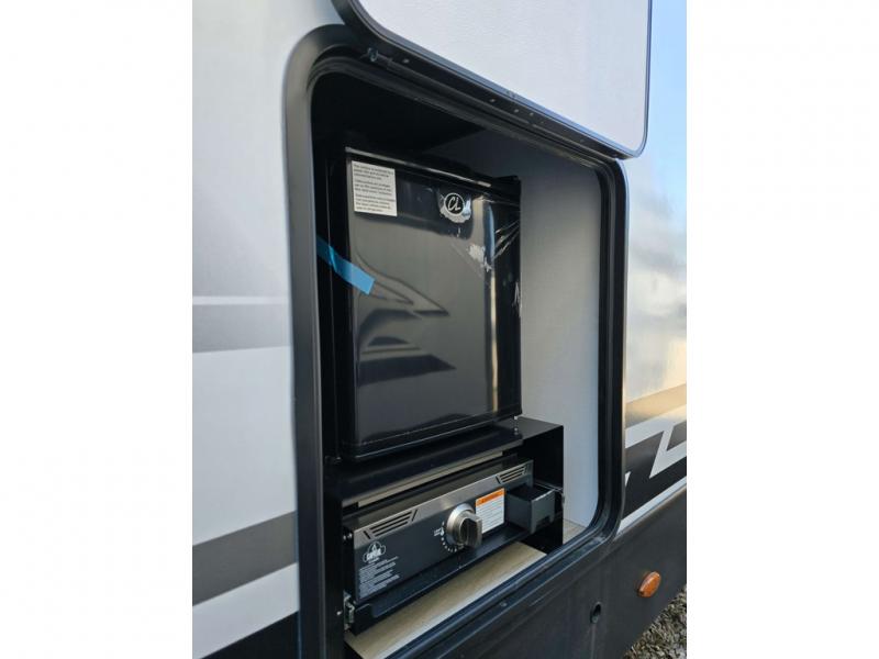 One step inside this dual entry travel trailer and you'll be sold! The rear kitchen features ample counter space to prep meals, and the booth dinette provides a place to dine together. There is also an outdoor kitchen with a griddle and mini fridge plus a 19' awning if you want to cook and eat outdoors. Two pantries and a 12V refrigerator will let you keep food stocked, and the tri-fold sofa slide provides sleeping space for guests. A walk-thru bath will create a front master bedroom you are sure to love, complete with a queen bed plus dual nightstands and dual wardrobes to keep everything tidy!