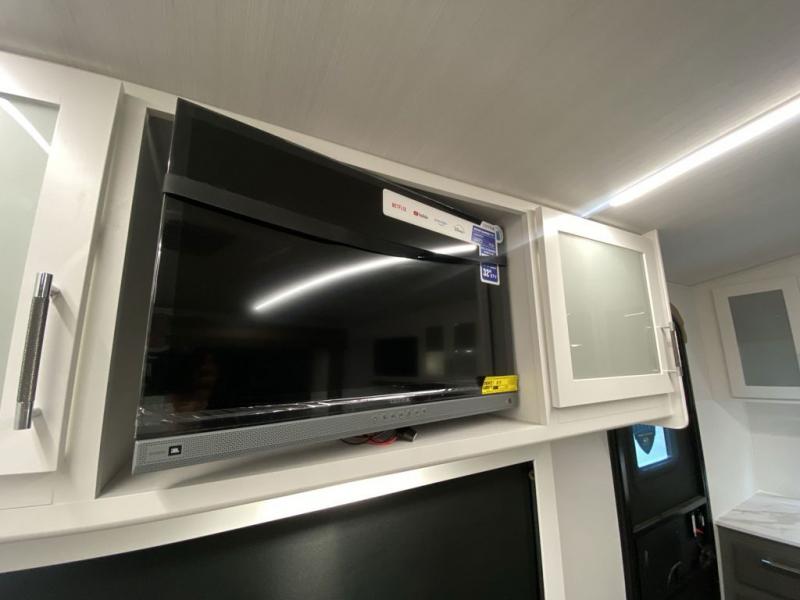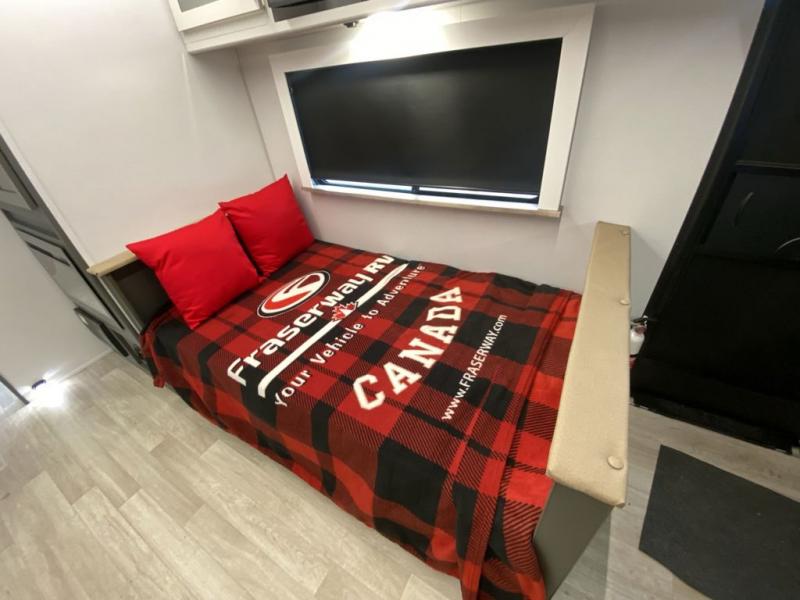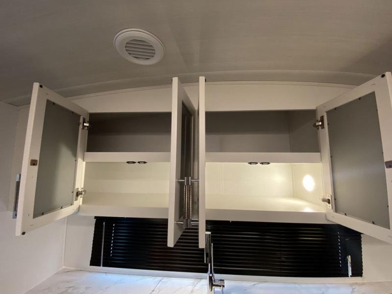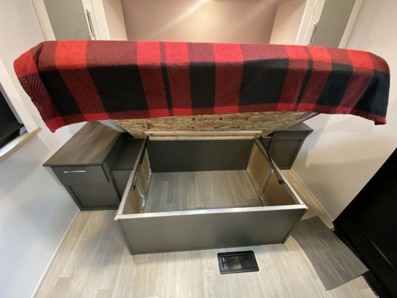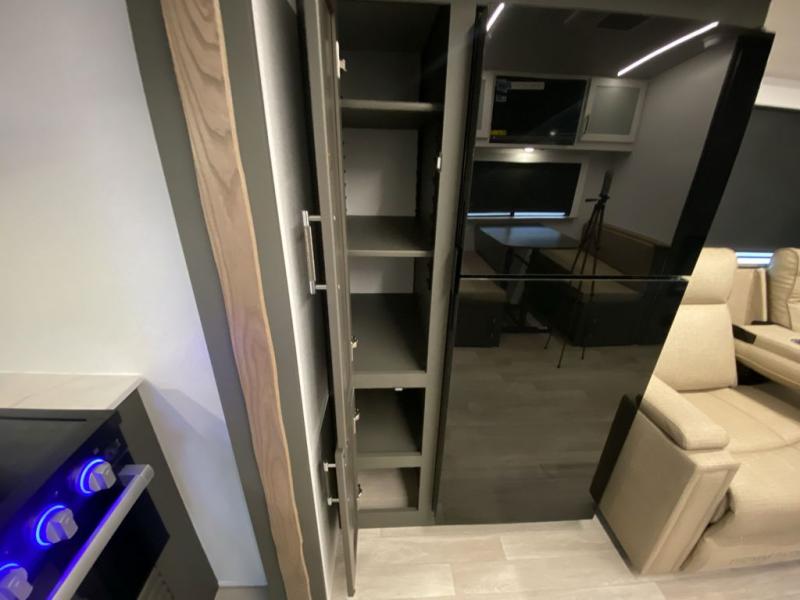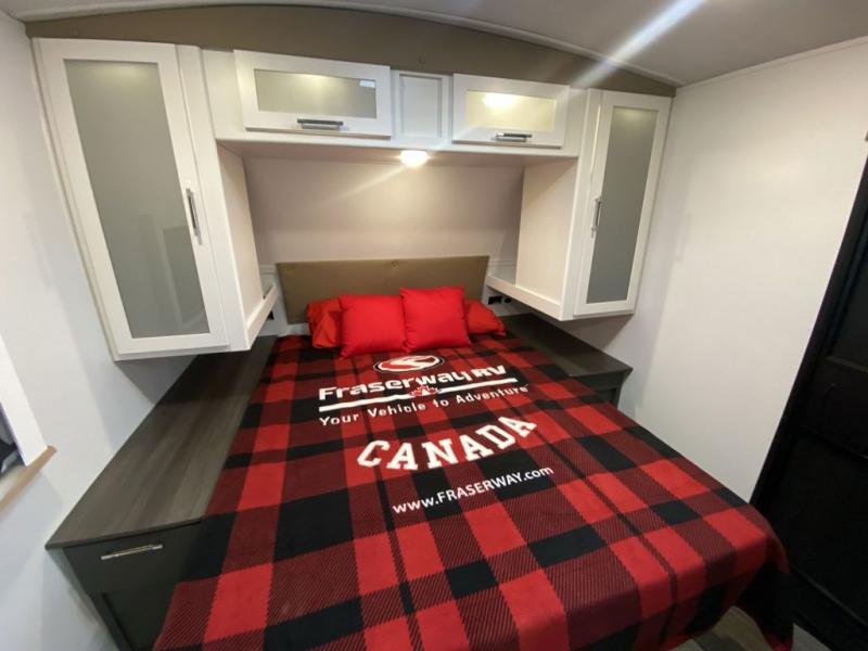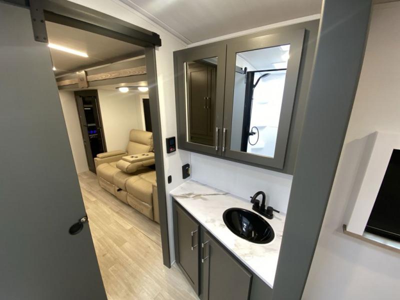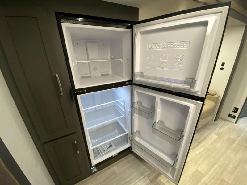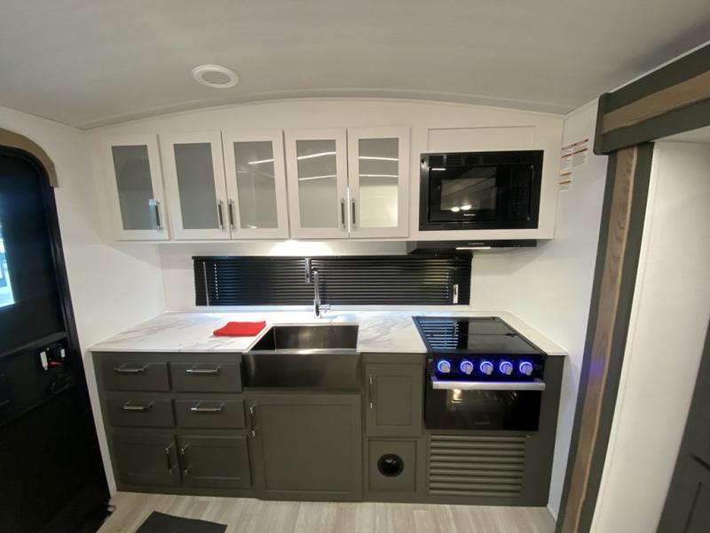 One step inside this dual entry travel trailer and you'll be sold! The rear kitchen features ample counter space to prep meals, and the booth dinette provides a place to dine together. There is also an outdoor kitchen with a griddle and mini fridge plus a 19' awning if you want to cook and eat outdoors. Two pantries and a 12V refrigerator will let you keep food stocked, and the tri-fold sofa slide provides sleeping space for guests. A walk-thru bath will create a front master bedroom you are sure to love, complete with a queen bed plus dual nightstands and dual wardrobes to keep everything tidy!