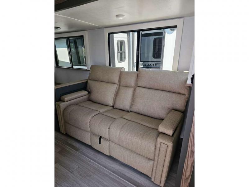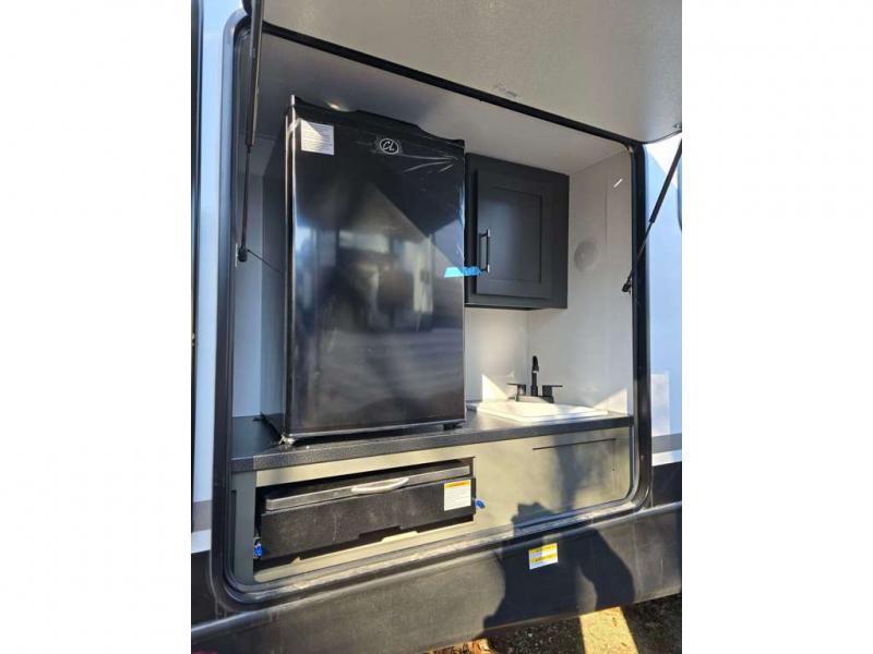 Enjoy camping with your family in this travel trailer that is perfect for a couple or a family of four. You will appreciate the private bedroom with wide entry including space saving sliding doors. The bedroom features a queen bed and wardrobes on either side to keep your clothes tidy. There is also a large pass-thru storage compartment beneath the front bedroom for your outdoor gear and more. A large slide features a Do-More dinette and 68" tri-fold sofa that is great for relaxing during the day, and can easily be transformed for more sleeping space at night. Or, you could opt. for the free standing dinette with chairs if you do not prefer booth style seating and/or do not need the added option of more sleeping space. A large rear bath features a radius shower and linen storage, plus a vanity with sink and toilet. And, the chef can choose to cook inside or outside with the outdoor kitchen that includes a Capital grill, 4.4 cu. ft. refrigerator as well as a sink all tucked under the 21' awning.