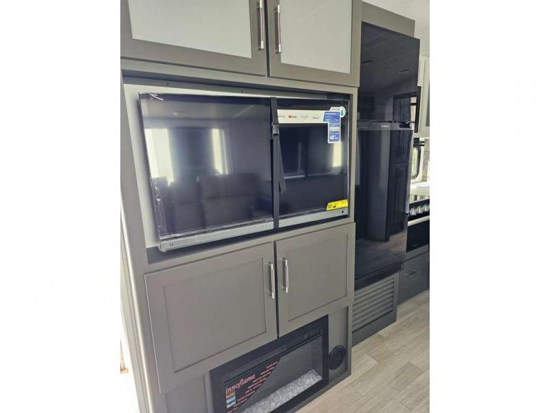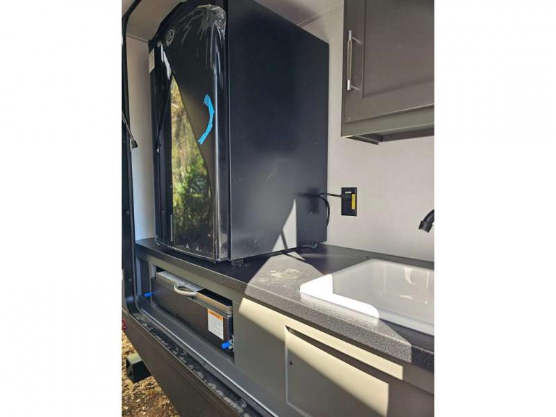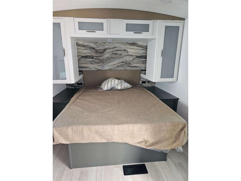 Enjoy camping with your family in this travel trailer that is perfect for a couple or a family of four. You will appreciate the private bedroom with wide entry including space saving sliding doors. The bedroom features a queen bed and wardrobes on either side to keep your clothes tidy. There is also a large pass-thru storage compartment beneath the front bedroom for your outdoor gear and more. A large slide features a Do-More dinette and 68" tri-fold sofa that is great for relaxing during the day, and can easily be transformed for more sleeping space at night. Or, you could opt. for the free standing dinette with chairs if you do not prefer booth style seating and/or do not need the added option of more sleeping space. A large rear bath features a radius shower and linen storage, plus a vanity with sink and toilet. And, the chef can choose to cook inside or outside with the outdoor kitchen that includes a Capital grill, 4.4 cu. ft. refrigerator as well as a sink all tucked under the 21' awning.