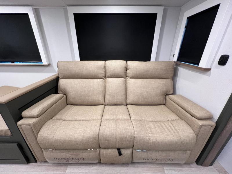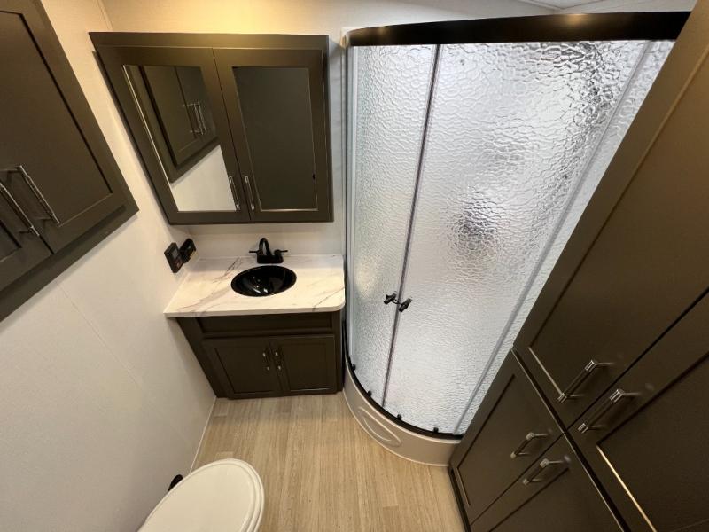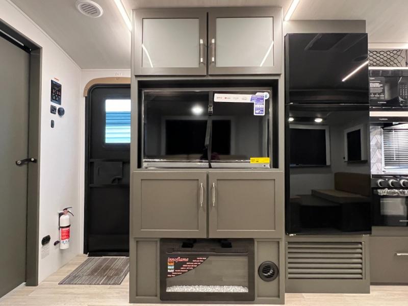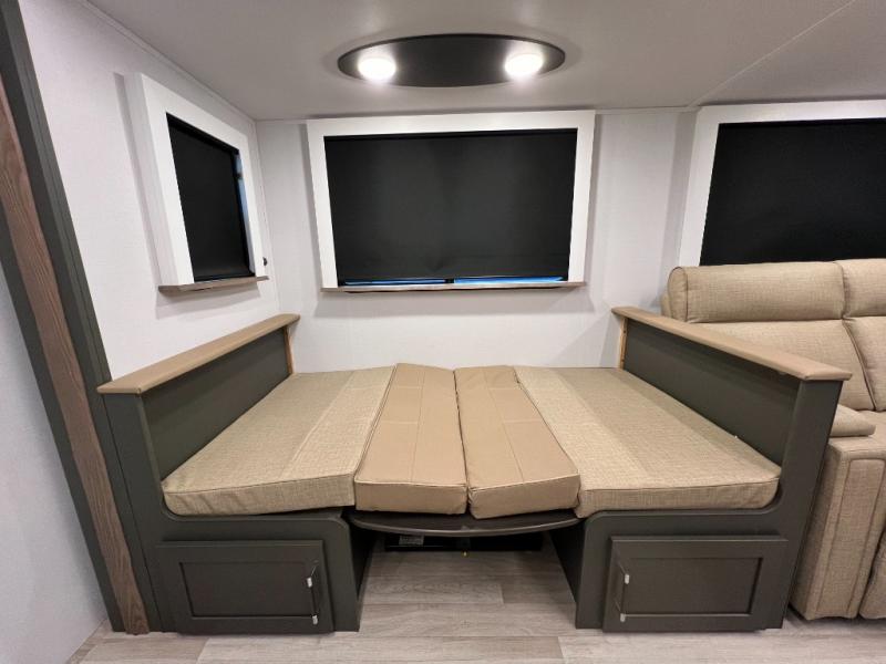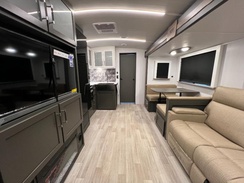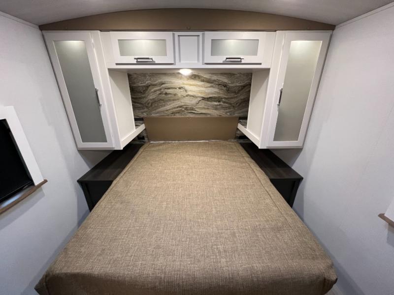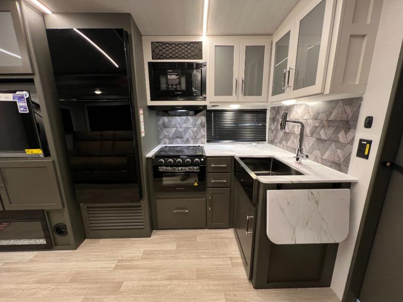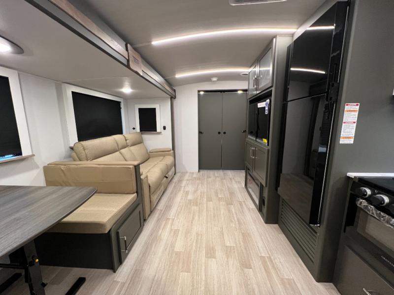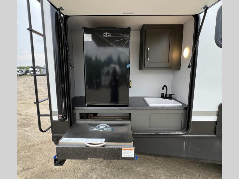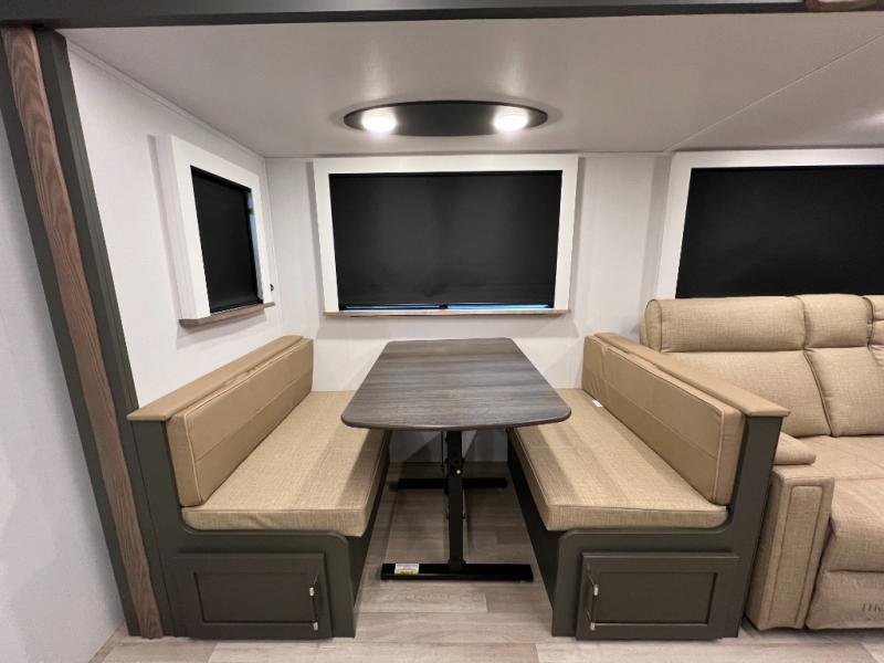 Enjoy camping with your family in this travel trailer that is perfect for a couple or a family of four. You will appreciate the private bedroom with wide entry including space saving sliding doors. The bedroom features a queen bed and wardrobes on either side to keep your clothes tidy. There is also a large pass-thru storage compartment beneath the front bedroom for your outdoor gear and more. A large slide features a Do-More dinette. Or, you could opt. for the free standing dinette with chairs if you do not prefer booth style seating and/or do not need the added option of more sleeping space. A large rear bath features a radius shower and linen storage, plus a vanity with sink and toilet. And, the chef can choose to cook inside or outside with the outdoor kitchen that includes a Capital grill, 4.4 cu. ft. refrigerator as well as a sink all tucked under the 21' awning.