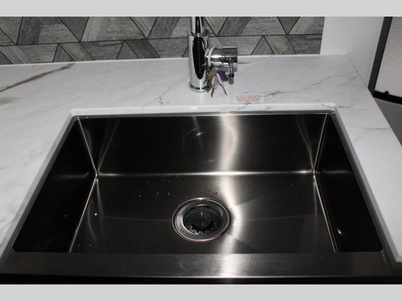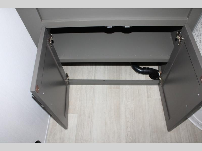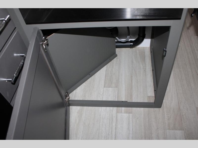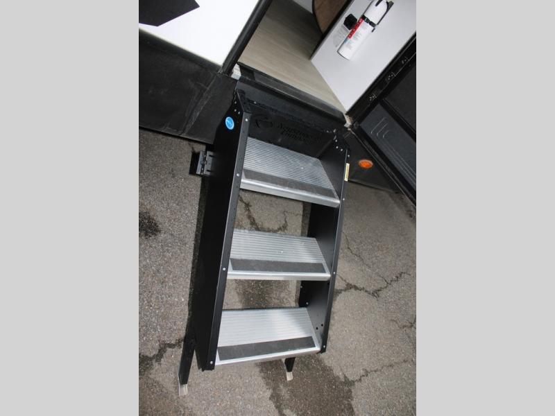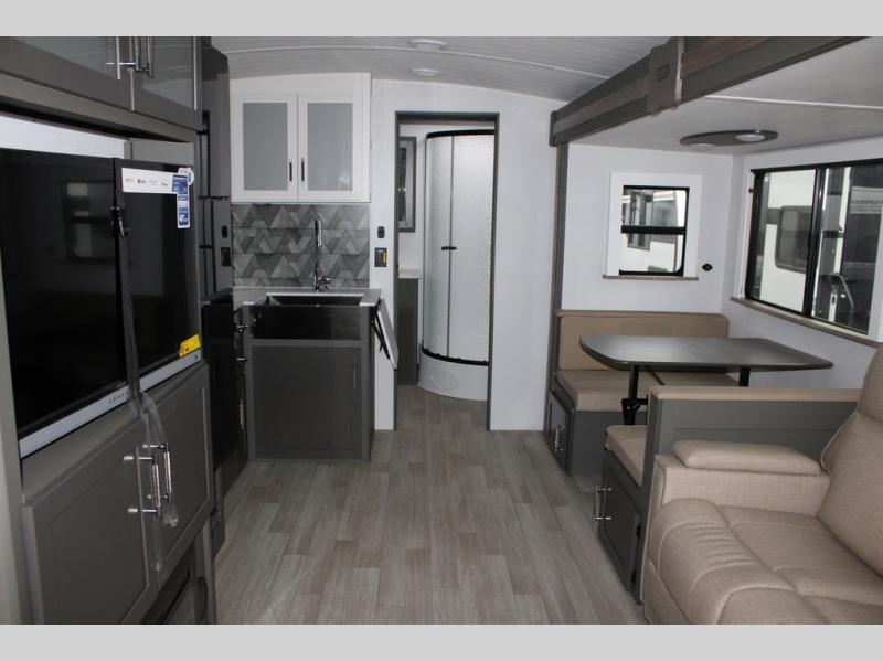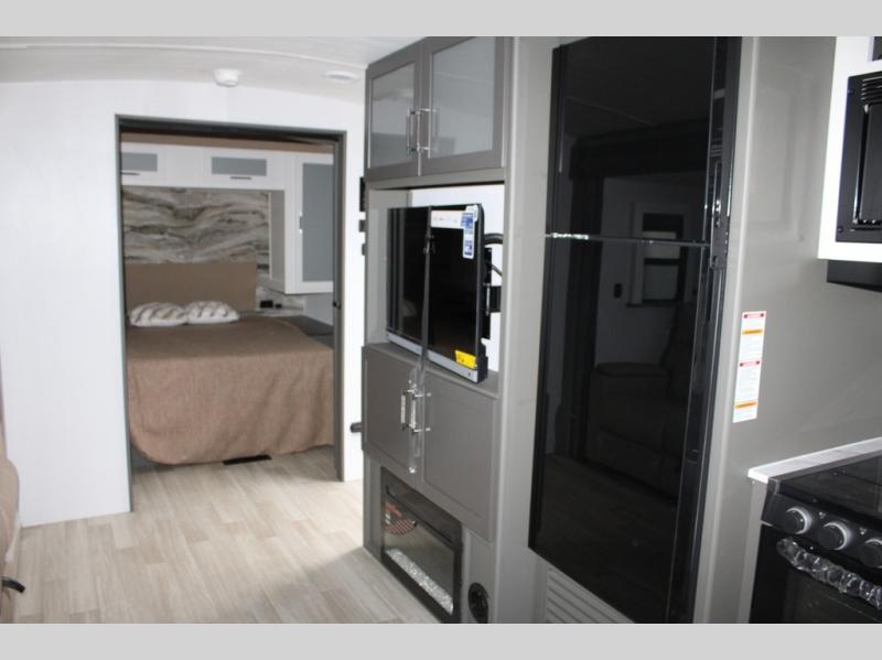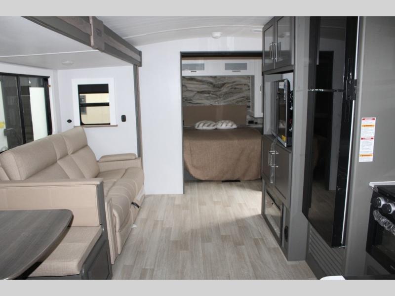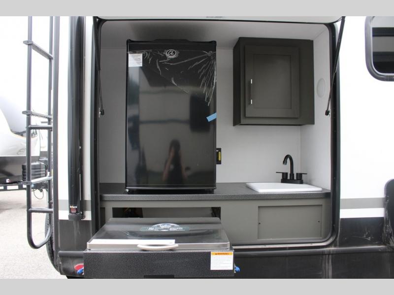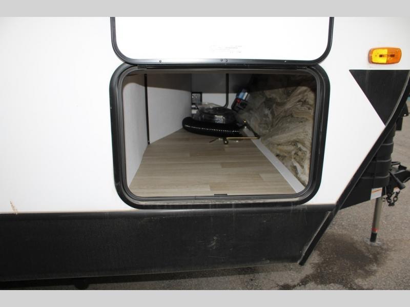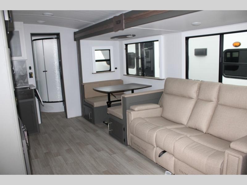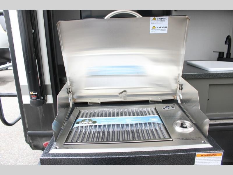 Enjoy camping with your family in this travel trailer that is perfect for a couple or a family of four. You will appreciate the private bedroom with wide entry including space saving sliding doors. The bedroom features a queen bed and wardrobes on either side to keep your clothes tidy. There is also a large pass-thru storage compartment beneath the front bedroom for your outdoor gear and more. A large slide features a Do-More dinette and 68" tri-fold sofa that is great for relaxing during the day, and can easily be transformed for more sleeping space at night. Or, you could opt. for the free standing dinette with chairs if you do not prefer booth style seating and/or do not need the added option of more sleeping space. A large rear bath features a radius shower and linen storage, plus a vanity with sink and toilet. And, the chef can choose to cook inside or outside with the outdoor kitchen that includes a Capital grill, 4.4 cu. ft. refrigerator as well as a sink all tucked under the 21' awning.