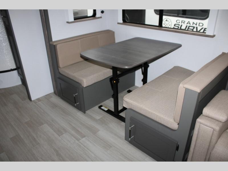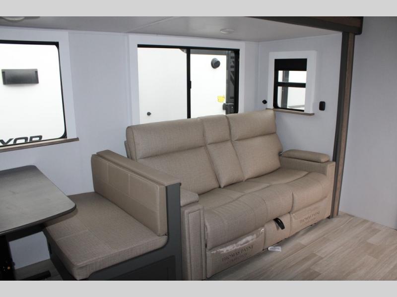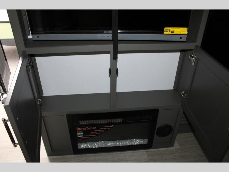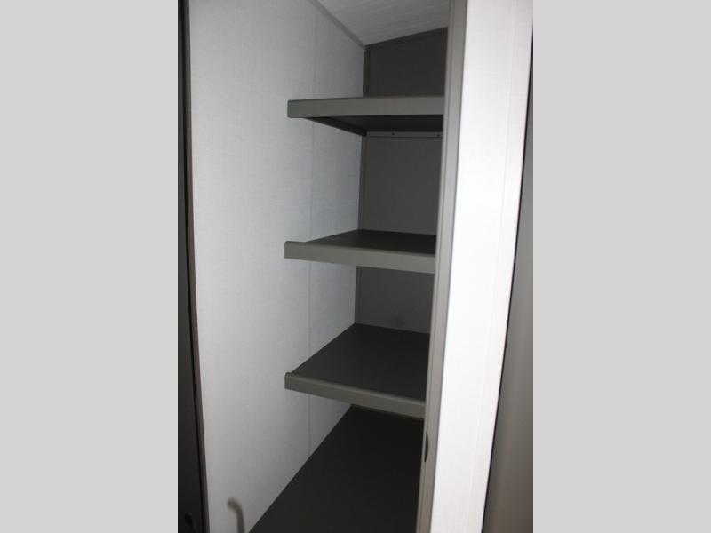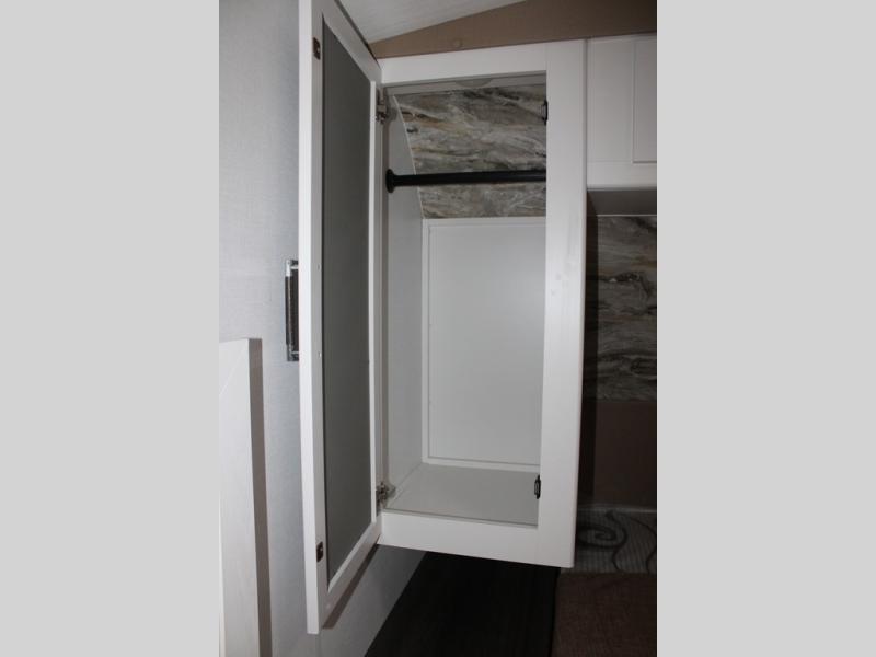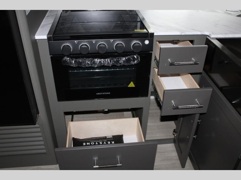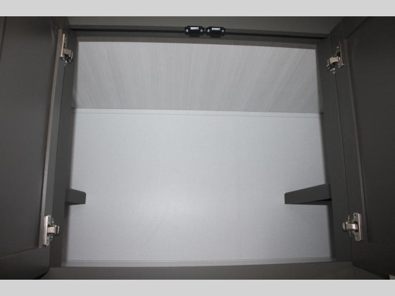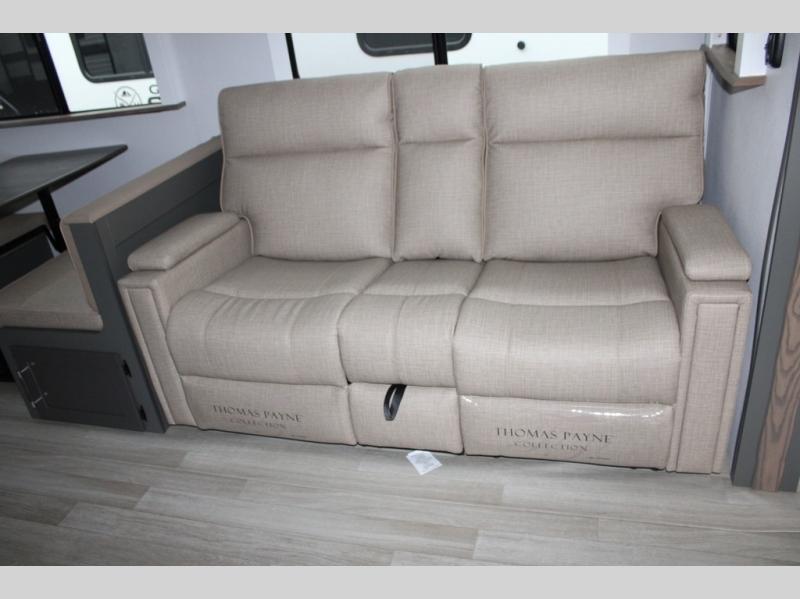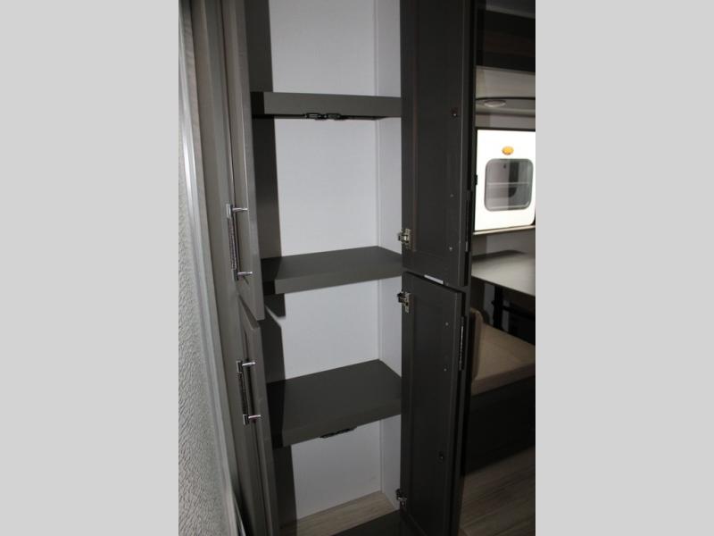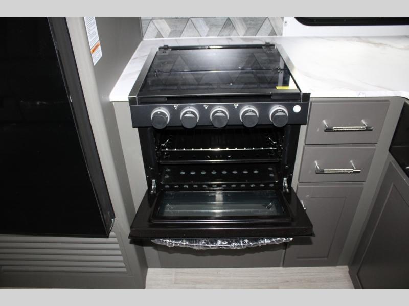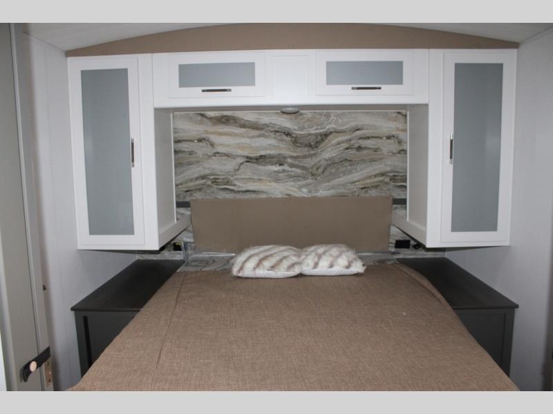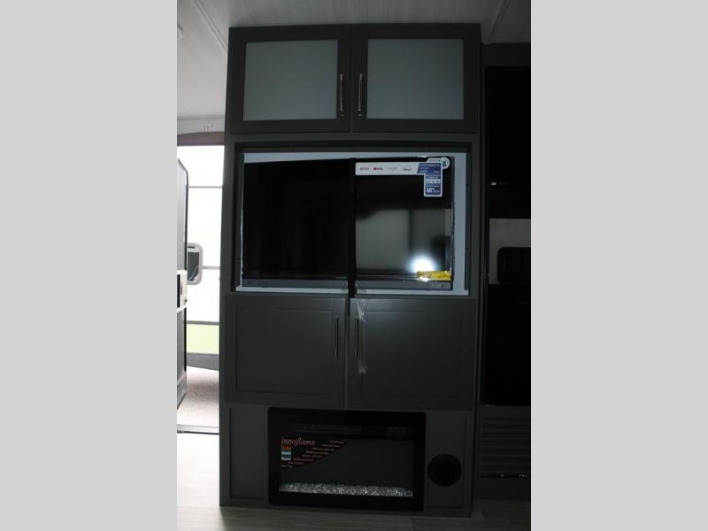 Enjoy camping with your family in this travel trailer that is perfect for a couple or a family of four. You will appreciate the private bedroom with wide entry including space saving sliding doors. The bedroom features a queen bed and wardrobes on either side to keep your clothes tidy. There is also a large pass-thru storage compartment beneath the front bedroom for your outdoor gear and more. A large slide features a Do-More dinette and 68" tri-fold sofa that is great for relaxing during the day, and can easily be transformed for more sleeping space at night. Or, you could opt. for the free standing dinette with chairs if you do not prefer booth style seating and/or do not need the added option of more sleeping space. A large rear bath features a radius shower and linen storage, plus a vanity with sink and toilet. And, the chef can choose to cook inside or outside with the outdoor kitchen that includes a Capital grill, 4.4 cu. ft. refrigerator as well as a sink all tucked under the 21' awning.