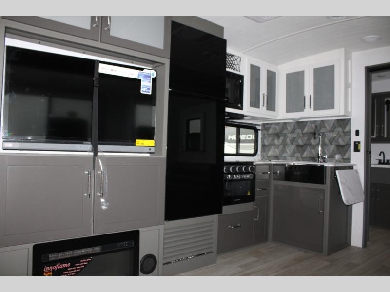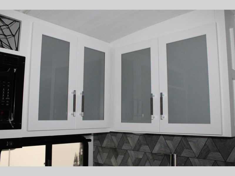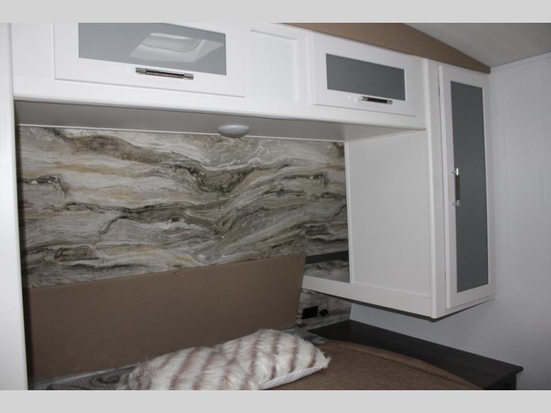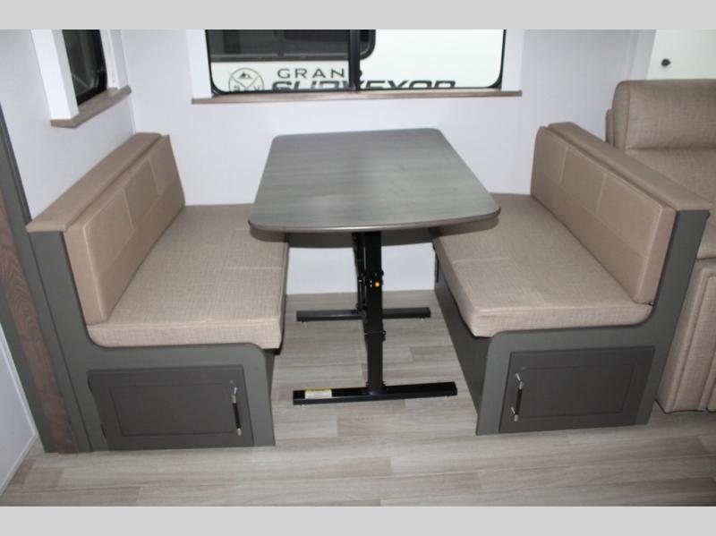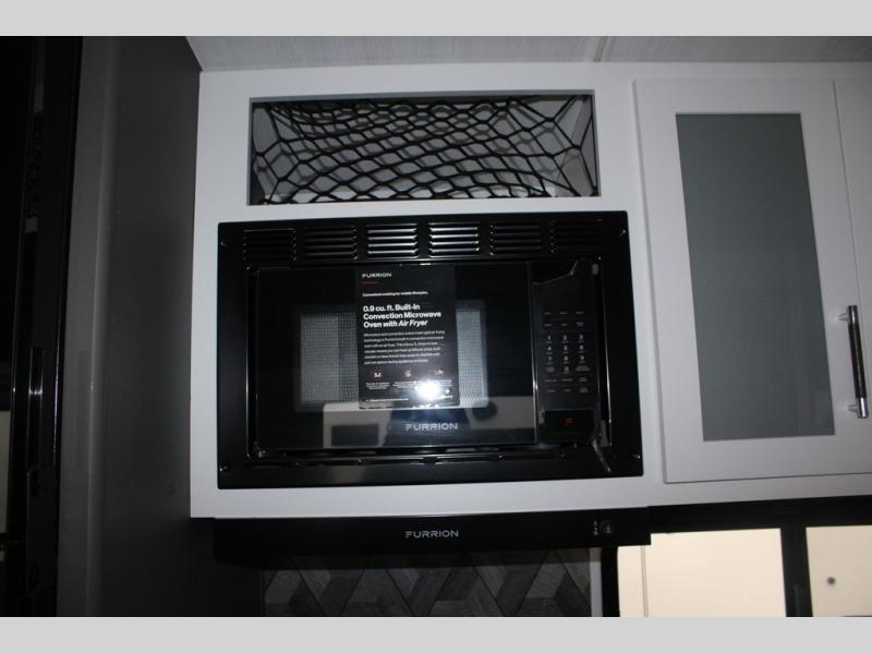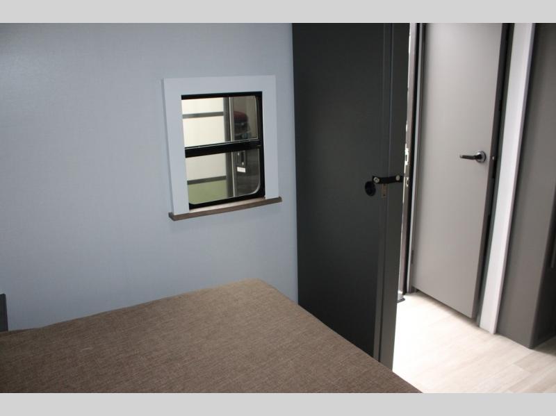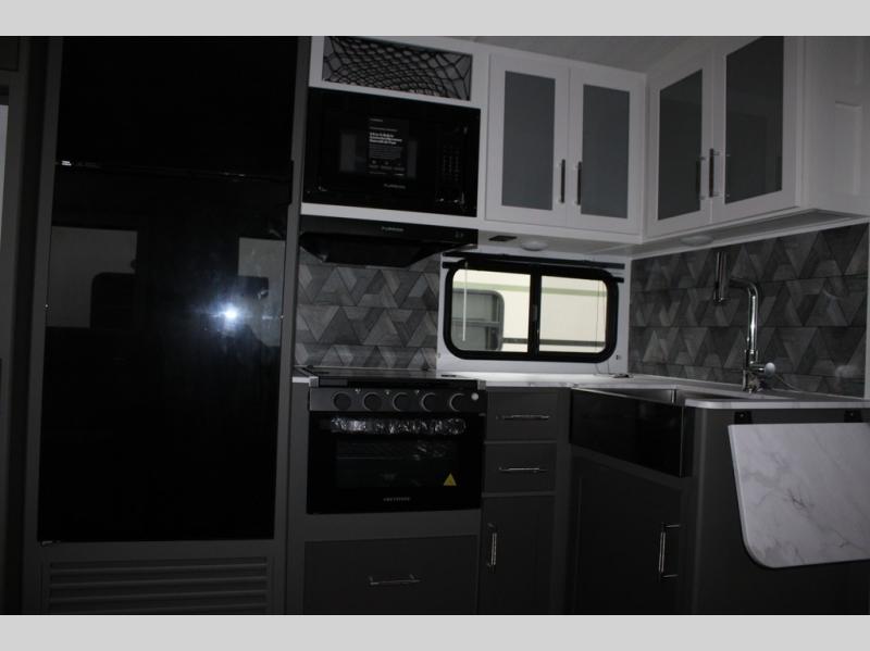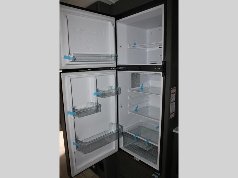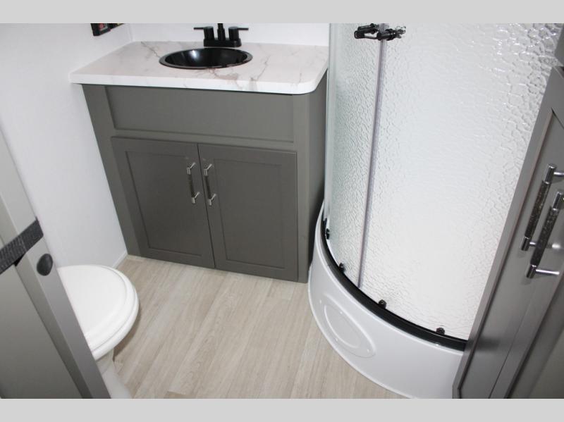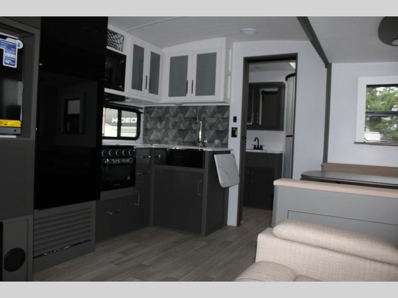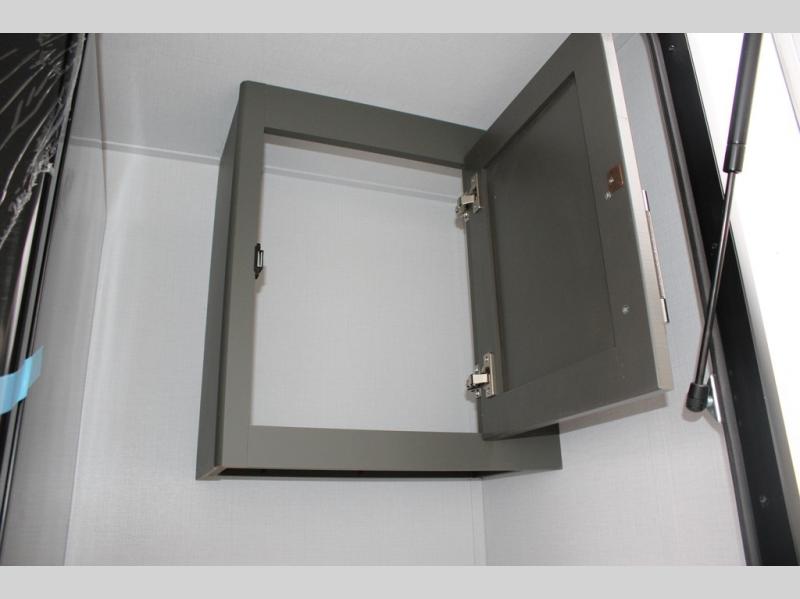 Enjoy camping with your family in this travel trailer that is perfect for a couple or a family of four. You will appreciate the private bedroom with wide entry including space saving sliding doors. The bedroom features a queen bed and wardrobes on either side to keep your clothes tidy. There is also a large pass-thru storage compartment beneath the front bedroom for your outdoor gear and more. A large slide features a Do-More dinette and 68" tri-fold sofa that is great for relaxing during the day, and can easily be transformed for more sleeping space at night. Or, you could opt. for the free standing dinette with chairs if you do not prefer booth style seating and/or do not need the added option of more sleeping space. A large rear bath features a radius shower and linen storage, plus a vanity with sink and toilet. And, the chef can choose to cook inside or outside with the outdoor kitchen that includes a Capital grill, 4.4 cu. ft. refrigerator as well as a sink all tucked under the 21' awning.