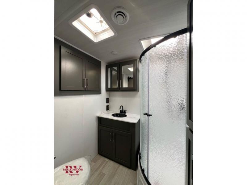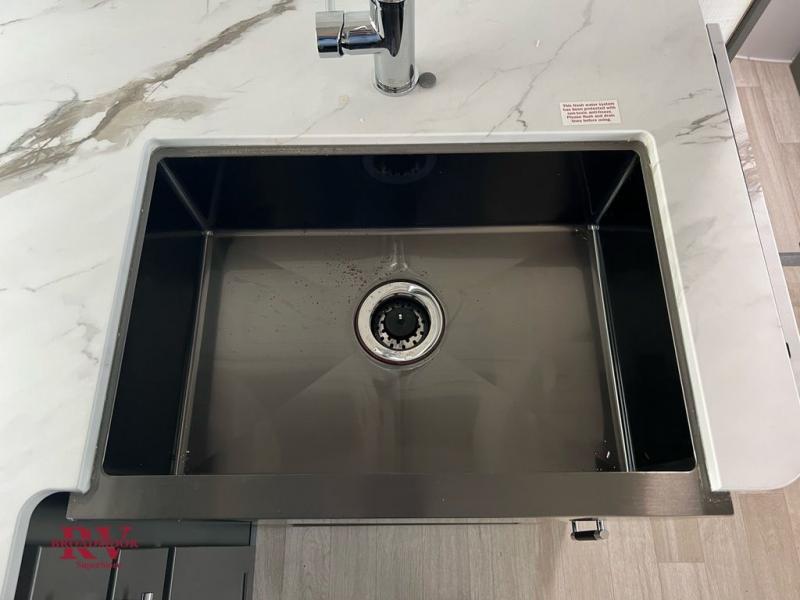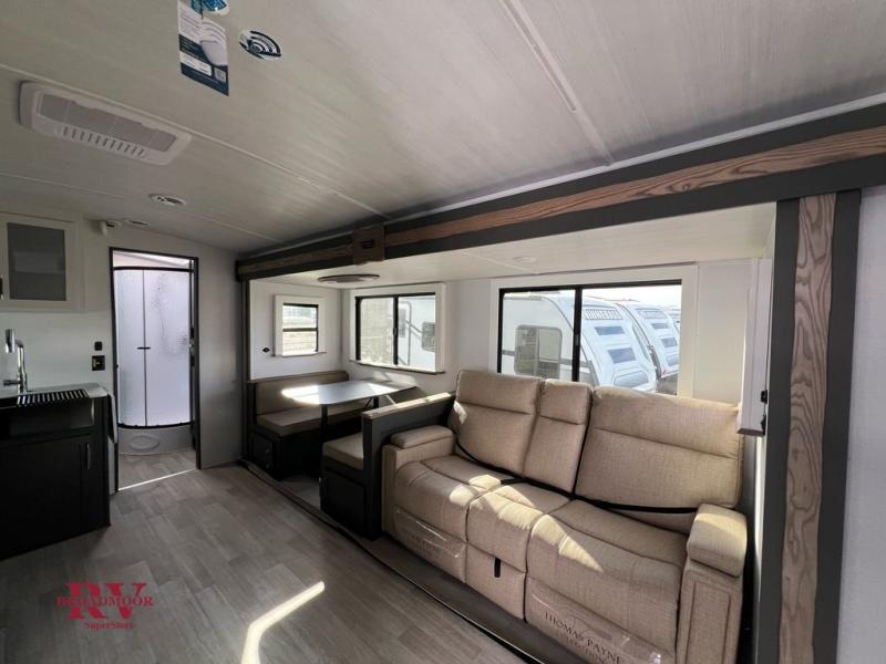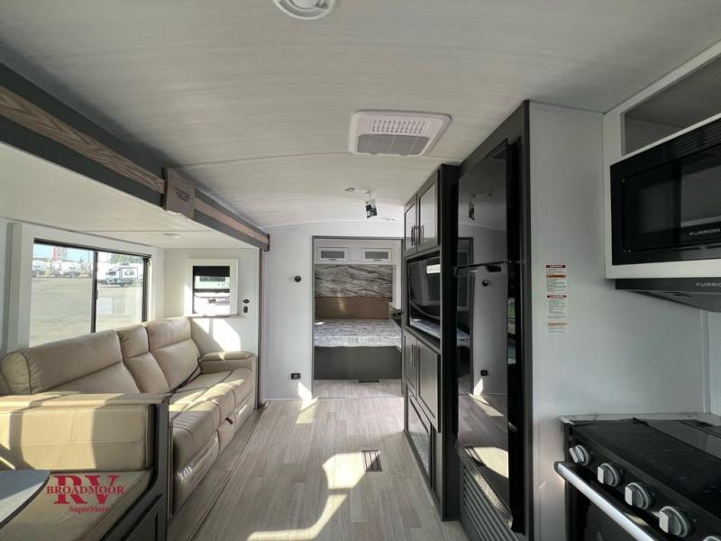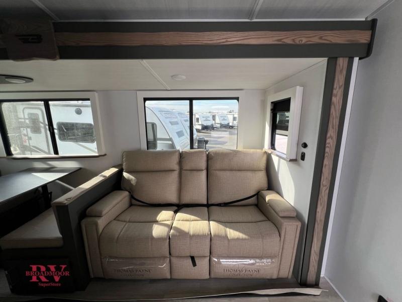 Enjoy camping with your family in this travel trailer that is perfect for a couple or a family of four. You will appreciate the private bedroom with wide entry including space saving sliding doors. The bedroom features a queen bed and wardrobes on either side to keep your clothes tidy. There is also a large pass-thru storage compartment beneath the front bedroom for your outdoor gear and more. A large slide features a Do-More dinette and 68" tri-fold sofa that is great for relaxing during the day, and can easily be transformed for more sleeping space at night. Or, you could opt. for the free standing dinette with chairs if you do not prefer booth style seating and/or do not need the added option of more sleeping space. A large rear bath features a radius shower and linen storage, plus a vanity with sink and toilet. And, the chef can choose to cook inside or outside with the outdoor kitchen that includes a Capital grill, 4.4 cu. ft. refrigerator as well as a sink all tucked under the 21' awning.