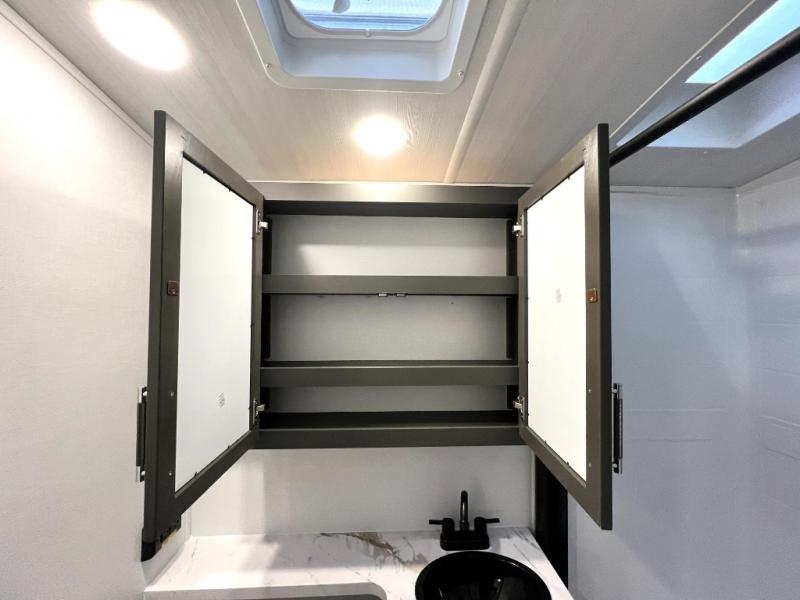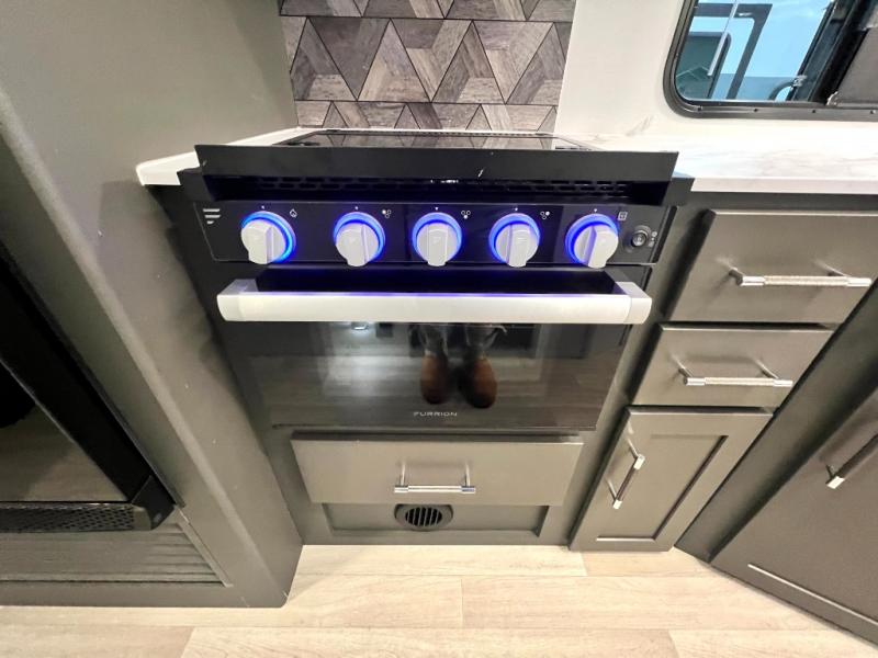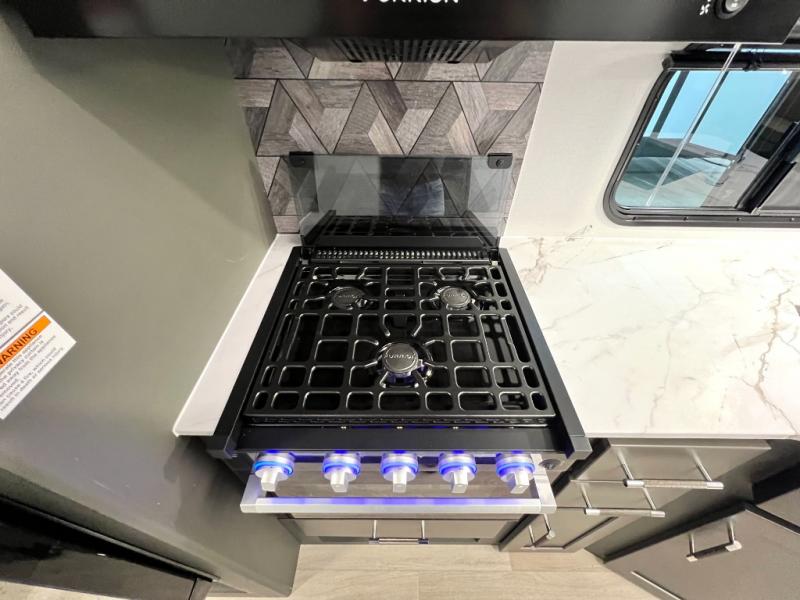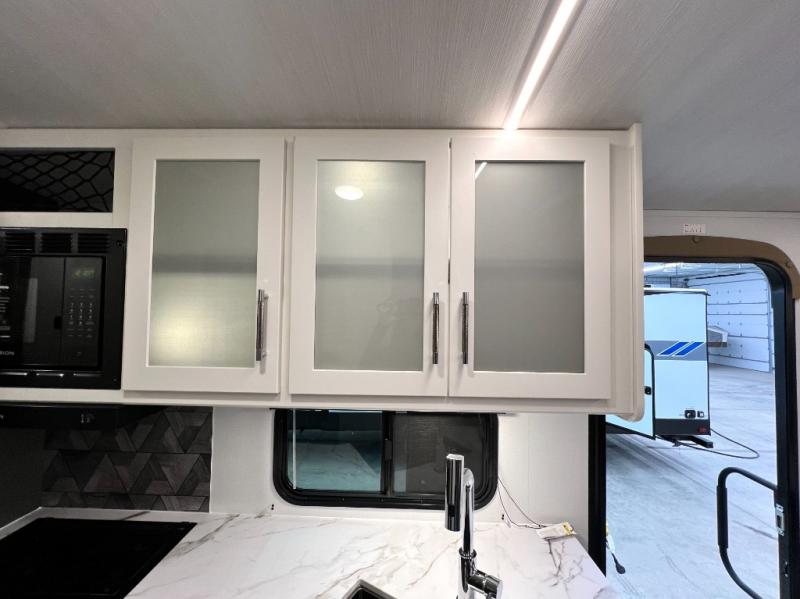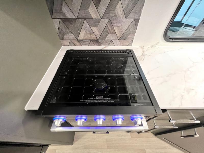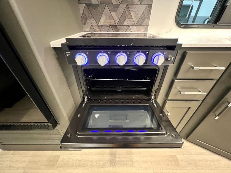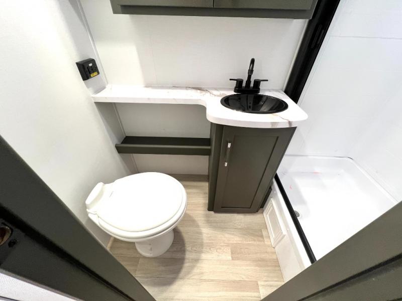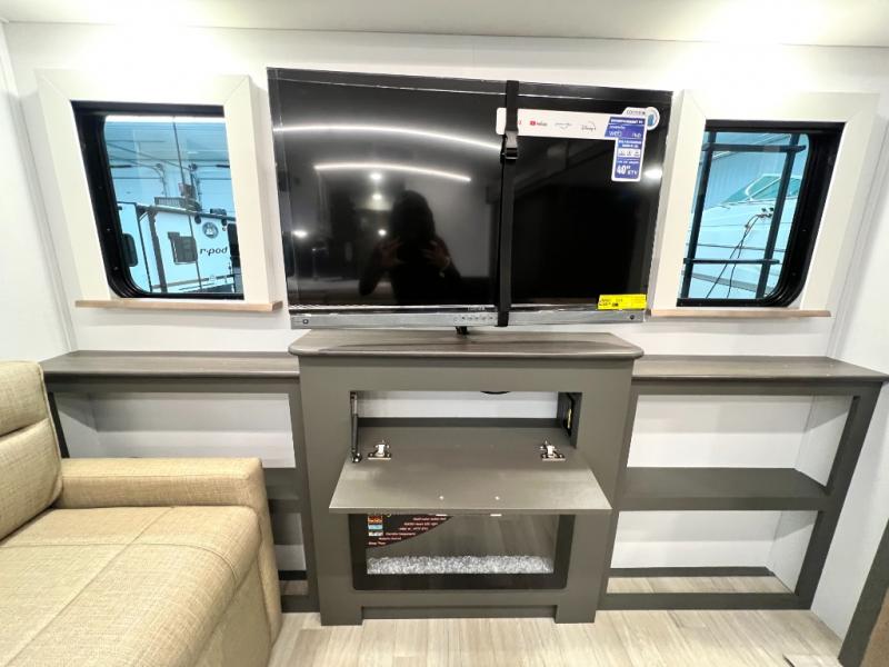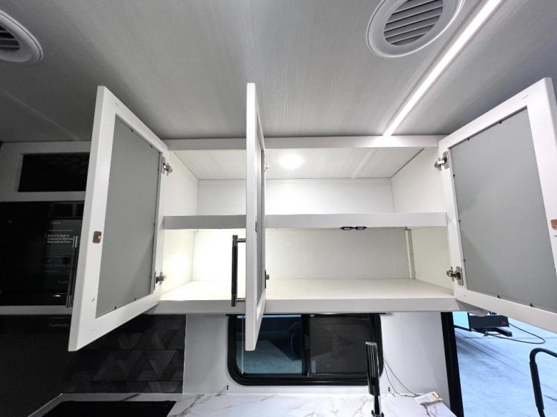 Inside, you’ll love the open layout with a rear entertainment center, perfect for movie nights or relaxing after a long hike. The private front bedroom features a queen bed for restful sleep, while the well-equipped kitchen — complete with 3-burner range, 12V refrigerator, and large pantry — keeps your family fueled for adventure.