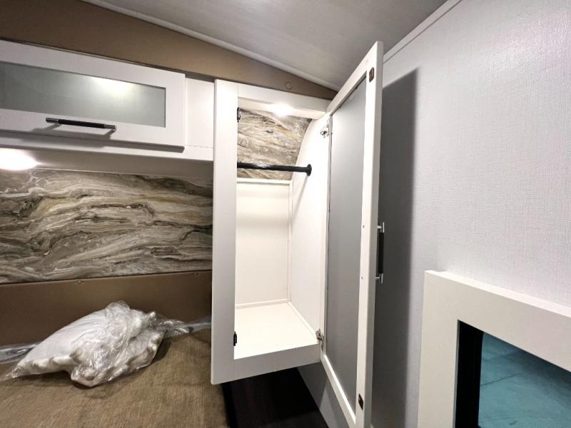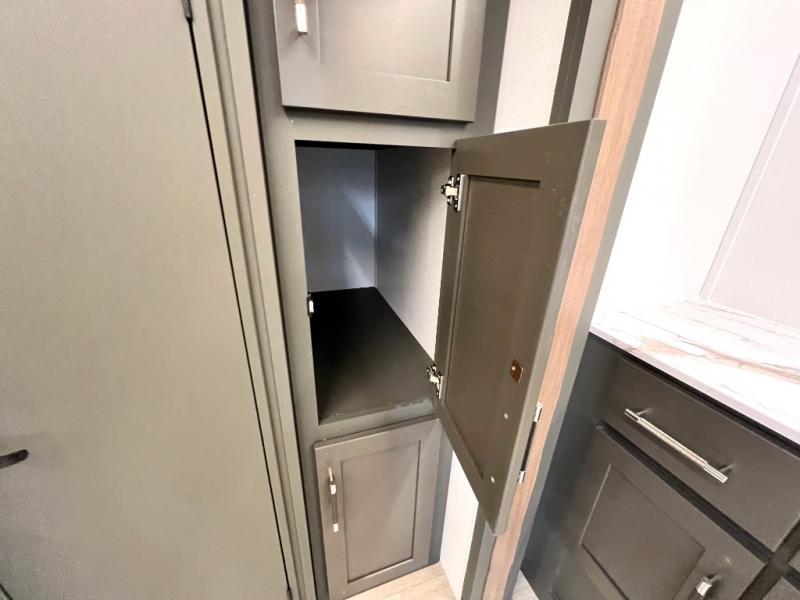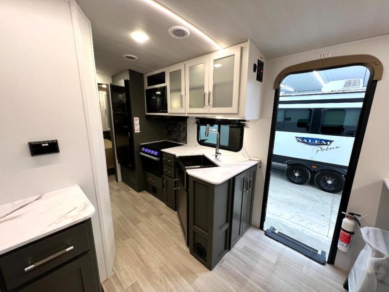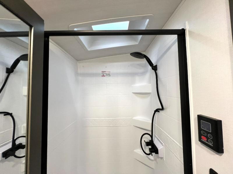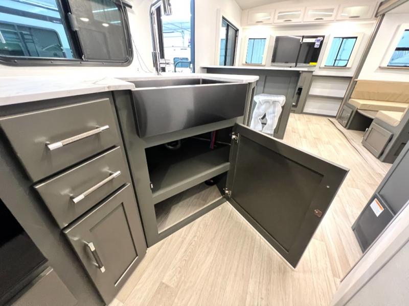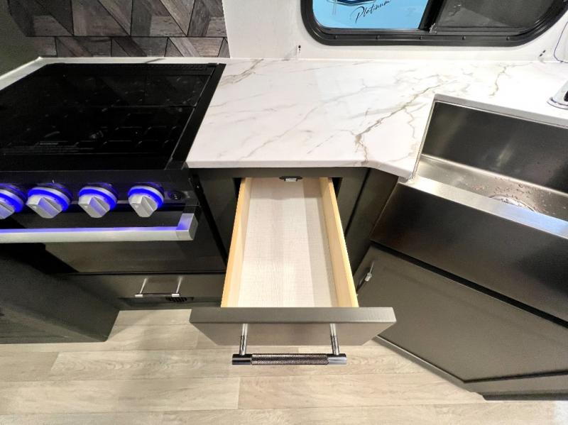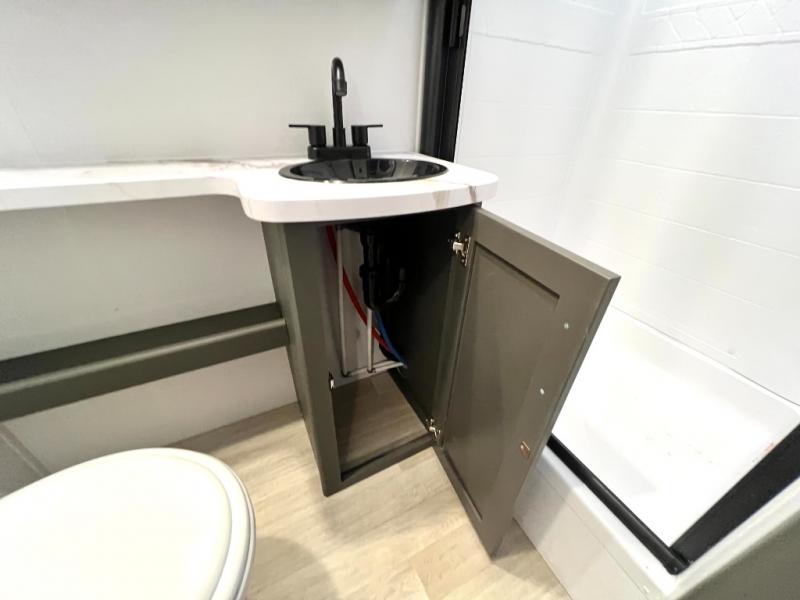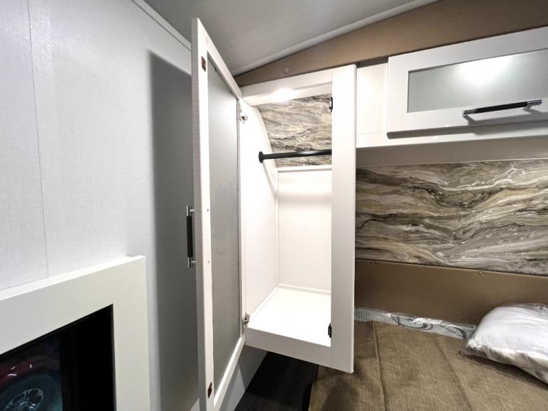 Inside, you’ll love the open layout with a rear entertainment center, perfect for movie nights or relaxing after a long hike. The private front bedroom features a queen bed for restful sleep, while the well-equipped kitchen — complete with 3-burner range, 12V refrigerator, and large pantry — keeps your family fueled for adventure.