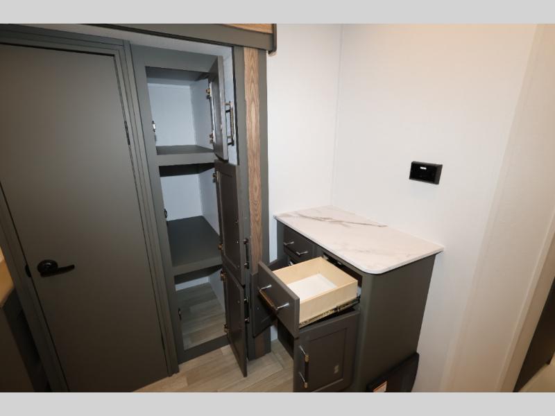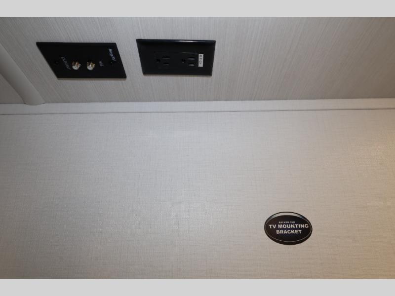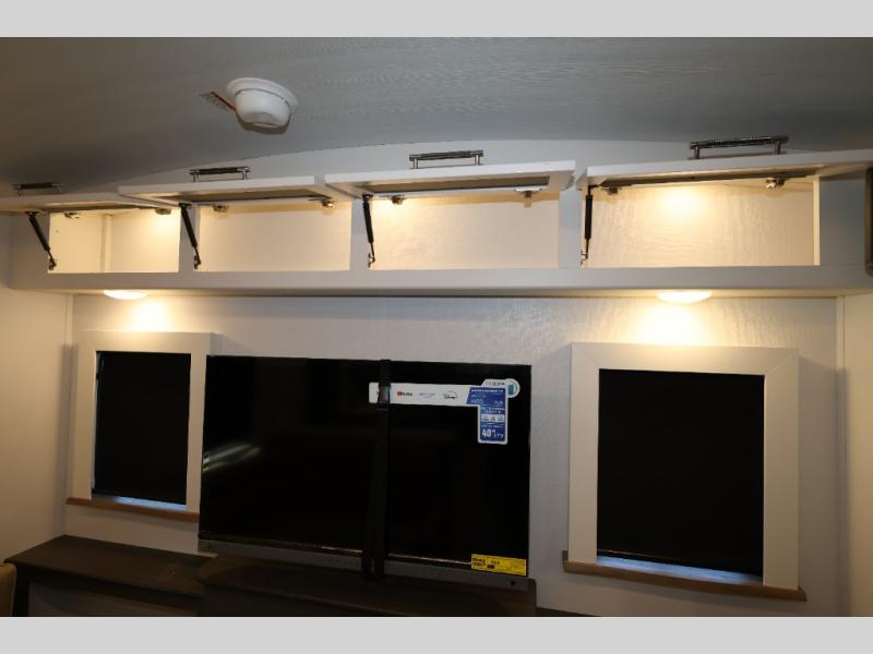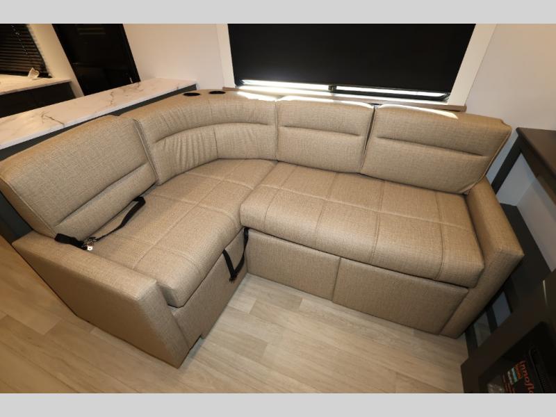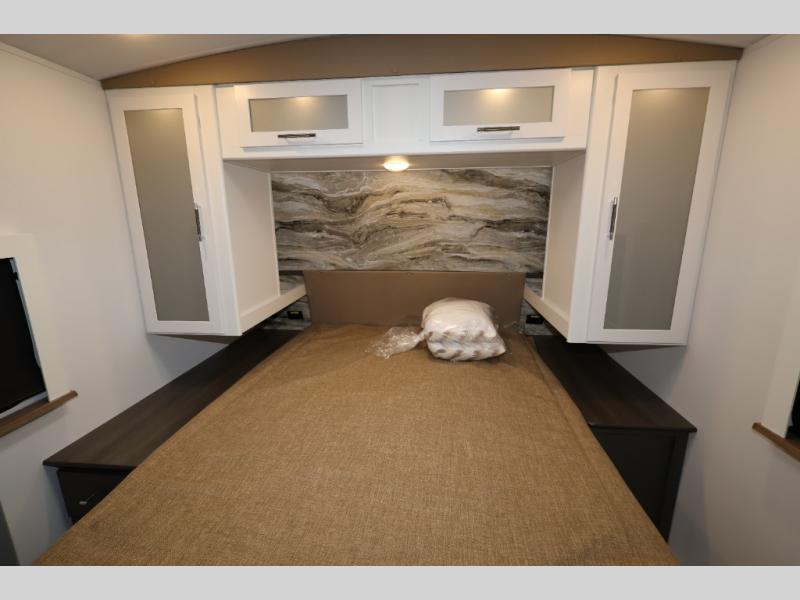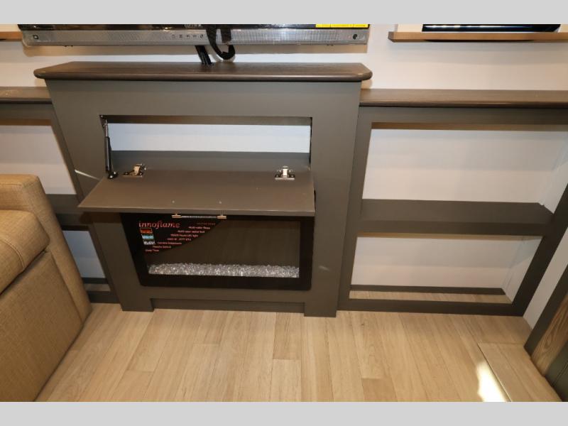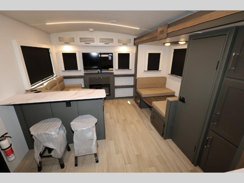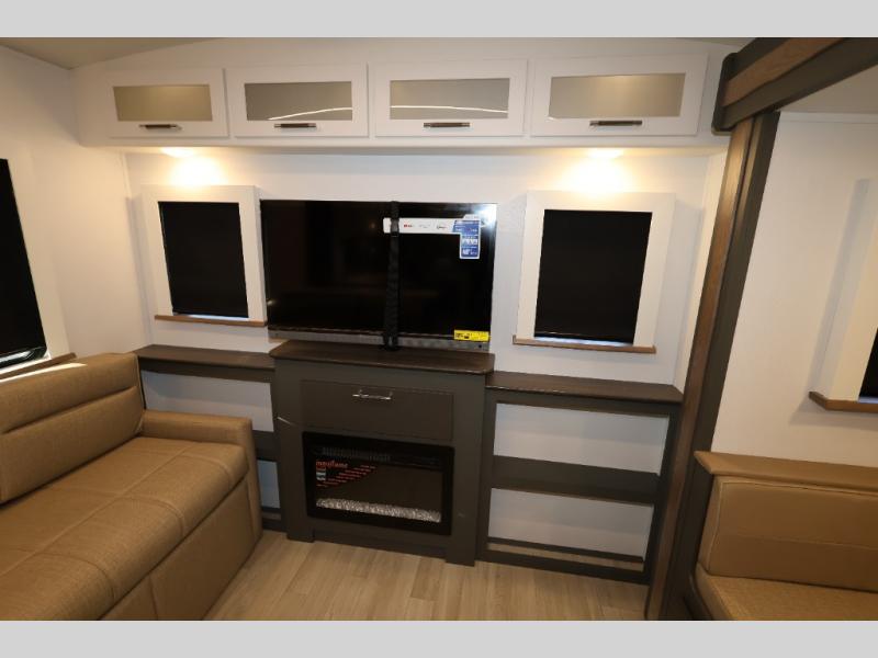 Choose your favorite campsite and head out for fun adventures in this dual axle travel trailer! You can unload the pass-thru storage once you arrive, then put out the 19' awning and head inside to make lunch on the three burner range. There is also a 12V refrigerator and a large pantry for food storage. A booth dinette and a breakfast bar with two stools provide a place to enjoy meals together, and the L-shaped sectional sofa in the back will be perfect for relaxing. And the rear entertainment center with a fireplace is sure to make you feel right at home. When you're ready for bed, a queen bed in the front private bedroom will be waiting for you!