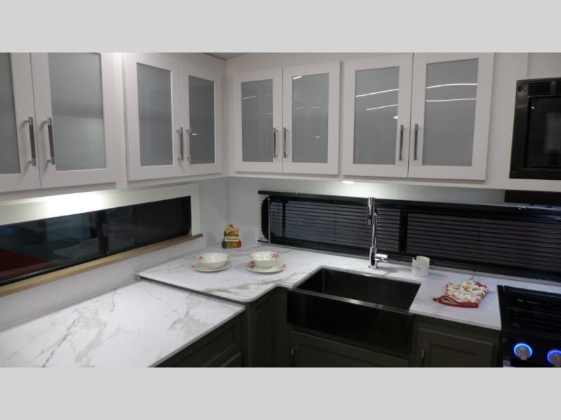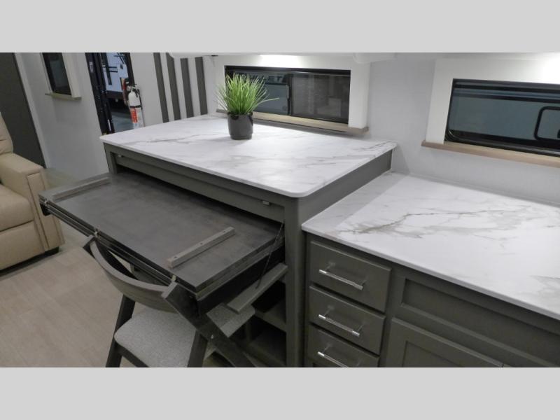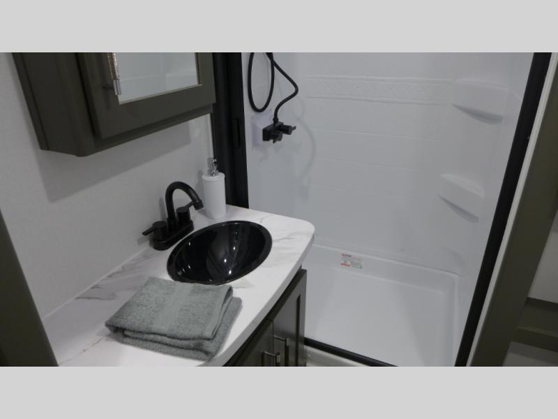 You'll enjoy the added space in this travel trailer thanks to the large slide out that houses the theater seating, pantry, and 12V refrigerator. And the 12V TV is in direct view so you can watch movies in the evenings. If you have guests staying over, they can sleep on the tri-fold sofa, while you take the queen bed in the front private bedroom. A rear kitchen includes extended counter space to prep meals, or you can use the outdoor kitchen with a mini fridge and griddle. The pull-out dinette table provides a place to dine together, or you can sit outdoors under the 19' awning. There is even an exterior TV here for added convenience!