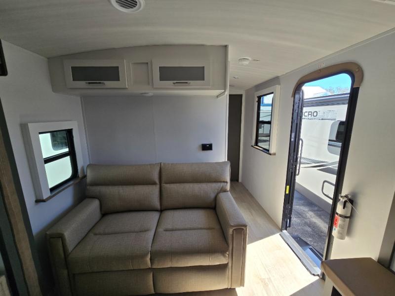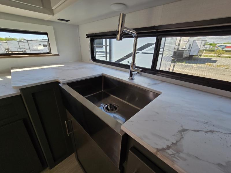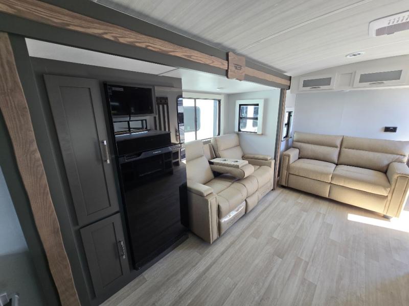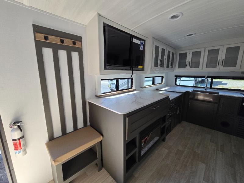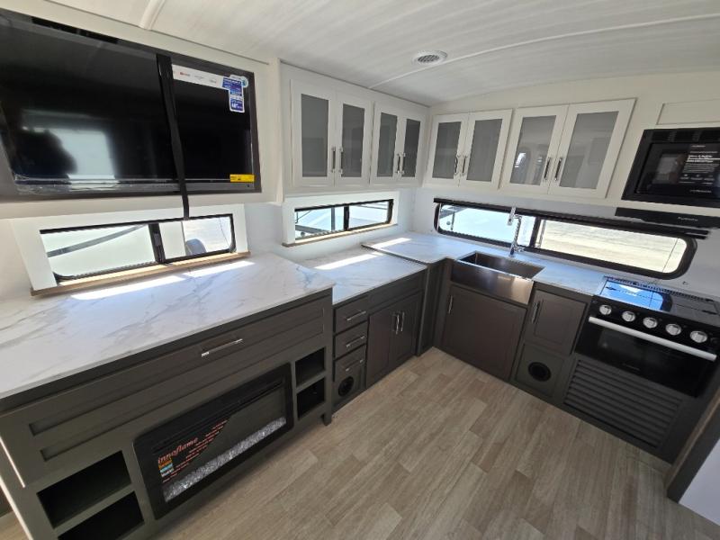 You'll enjoy the added space in this travel trailer thanks to the large slide out that houses the theater seating, pantry, and 12V refrigerator. And the 12V TV is in direct view so you can watch movies in the evenings. If you have guests staying over, they can sleep on the tri-fold sofa, while you take the queen bed in the front private bedroom. A rear kitchen includes extended counter space to prep meals, or you can use the outdoor kitchen with a mini fridge and griddle. The pull-out dinette table provides a place to dine together, or you can sit outdoors under the 19' awning. There is even an exterior TV here for added convenience!