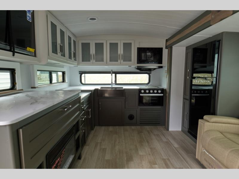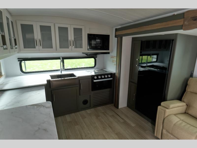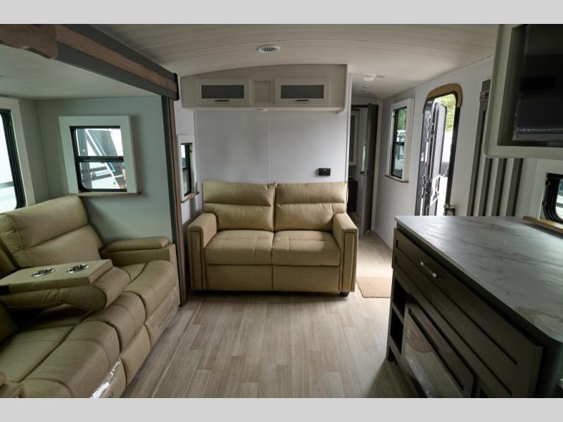 You'll enjoy the added space in this travel trailer thanks to the large slide out that houses the theater seating, pantry, and 12V refrigerator. And the 12V TV is in direct view so you can watch movies in the evenings. If you have guests staying over, they can sleep on the tri-fold sofa, while you take the queen bed in the front private bedroom. A rear kitchen includes extended counter space to prep meals, or you can use the outdoor kitchen with a mini fridge and griddle. The pull-out dinette table provides a place to dine together, or you can sit outdoors under the 19' awning. There is even an exterior TV here for added convenience!