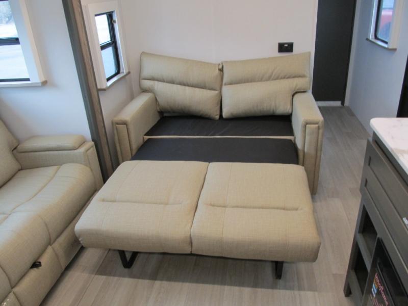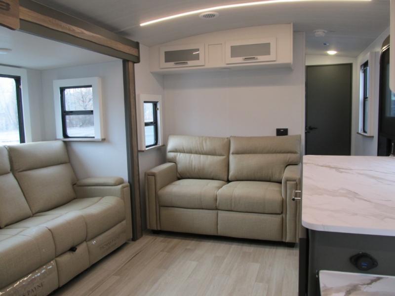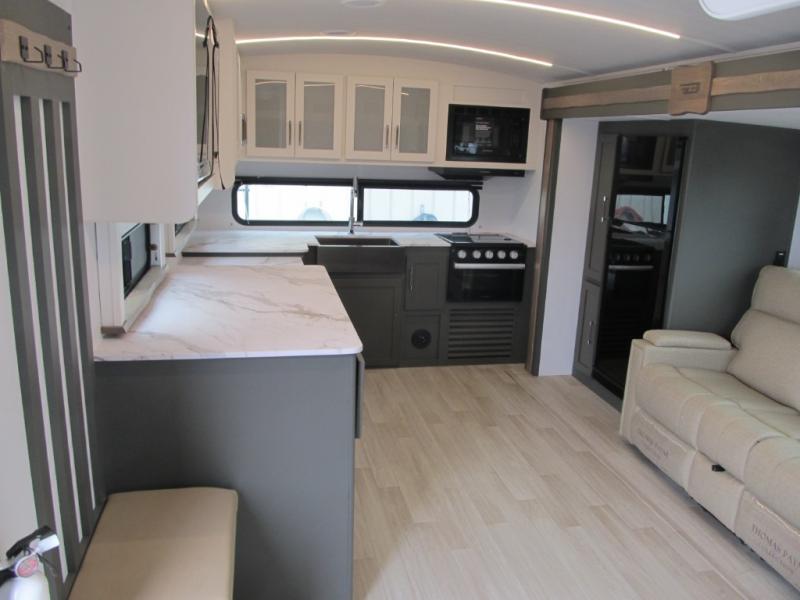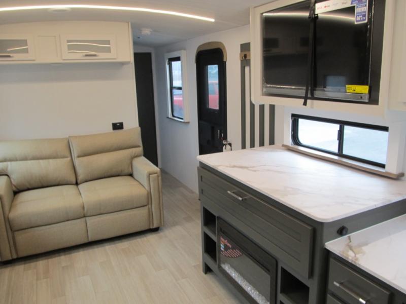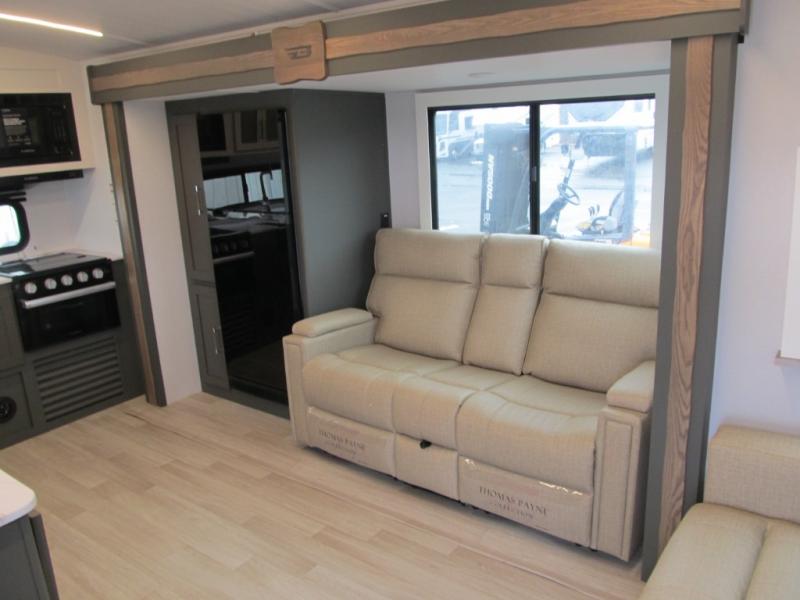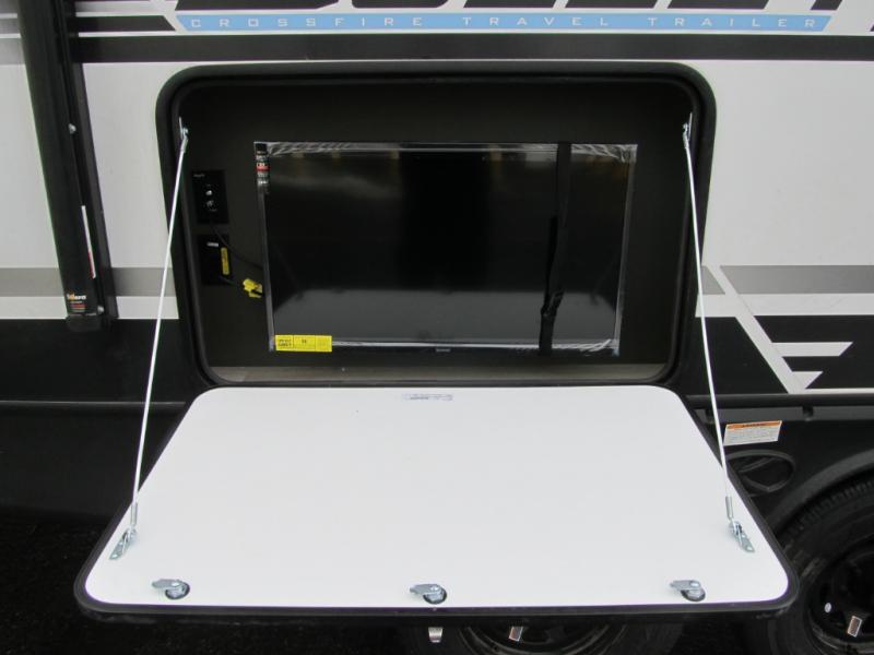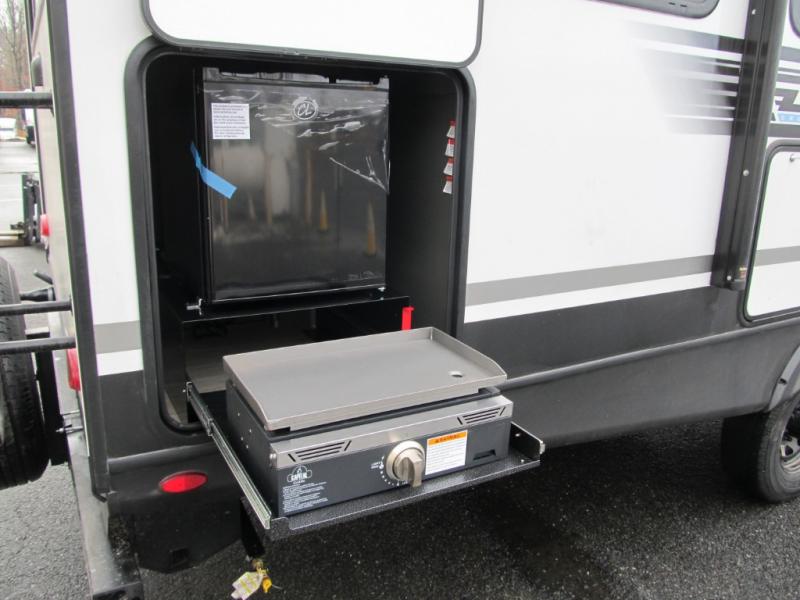 You'll enjoy the added space in this travel trailer thanks to the large slide out that houses the theater seating, pantry, and 12V refrigerator. And the 12V TV is in direct view so you can watch movies in the evenings. If you have guests staying over, they can sleep on the tri-fold sofa, while you take the queen bed in the front private bedroom. A rear kitchen includes extended counter space to prep meals, or you can use the outdoor kitchen with a mini fridge and griddle. The pull-out dinette table provides a place to dine together, or you can sit outdoors under the 19' awning. There is even an exterior TV here for added convenience!