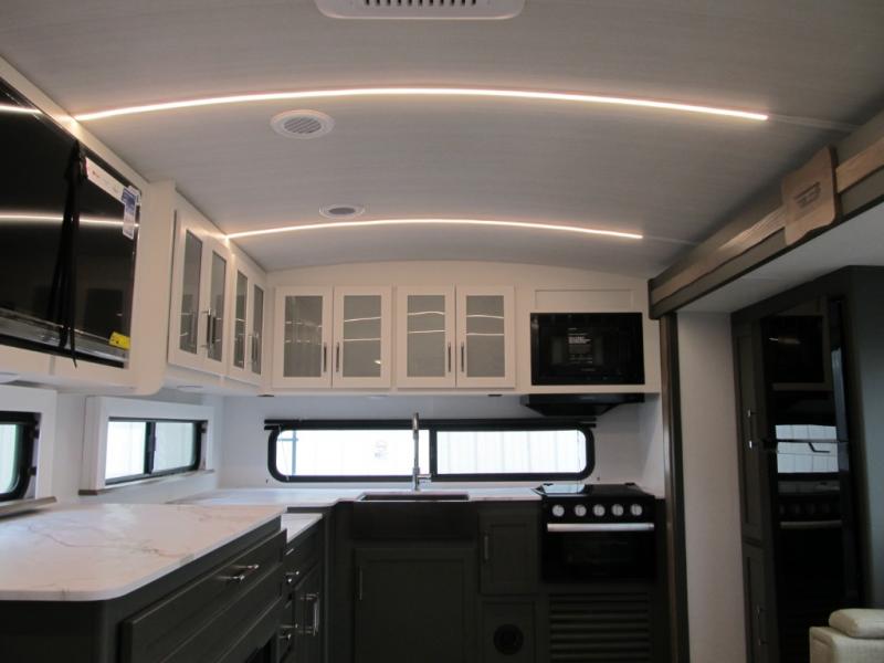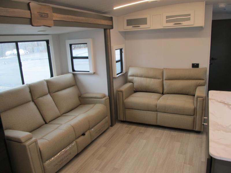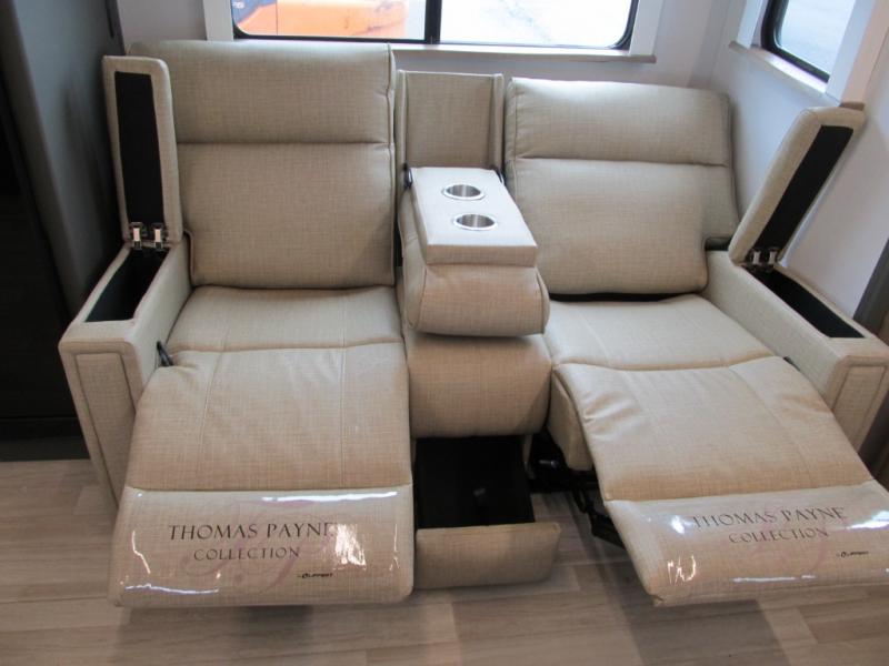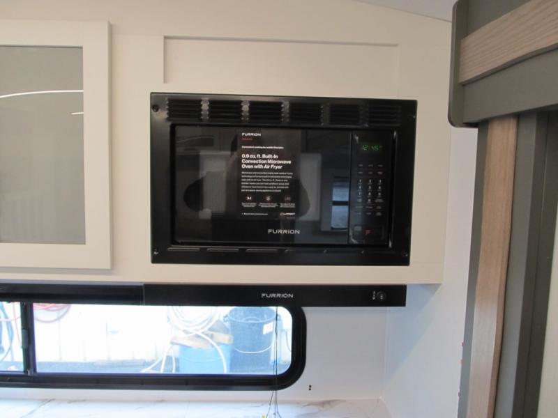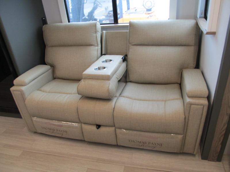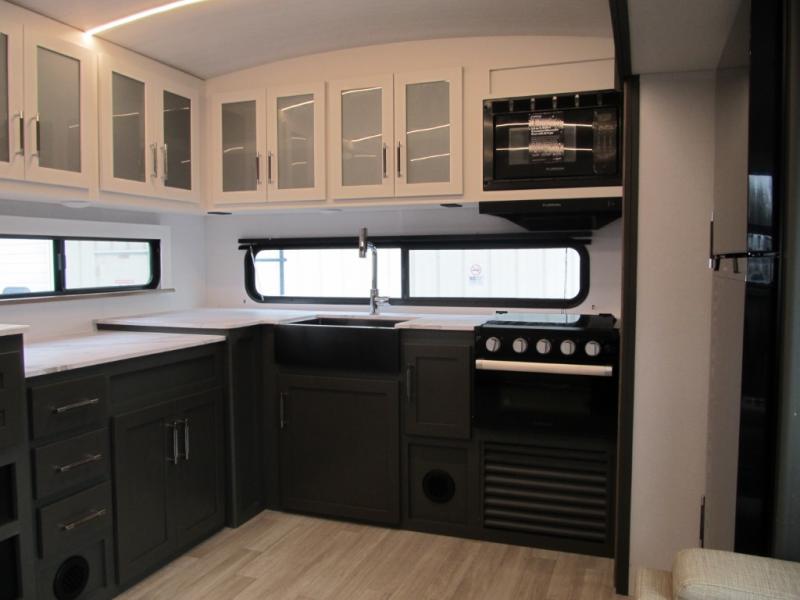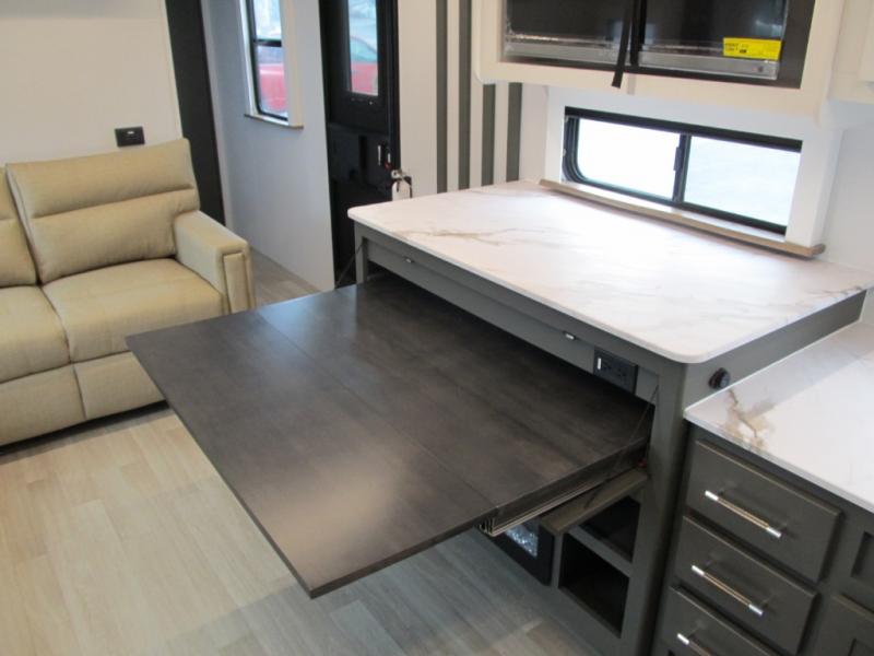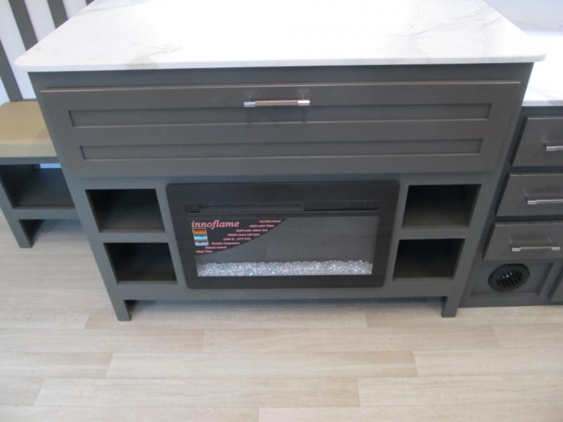 You'll enjoy the added space in this travel trailer thanks to the large slide out that houses the theater seating, pantry, and 12V refrigerator. And the 12V TV is in direct view so you can watch movies in the evenings. If you have guests staying over, they can sleep on the tri-fold sofa, while you take the queen bed in the front private bedroom. A rear kitchen includes extended counter space to prep meals, or you can use the outdoor kitchen with a mini fridge and griddle. The pull-out dinette table provides a place to dine together, or you can sit outdoors under the 19' awning. There is even an exterior TV here for added convenience!