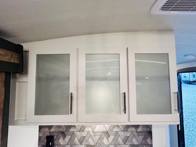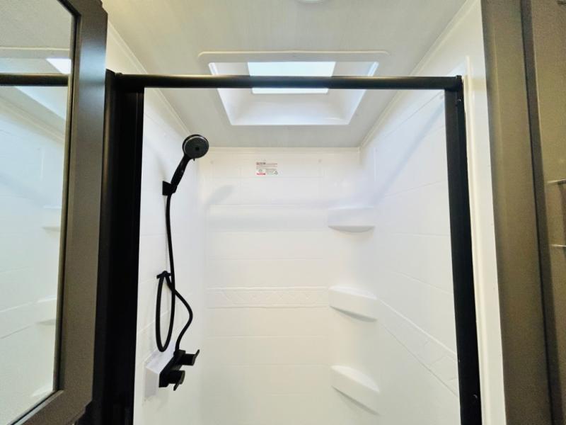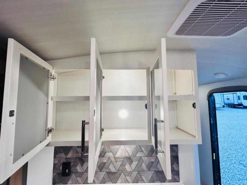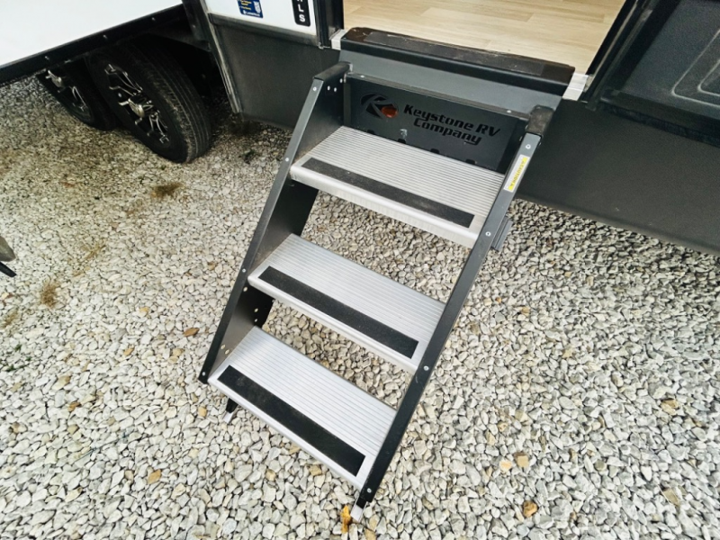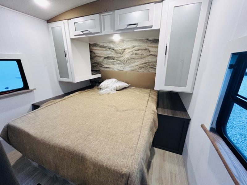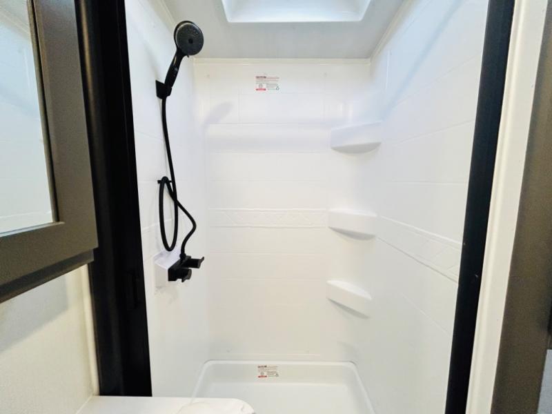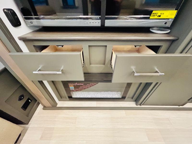 Weekend trips to the campground are made easy in this travel trailer! There are dual opposing slides in the combined kitchen and living area to provide you with ample space to stretch out. A kitchen island will come in handy when prepping meals, plus you'll have all the appliances needed to cook them. You will find comfortable seating on the rear tri-fold sofa sleeper, Do-More dinette table, and theater seats across from the entertainment center and fireplace. When you're ready to call it a night, the front private bedroom with a queen bed will be calling your name, and the full bath onboard will let you freshen up each day!