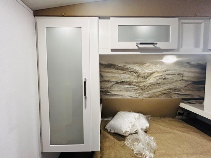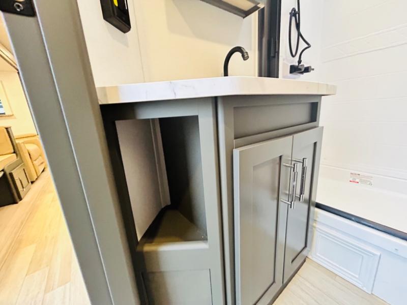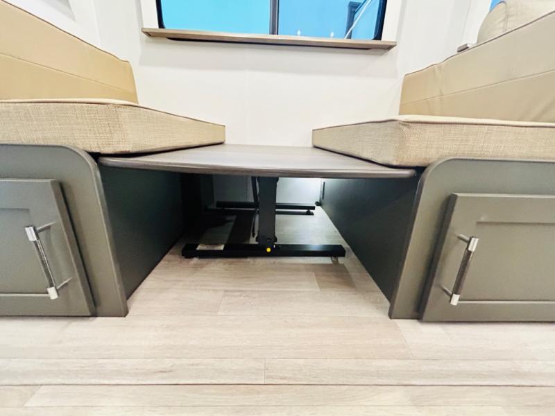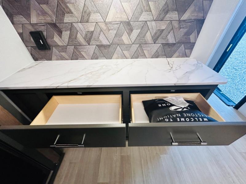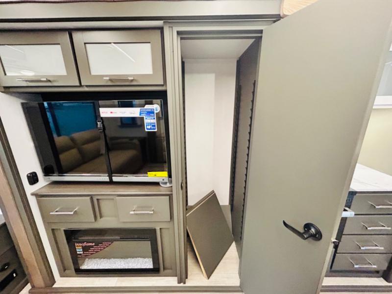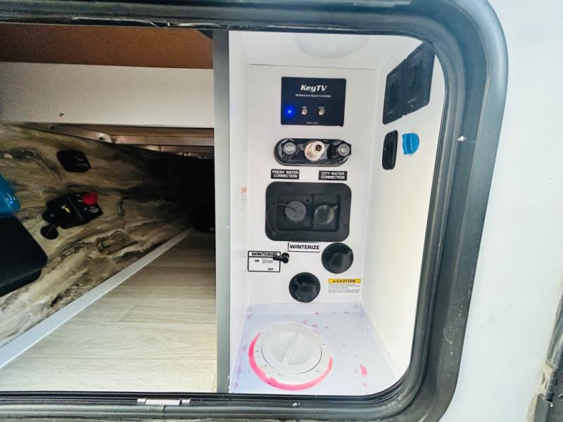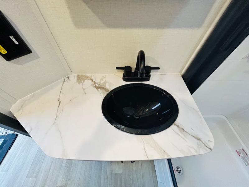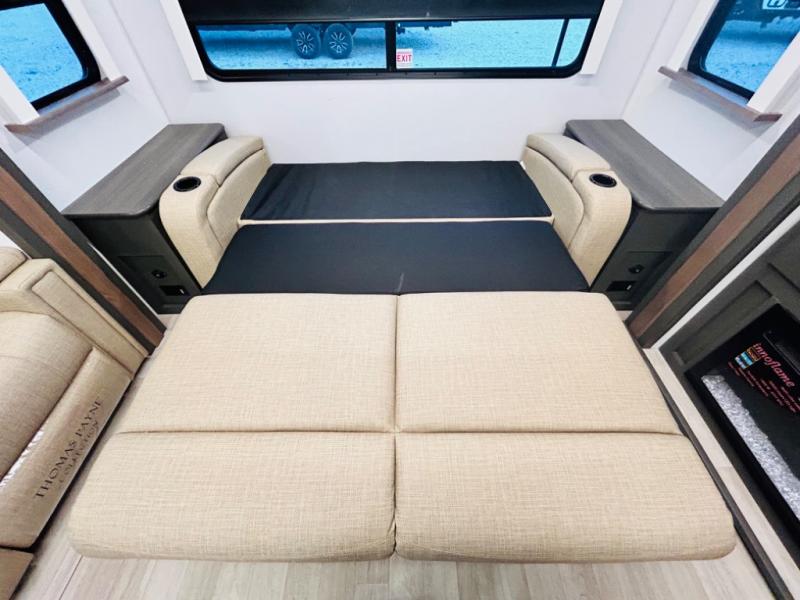Weekend trips to the campground are made easy in this travel trailer! There are dual opposing slides in the combined kitchen and living area to provide you with ample space to stretch out. A kitchen island will come in handy when prepping meals, plus you'll have all the appliances needed to cook them. You will find comfortable seating on the rear tri-fold sofa sleeper, Do-More dinette table, and theater seats across from the entertainment center and fireplace. When you're ready to call it a night, the front private bedroom with a queen bed will be calling your name, and the full bath onboard will let you freshen up each day!