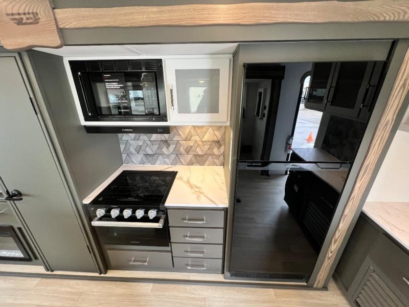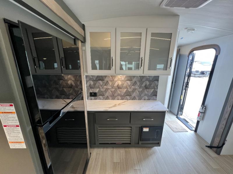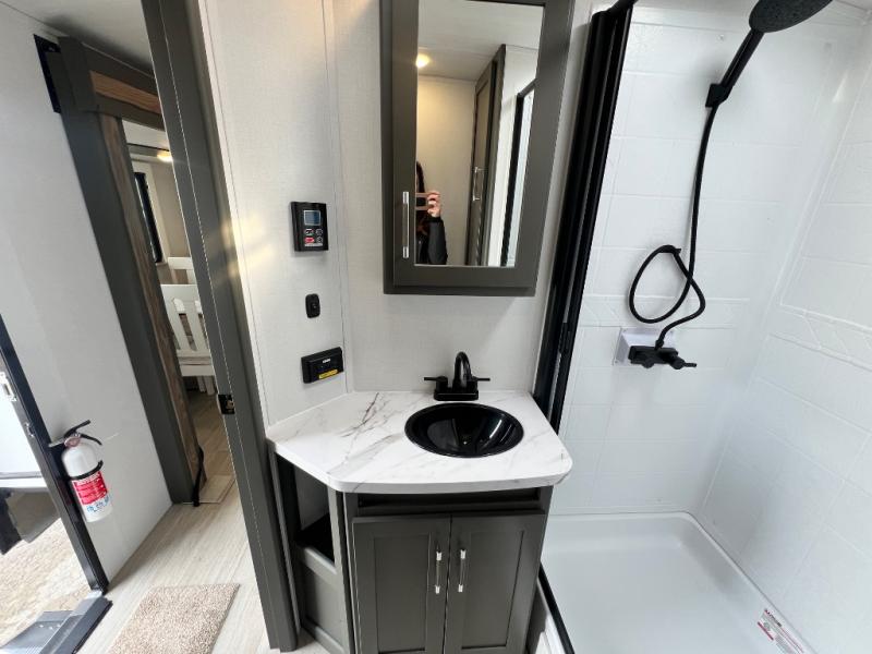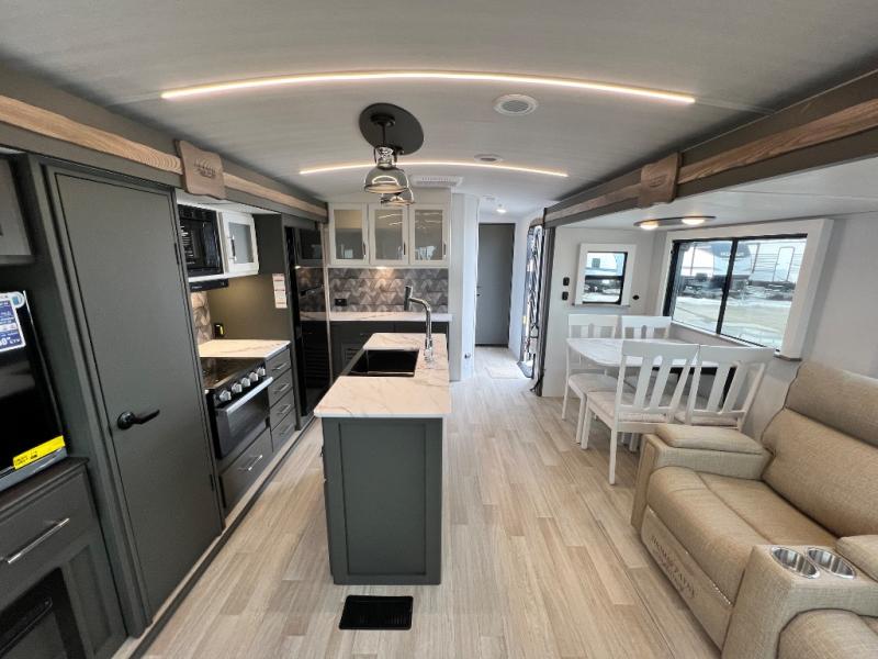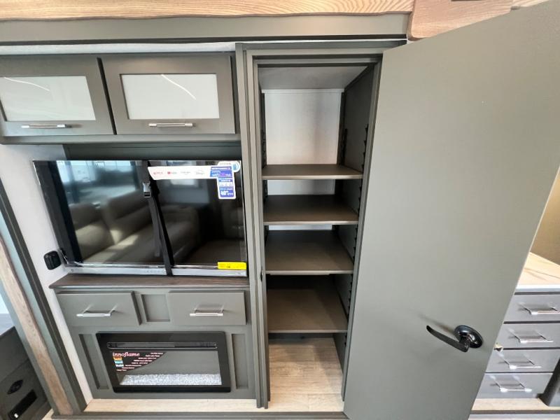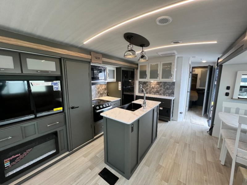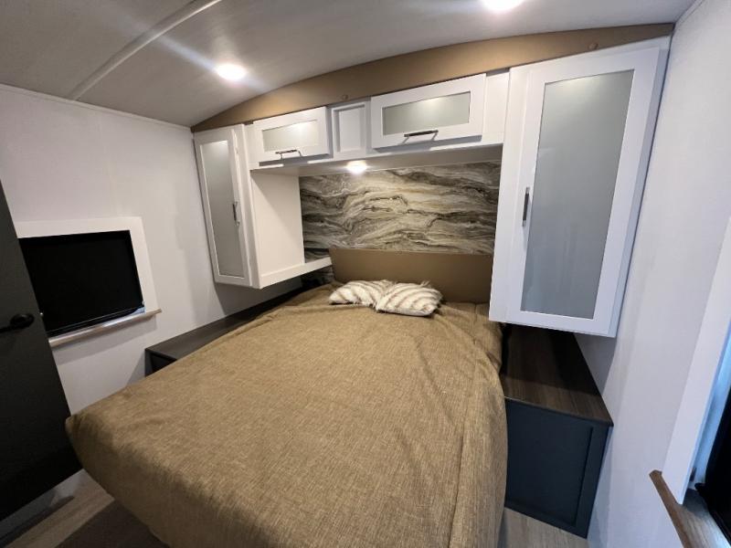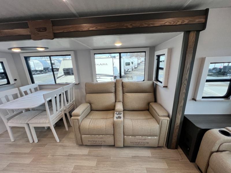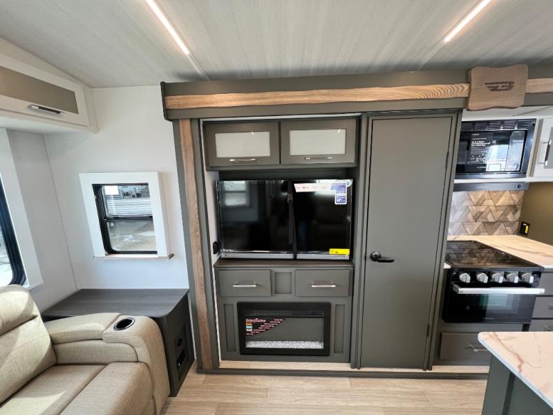Weekend trips to the campground are made easy in this travel trailer! There are dual opposing slides in the combined kitchen and living area to provide you with ample space to stretch out. A kitchen island will come in handy when prepping meals, plus you'll have all the appliances needed to cook them. You will find comfortable seating on the rear tri-fold sofa sleeper, Do-More dinette table, and theater seats across from the entertainment center and fireplace. When you're ready to call it a night, the front private bedroom with a queen bed will be calling your name, and the full bath onboard will let you freshen up each day!