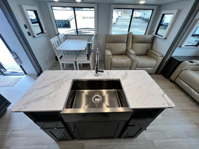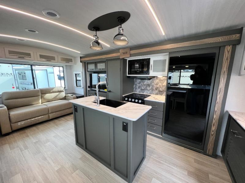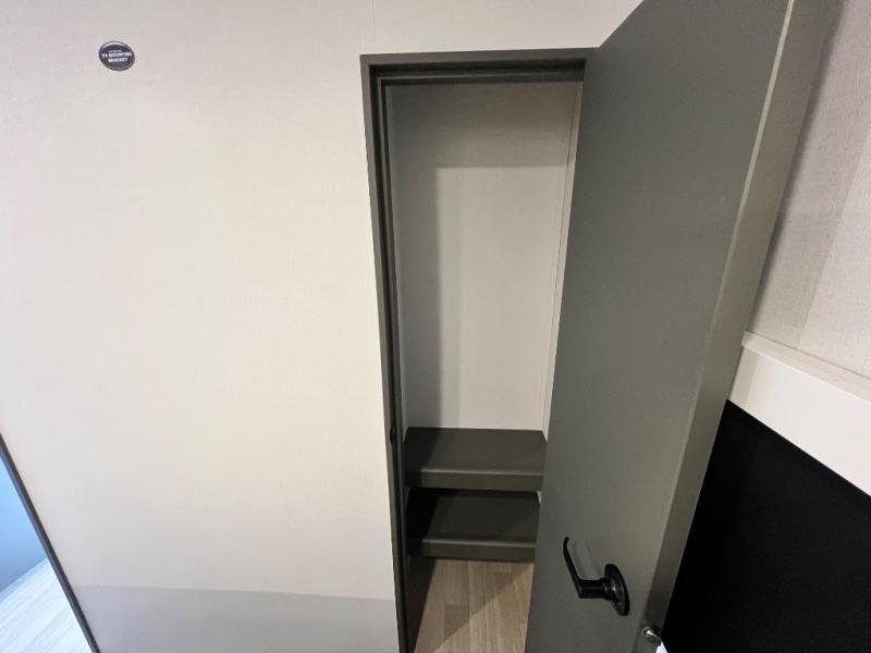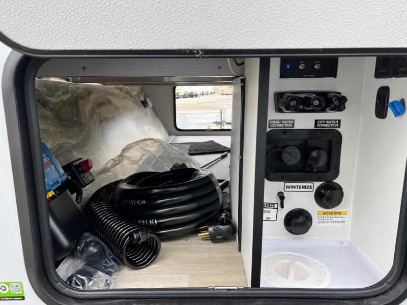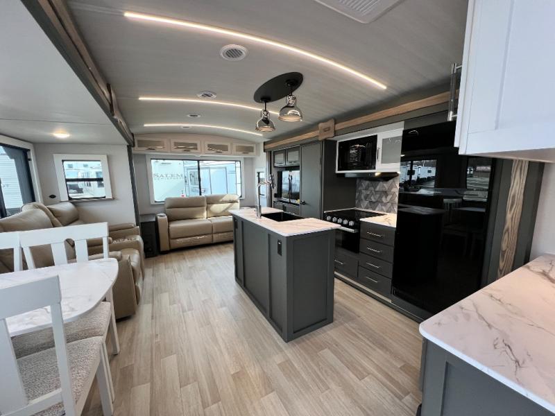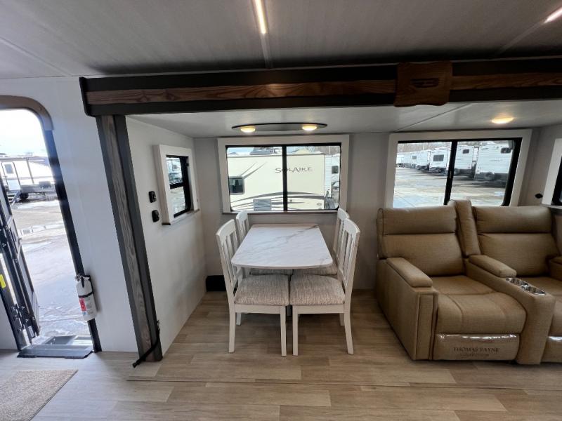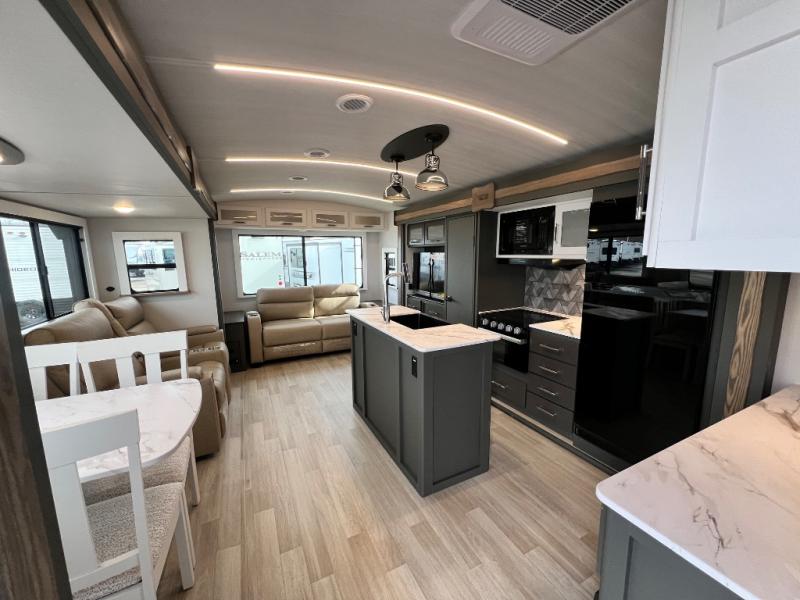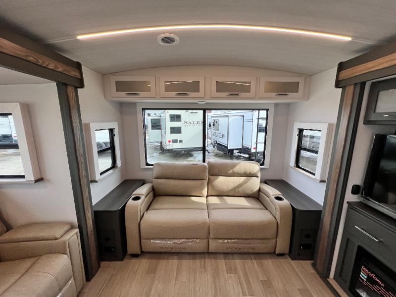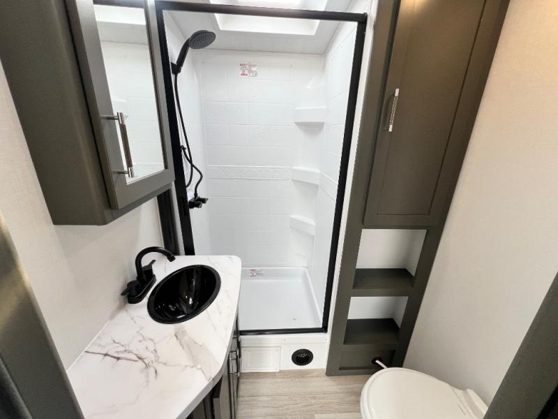 Weekend trips to the campground are made easy in this travel trailer! There are dual opposing slides in the combined kitchen and living area to provide you with ample space to stretch out. A kitchen island will come in handy when prepping meals, plus you'll have all the appliances needed to cook them. You will find comfortable seating on the rear tri-fold sofa sleeper, Do-More dinette table, and theater seats across from the entertainment center and fireplace. When you're ready to call it a night, the front private bedroom with a queen bed will be calling your name, and the full bath onboard will let you freshen up each day!