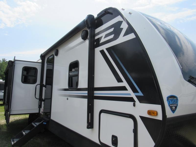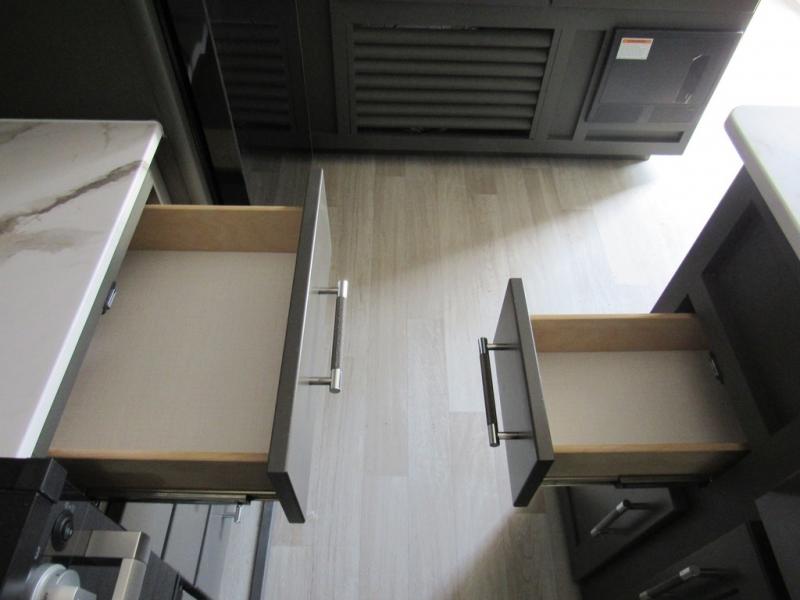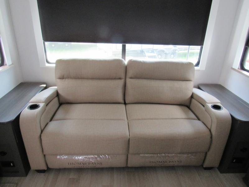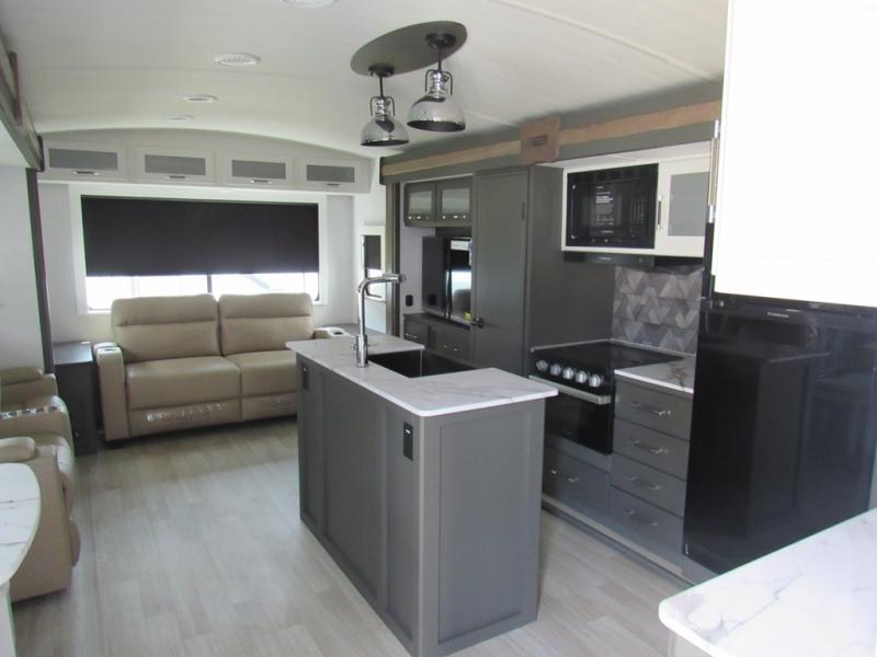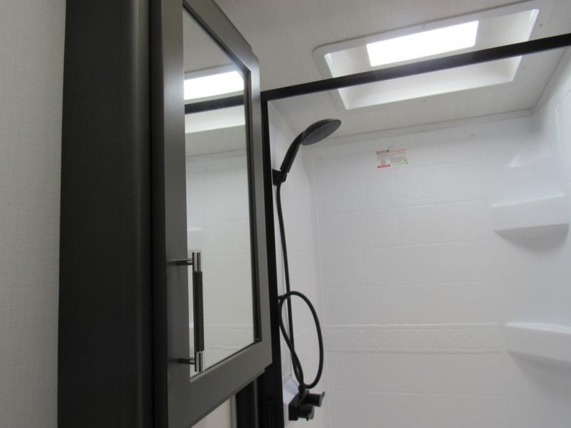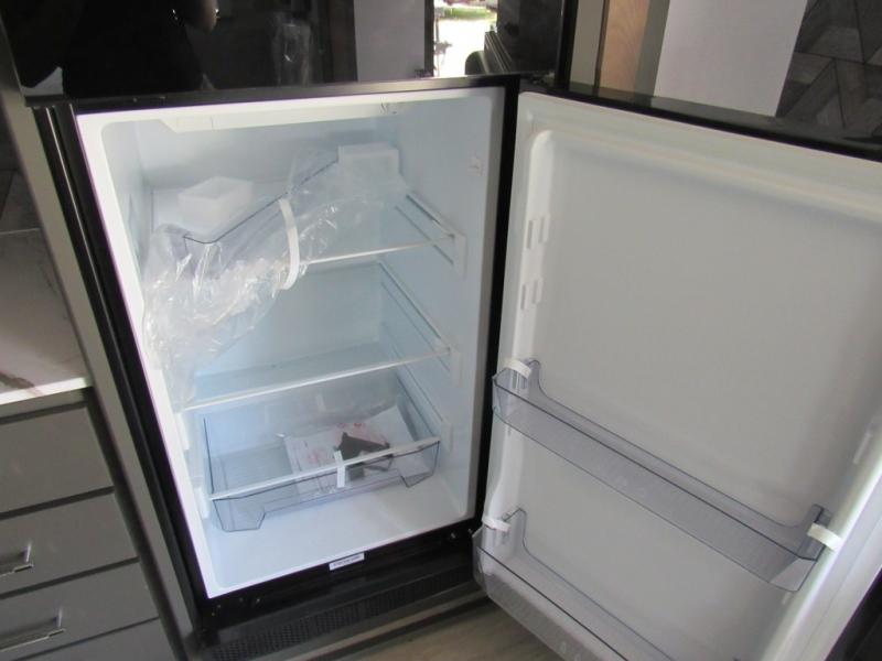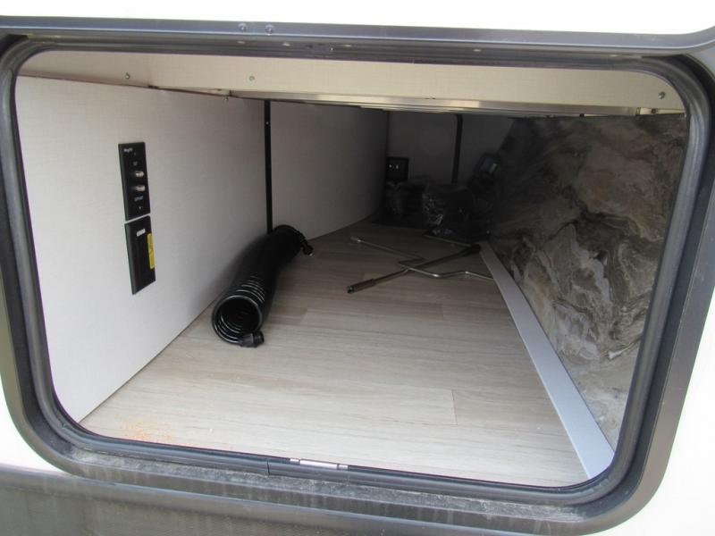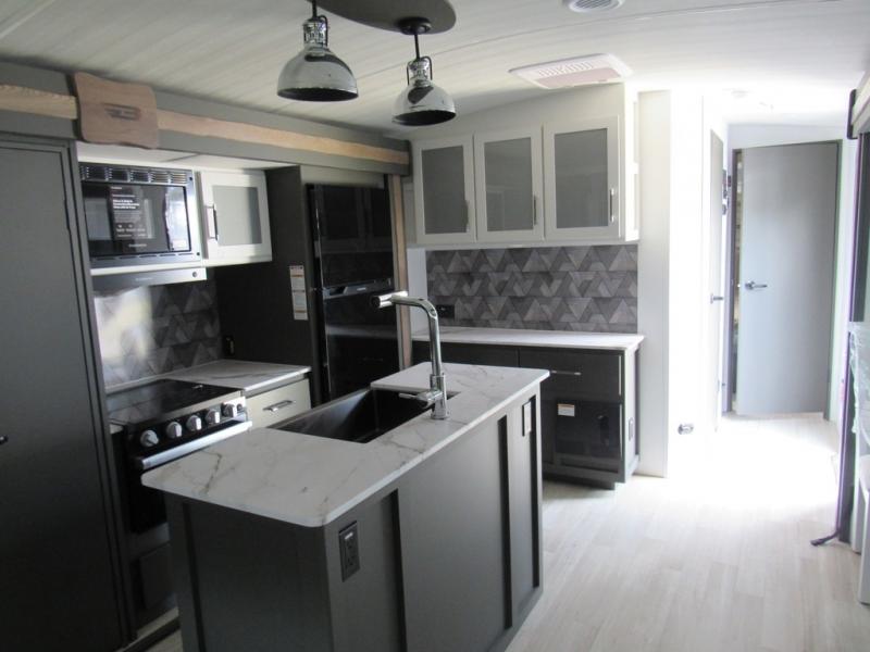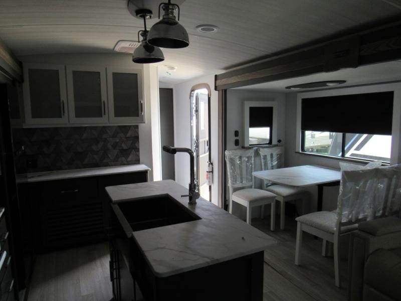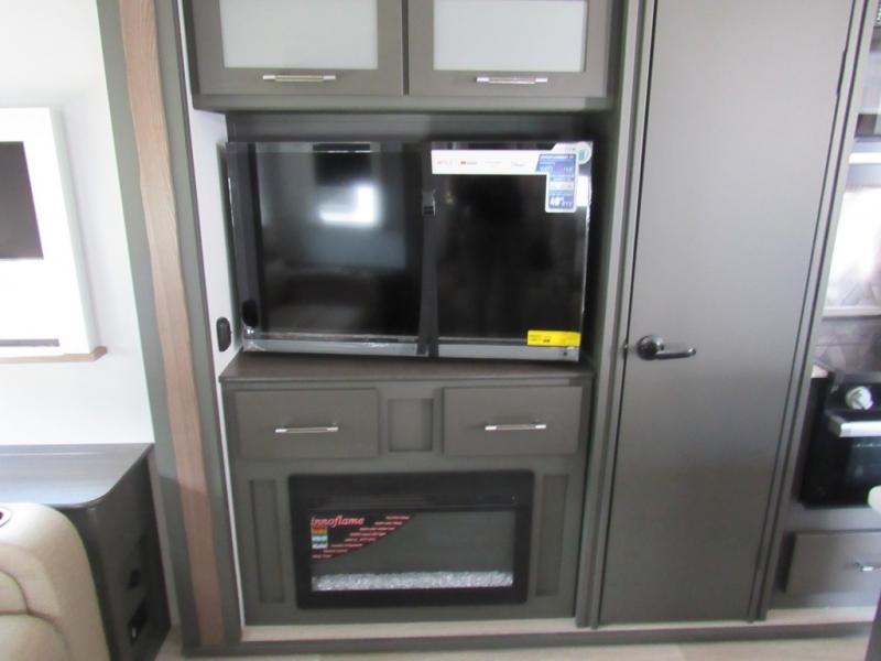 Weekend trips to the campground are made easy in this travel trailer! There are dual opposing slides in the combined kitchen and living area to provide you with ample space to stretch out. A kitchen island will come in handy when prepping meals, plus you'll have all the appliances needed to cook them. You will find comfortable seating on the rear tri-fold sofa sleeper, Do-More dinette table, and theater seats across from the entertainment center and fireplace. When you're ready to call it a night, the front private bedroom with a queen bed will be calling your name, and the full bath onboard will let you freshen up each day!