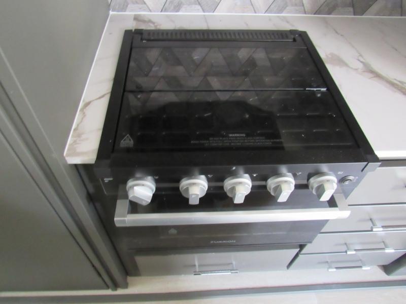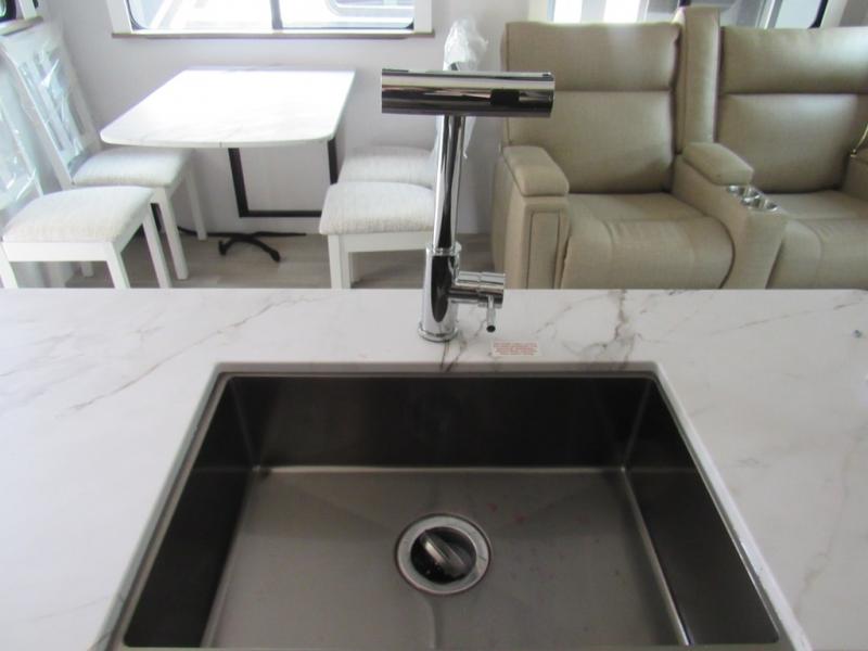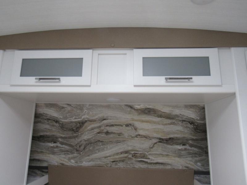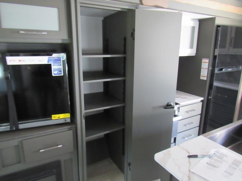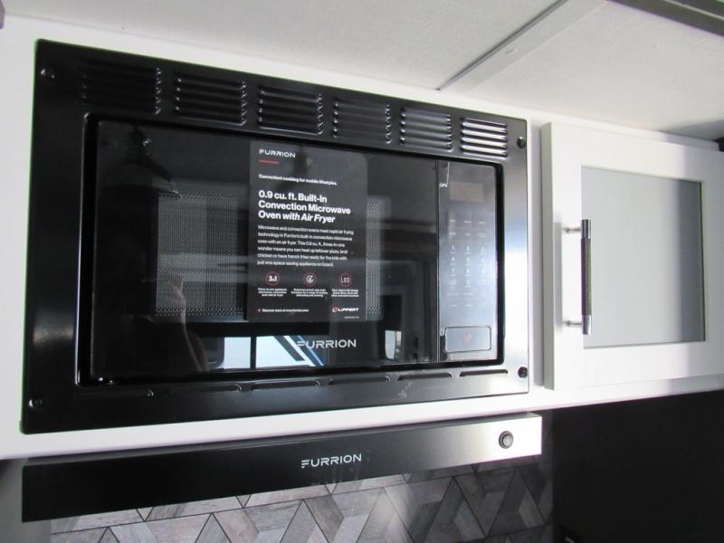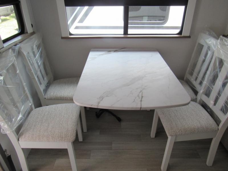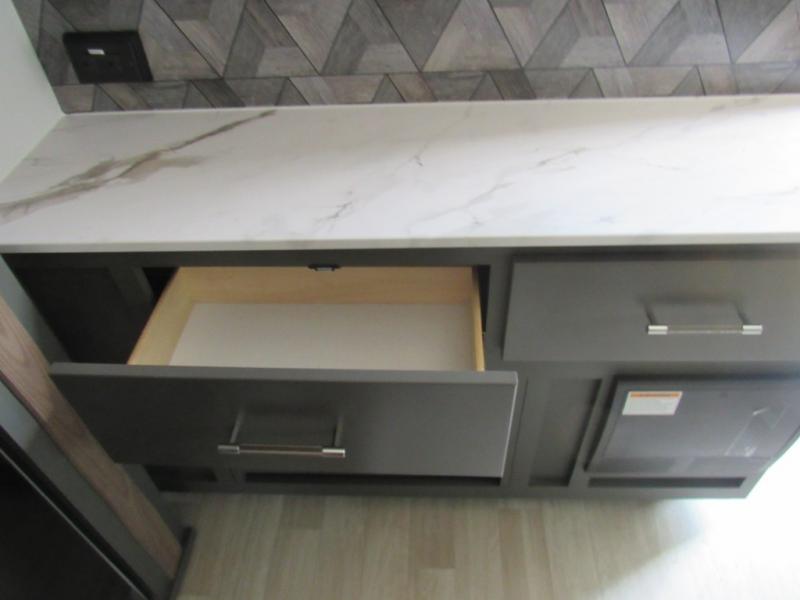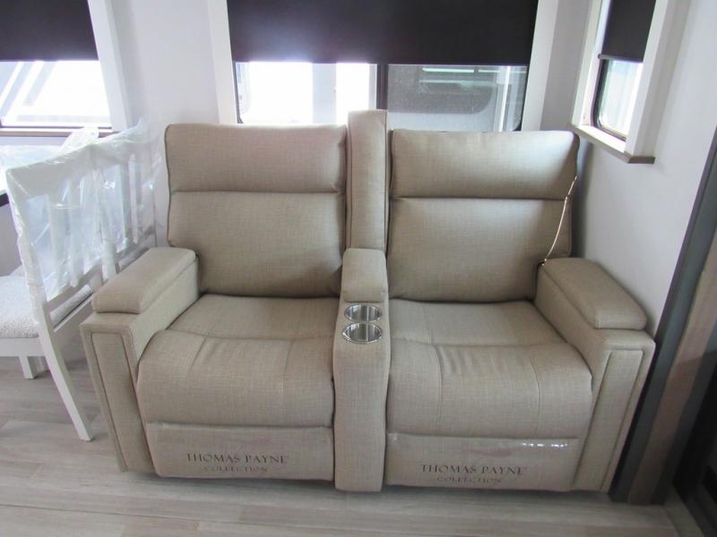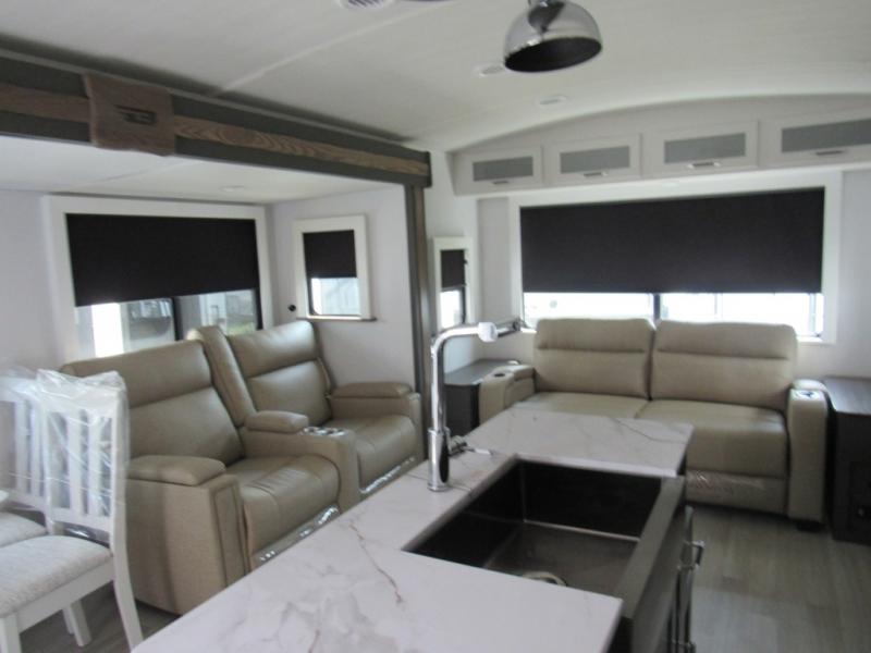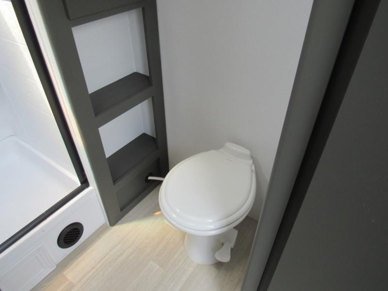 Weekend trips to the campground are made easy in this travel trailer! There are dual opposing slides in the combined kitchen and living area to provide you with ample space to stretch out. A kitchen island will come in handy when prepping meals, plus you'll have all the appliances needed to cook them. You will find comfortable seating on the rear tri-fold sofa sleeper, Do-More dinette table, and theater seats across from the entertainment center and fireplace. When you're ready to call it a night, the front private bedroom with a queen bed will be calling your name, and the full bath onboard will let you freshen up each day!