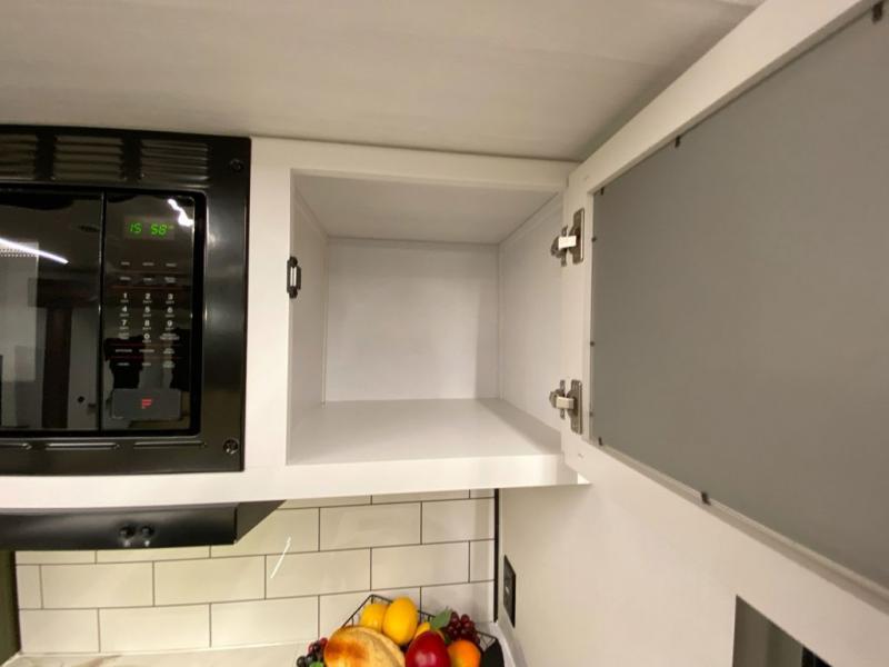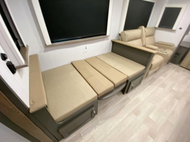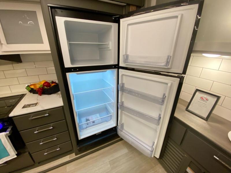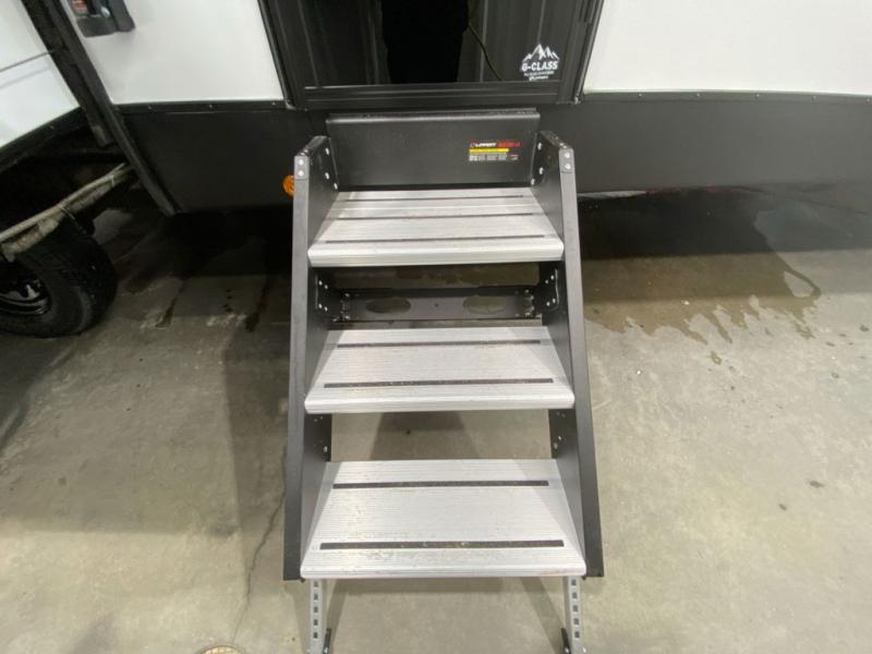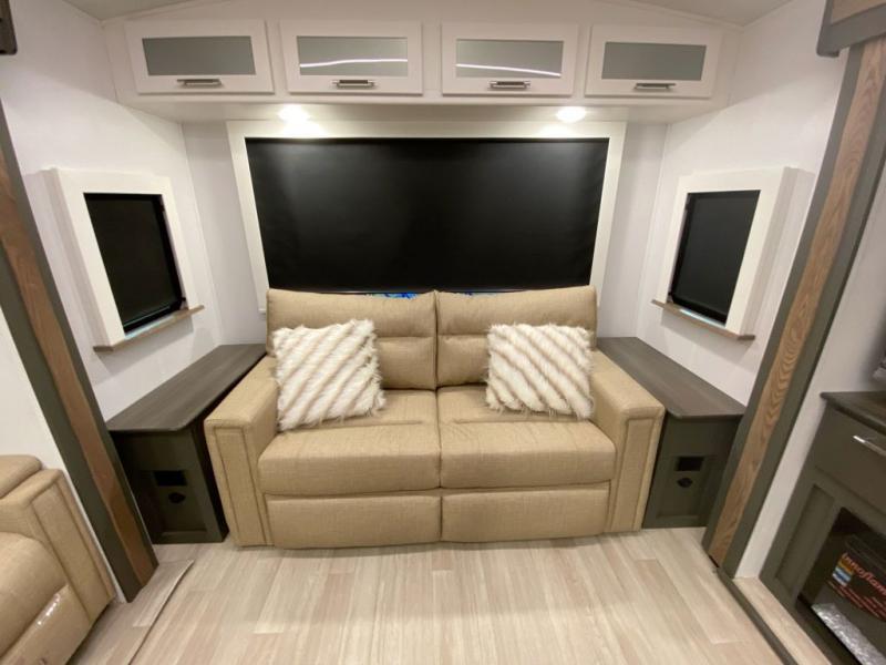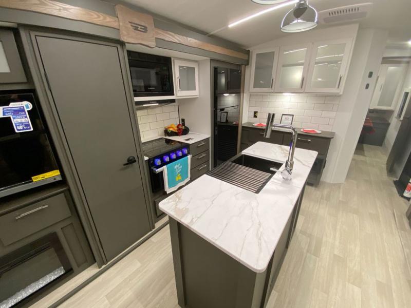 Weekend trips to the campground are made easy in this travel trailer! There are dual opposing slides in the combined kitchen and living area to provide you with ample space to stretch out. A kitchen island will come in handy when prepping meals, plus you'll have all the appliances needed to cook them. You will find comfortable seating on the rear tri-fold sofa sleeper, Do-More dinette table, and theater seats across from the entertainment center and fireplace. When you're ready to call it a night, the front private bedroom with a queen bed will be calling your name, and the full bath onboard will let you freshen up each day!