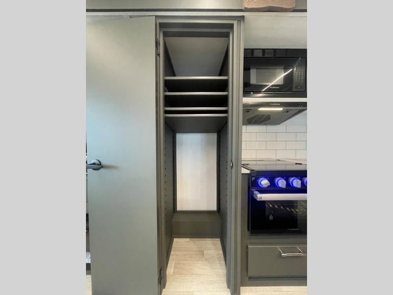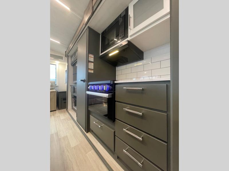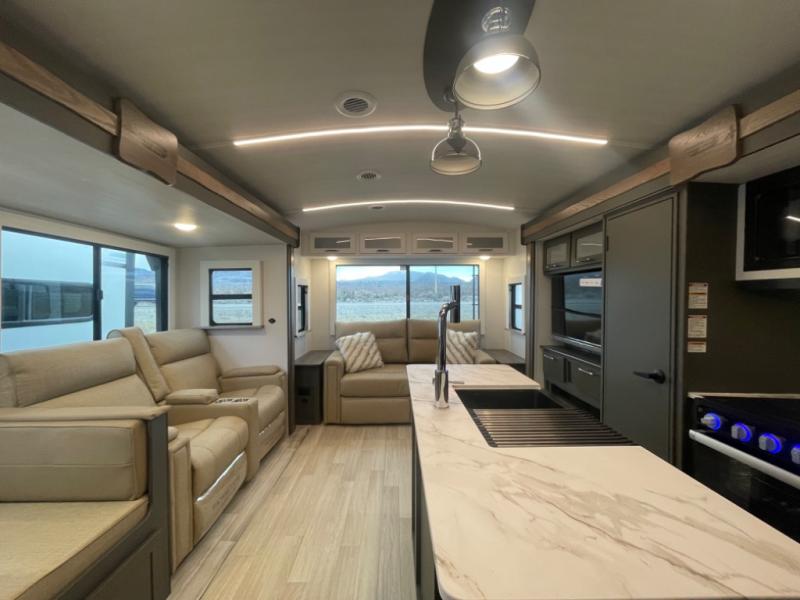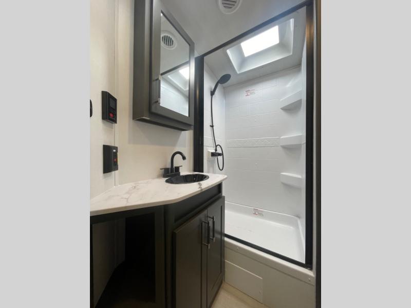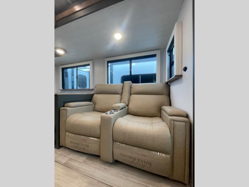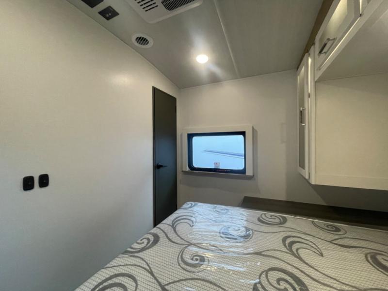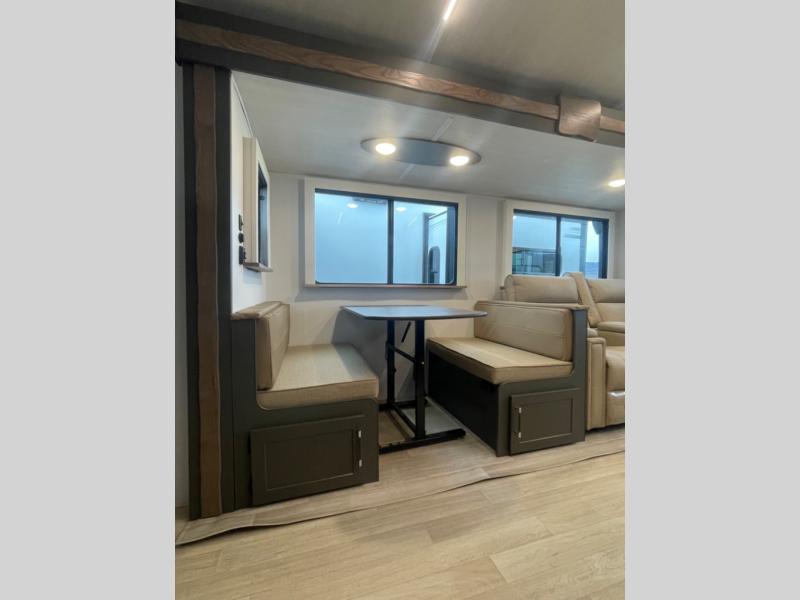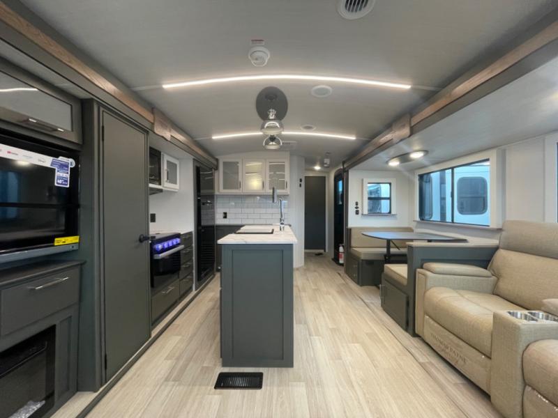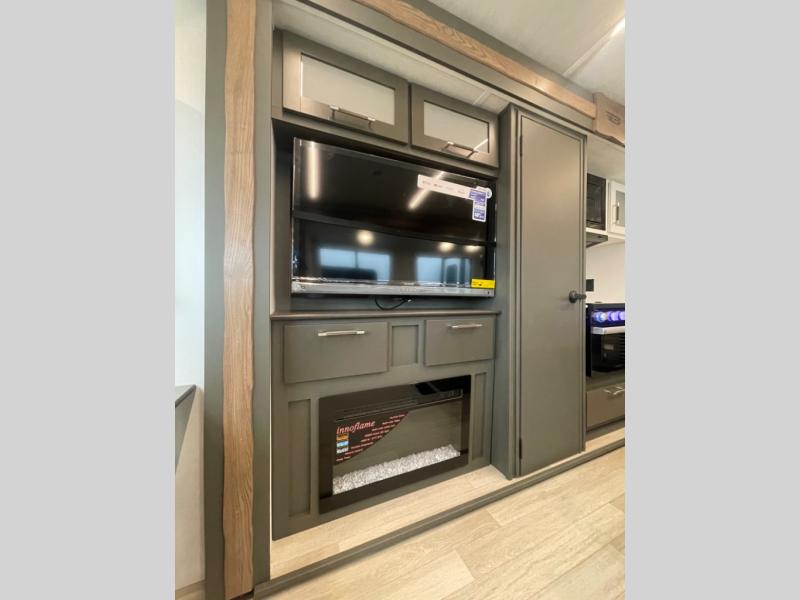 Weekend trips to the campground are made easy in this travel trailer! There are dual opposing slides in the combined kitchen and living area to provide you with ample space to stretch out. A kitchen island will come in handy when prepping meals, plus you'll have all the appliances needed to cook them. You will find comfortable seating on the rear tri-fold sofa sleeper, Do-More dinette table, and theater seats across from the entertainment center and fireplace. When you're ready to call it a night, the front private bedroom with a queen bed will be calling your name, and the full bath onboard will let you freshen up each day!