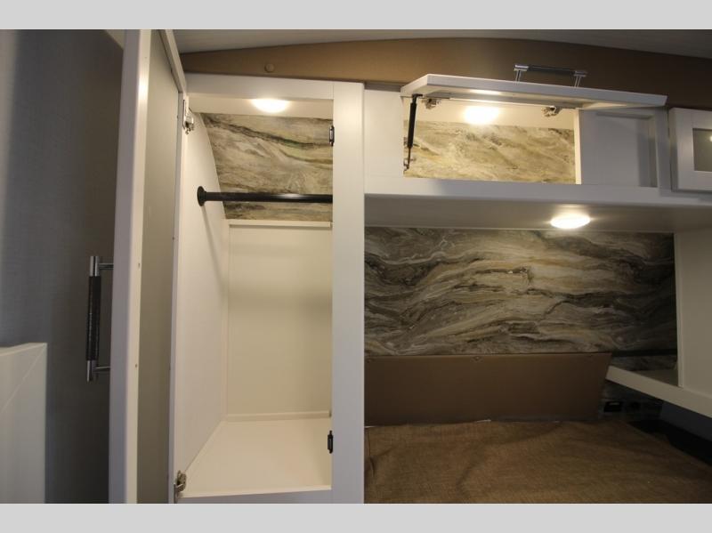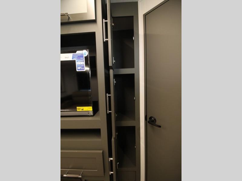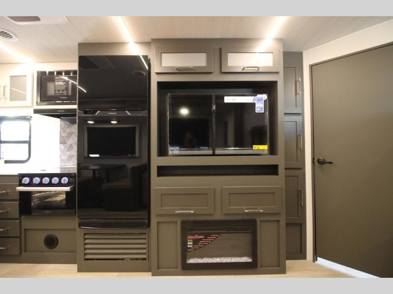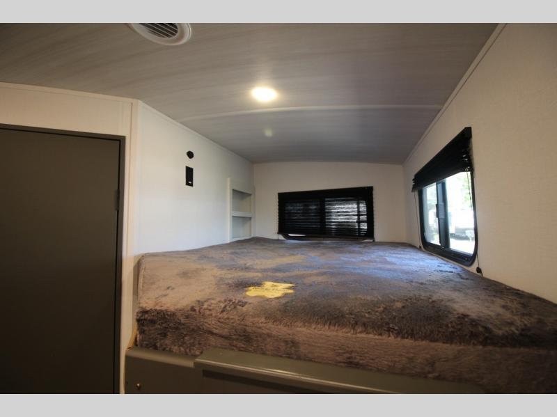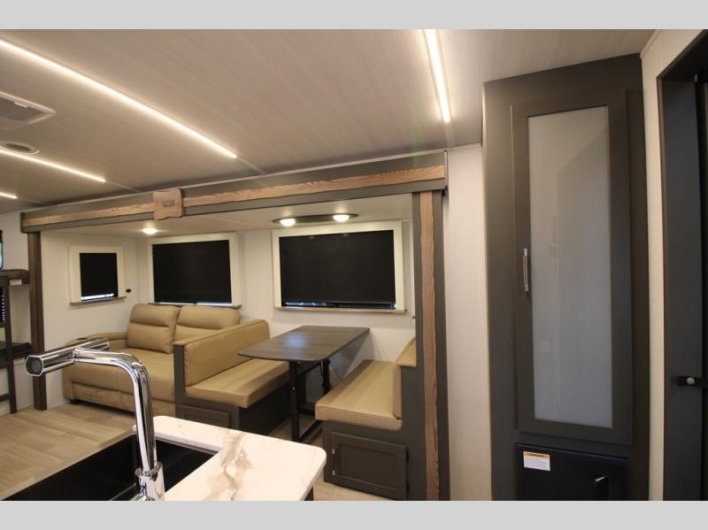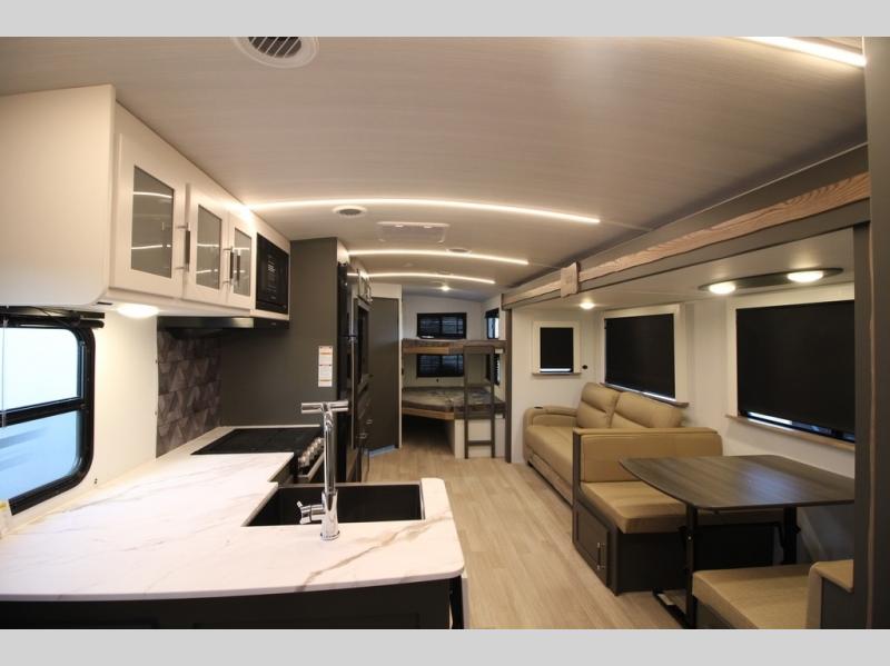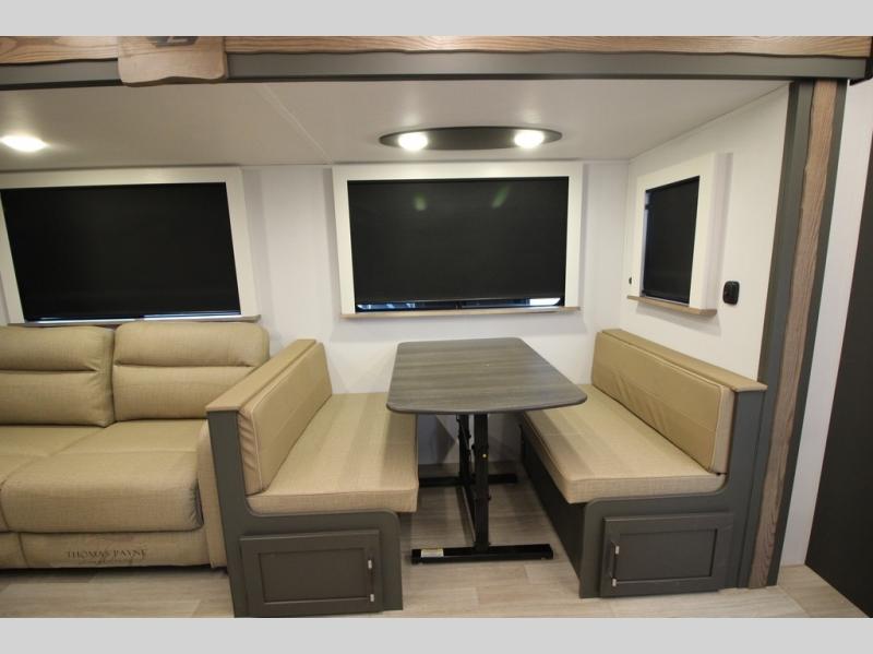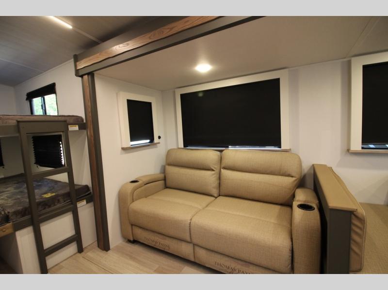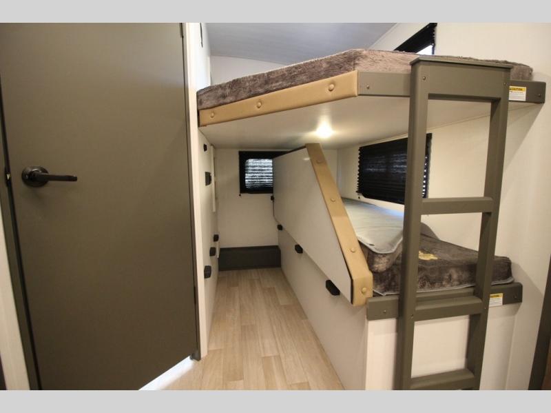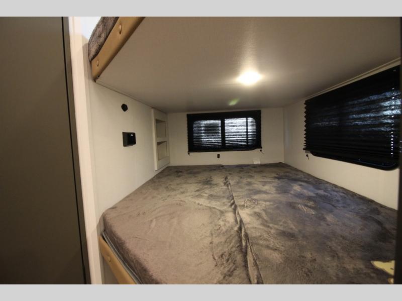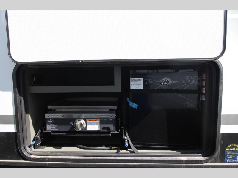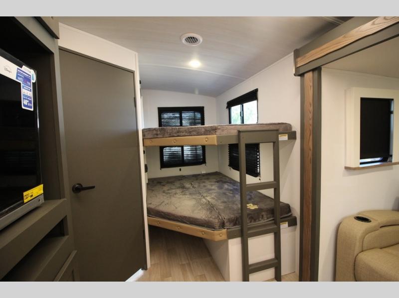 The whole gang will love camping in this travel trailer with double-size bunks, an outdoor kitchen, and a front private bedroom for the owners. You will find plenty of storage throughout, including storage under the flip-up bunk, a kitchen pantry, and an exterior pass-thru storage. Everyone can meet in the main living area to relax on the tri-fold sofa or play a game at the Do-More dinette table. There is even a fireplace across from the sofa for a cozy evening indoors. The chef of your group will have a fully-equipped indoor kitchen plus an outdoor kitchen to cook meals each day. And since there are dual entry doors, you can enter in through the kitchen or full bathroom for convenience!