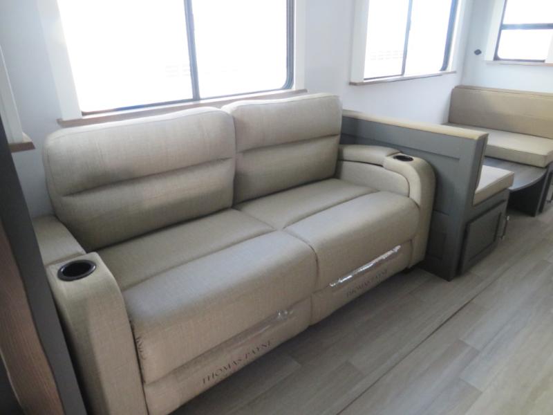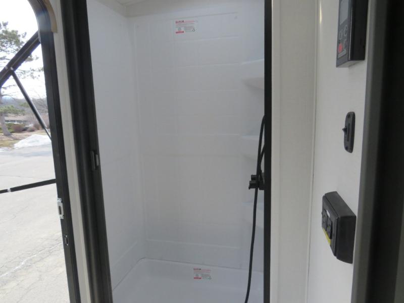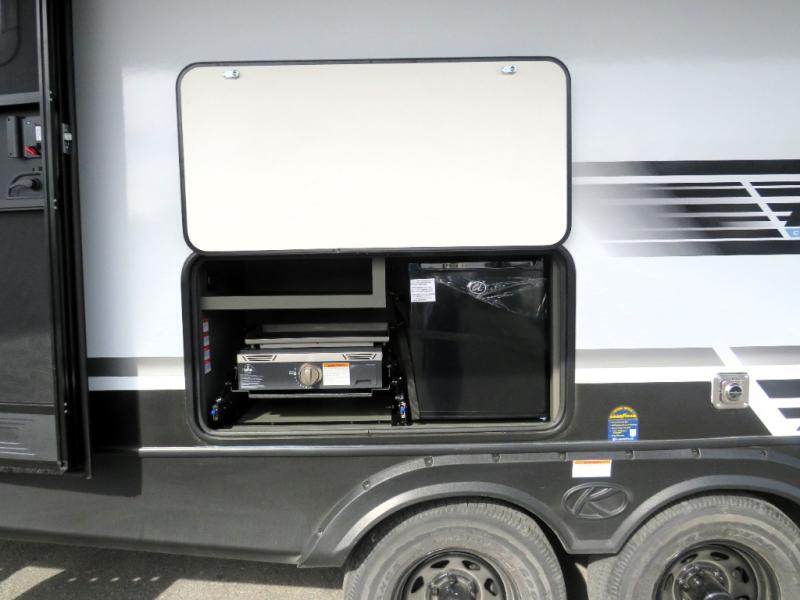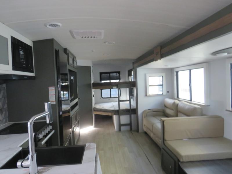 The whole gang will love camping in this travel trailer with double-size bunks, an outdoor kitchen, and a front private bedroom for the owners. You will find plenty of storage throughout, including storage under the flip-up bunk, a kitchen pantry, and an exterior pass-thru storage. Everyone can meet in the main living area to relax on the tri-fold sofa or play a game at the Do-More dinette table. There is even a fireplace across from the sofa for a cozy evening indoors. The chef of your group will have a fully-equipped indoor kitchen plus an outdoor kitchen to cook meals each day. And since there are dual entry doors, you can enter in through the kitchen or full bathroom for convenience!
