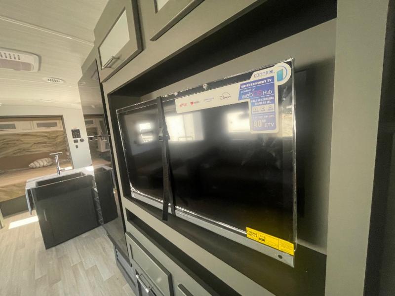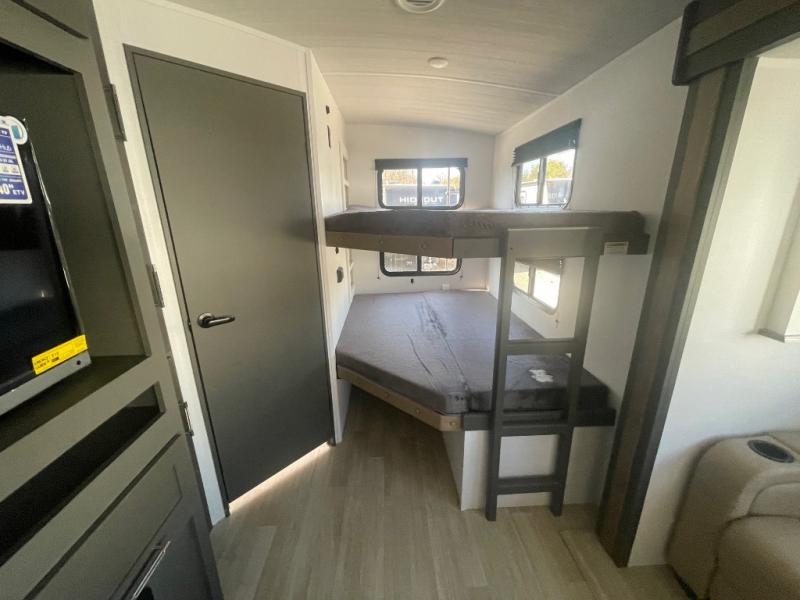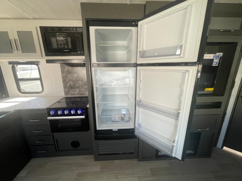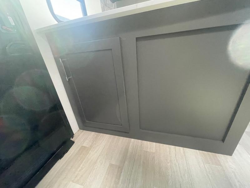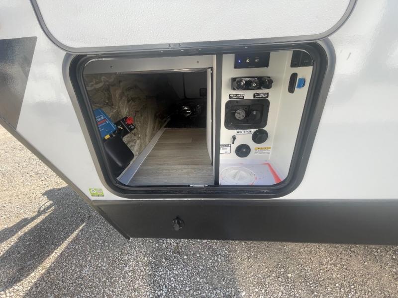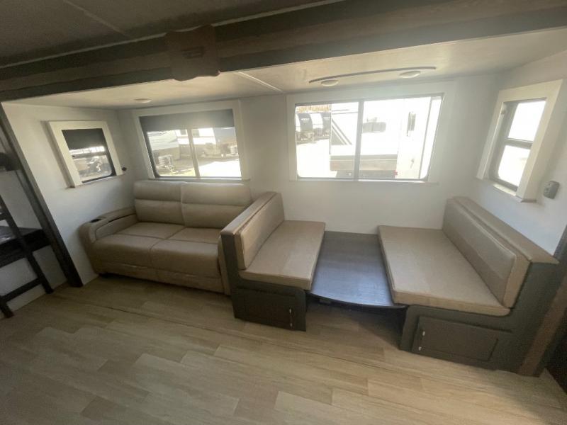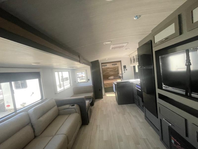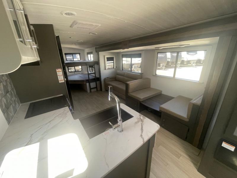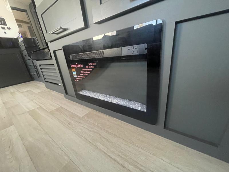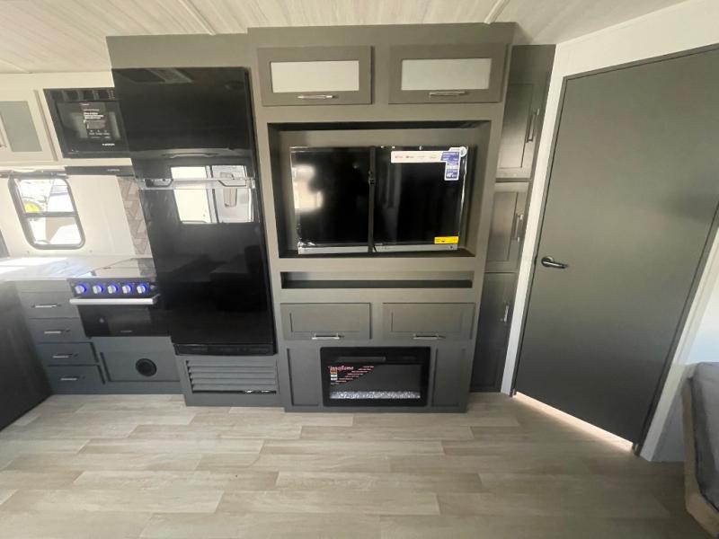 The whole gang will love camping in this travel trailer with double-size bunks, an outdoor kitchen, and a front private bedroom for the owners. You will find plenty of storage throughout, including storage under the flip-up bunk, a kitchen pantry, and an exterior pass-thru storage. Everyone can meet in the main living area to relax on the tri-fold sofa or play a game at the Do-More dinette table. There is even a fireplace across from the sofa for a cozy evening indoors. The chef of your group will have a fully-equipped indoor kitchen plus an outdoor kitchen to cook meals each day. And since there are dual entry doors, you can enter in through the kitchen or full bathroom for convenience!