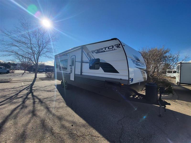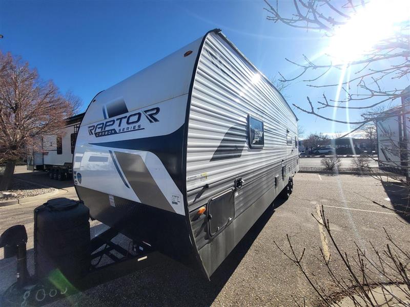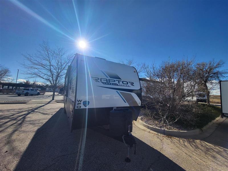 Each Raptor Carbon Series toy hauler travel trailer is built with a 10" I-beam frame, laminated sidewalls with double-welded aluminum construction, plus Dexter E-Z lube 6,000 lb. axles with self-adjusting brakes, electric stabilizer jacks for easy setup, and MORyde step above steps for stability on any type of ground you camp on. On the interior, designer style vinyl flooring throughout, pull-down window shades for privacy at night, and LED lighting throughout. You will appreciate the Girard tankless on-demand water heater for showering both inside and out, and you can also customize your trailer by adding a few options if you wish. The optional patio package will provide you with a raised outdoor living area to enjoy, and the optional SolarFlex protect 220 allows you the ability to decide how you want to camp. Choose your favorite model today!