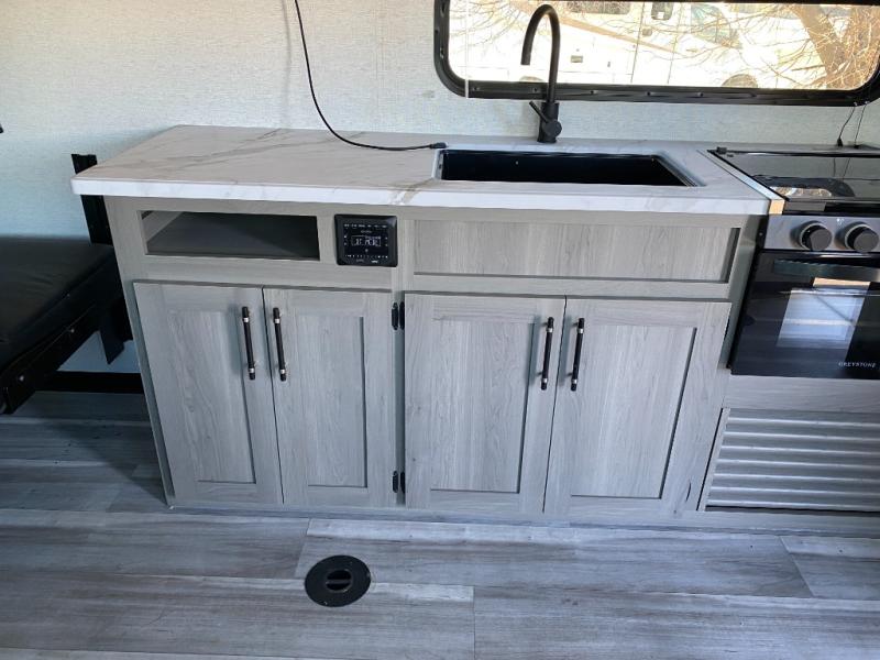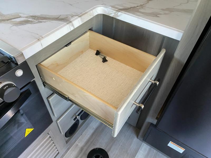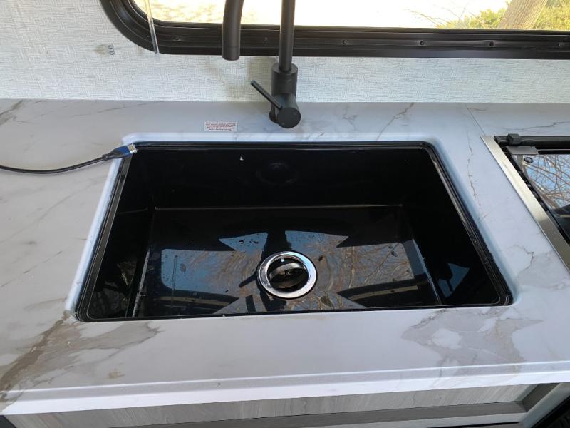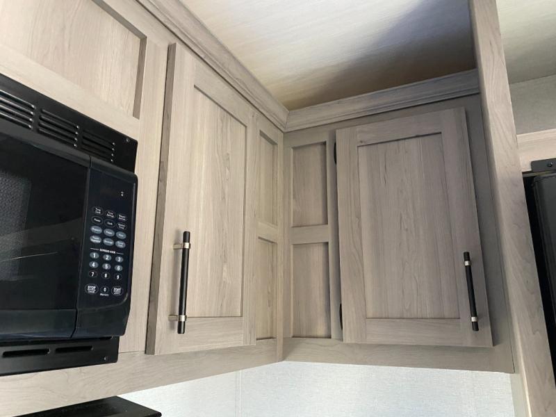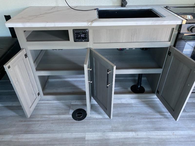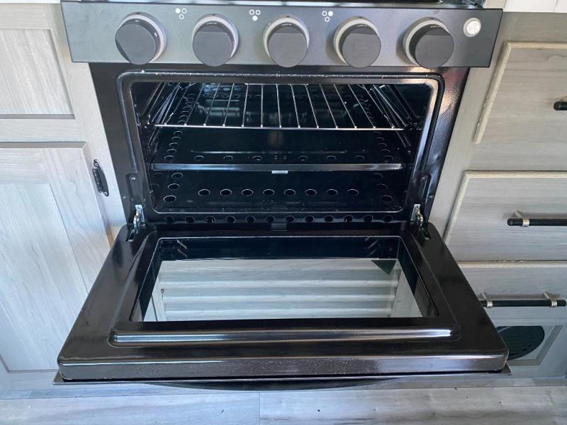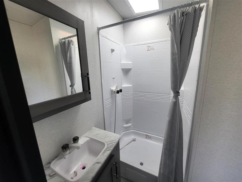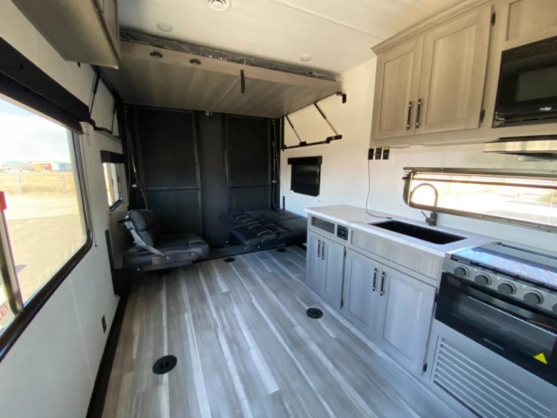 Load up your favorite off-road riding toys and head to your favorite trails, dunes, or competition rally with family and friends. This unit sleeps six with the RV queen bed in front and the dual roll over sofas and bonus bunk in back. The 13' garage with 5K inter-lock system tie downs will get all of your cargo safely to your destination. Once in camp, the rear ramp door will help you easily unload and then set up the sofas with table in between. A full kitchen allows you to refuel your bodies easily by providing a three burner range and 17" black oven, a 10.7 cu. ft. 12V refrigerator for your perishables, and a residential microwave oven to heat up leftovers. The full bath will allow everyone to easily clean up after a full day of fun, and you will enjoy the private front bedroom with an RV queen bed and a full closet for all of your things. On the outside, an 18' power awning provides added living space, or you might like to add the optional patio package for a raised extension of your unit giving you an outdoor space to enjoy.
