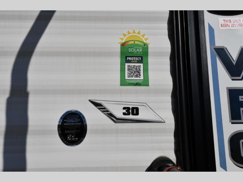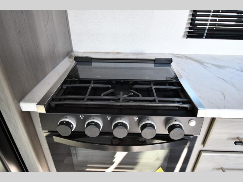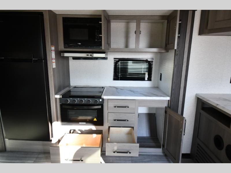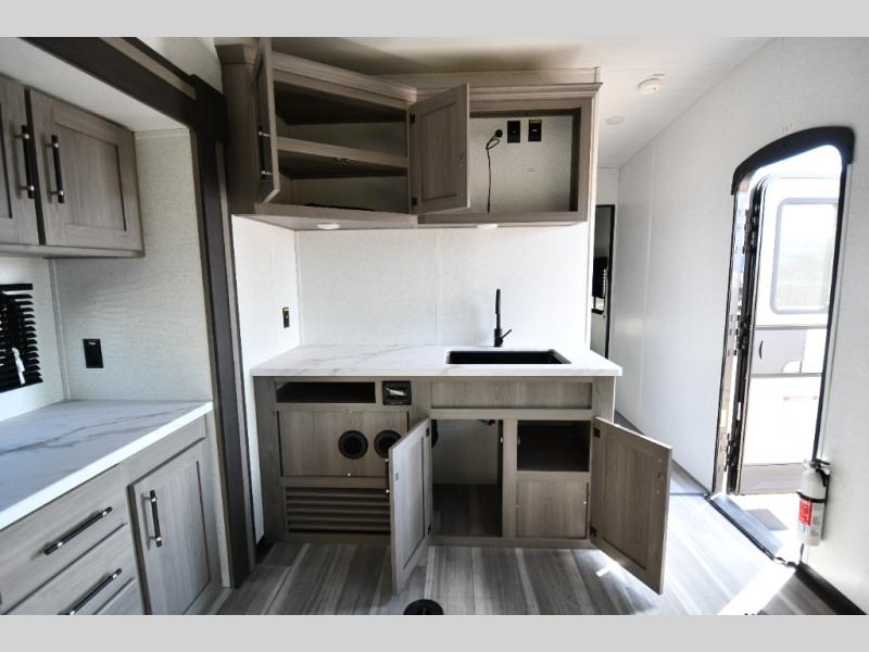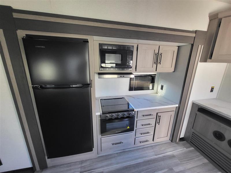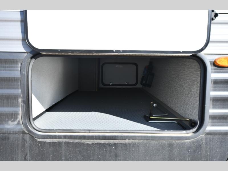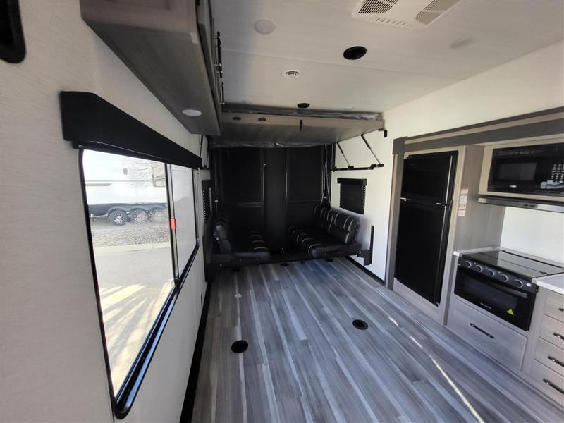 Enjoy a weekend of fun with family and friends with this wide open concept toy hauler featuring 15' of garage space for your toys! This unit sleeps six with the RV queen bed in front and the dual roll over sofas and bonus bunk in back. The 15' garage with 5K inter-lock system tie downs will get all of your cargo safely to your destination. Once in camp, the rear ramp door will help you easily unload and then set up the sofas with table in between. The kitchen slide featuring a hutch allows you to refuel your bodies easily by providing a three burner range and 17" black oven, a 10.7 cu. ft. 12V refrigerator for your perishables, and a residential microwave oven to warm up leftovers. The full bath will allow everyone to easily clean up after a full day of fun, and you will enjoy the private front bedroom with an RV queen bed and a full closet for all of your things. On the outside, an 18' power awning provides added living space, or you might like to add the optional patio packaged for a raised extension of your unit giving you an outdoor space to hang out and enjoy some fresh air between rides.