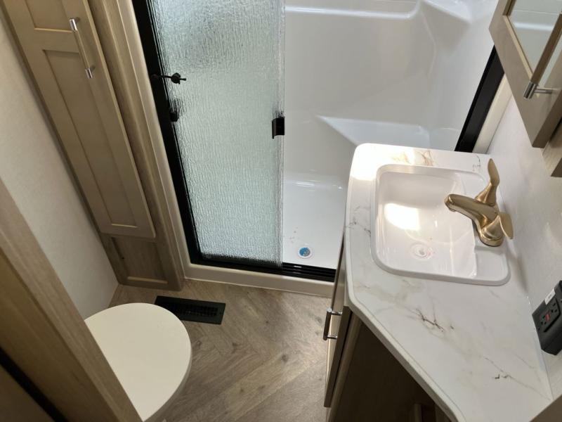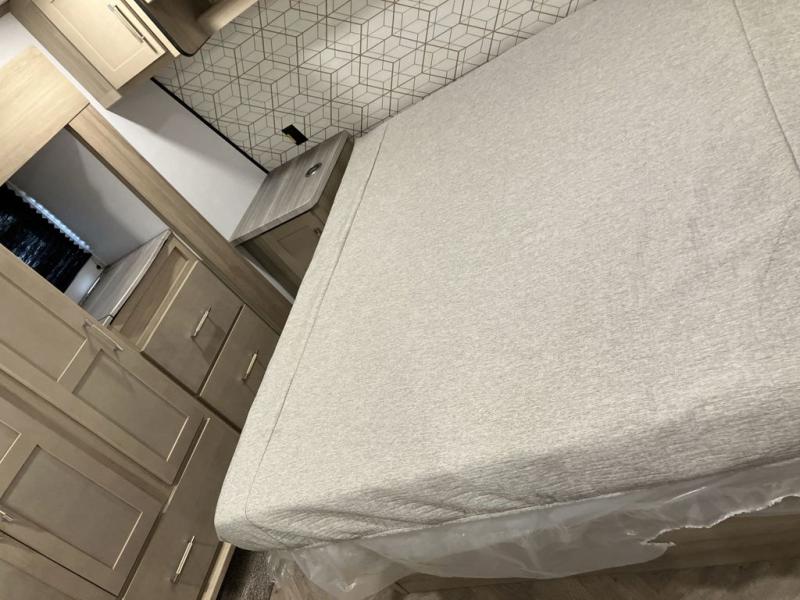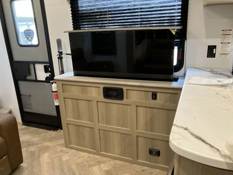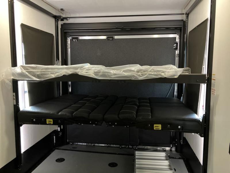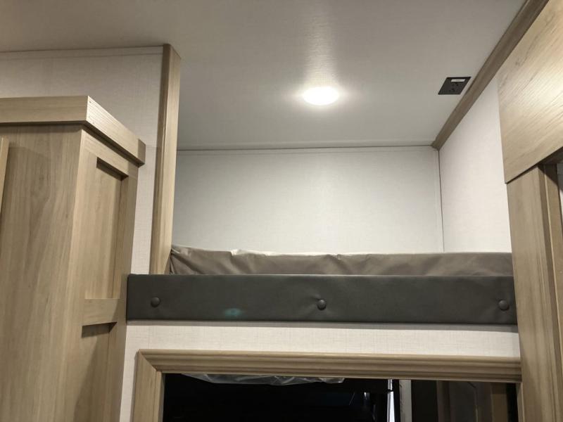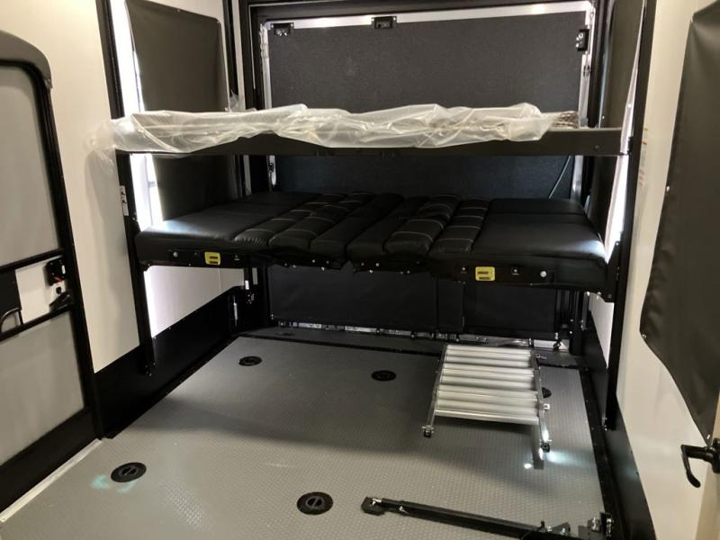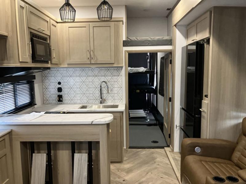 Trips to the lake with friends and family just got better with this toy hauler in tow! Once you've unloaded your toys from the 13' separate garage, head out to kick up some mud! The full bath with a 40" x 28" shower will be waiting for you when you return, and you can turn the garage into living space with its dual opposing sofas. There is also an electric bed here plus a loft with a twin bed for guests to sleep on. The combined kitchen and living area is also a place where everyone can gather thanks to the two double-seat sofas and raised bar with flip-up seats. And you'll find the front private bedroom to be ultra cozy with its king bed, slide out wardrobe with drawers, plus two additional wardrobes on either side of the bed. There is even nightstands with wireless phone chargers; how convenient!