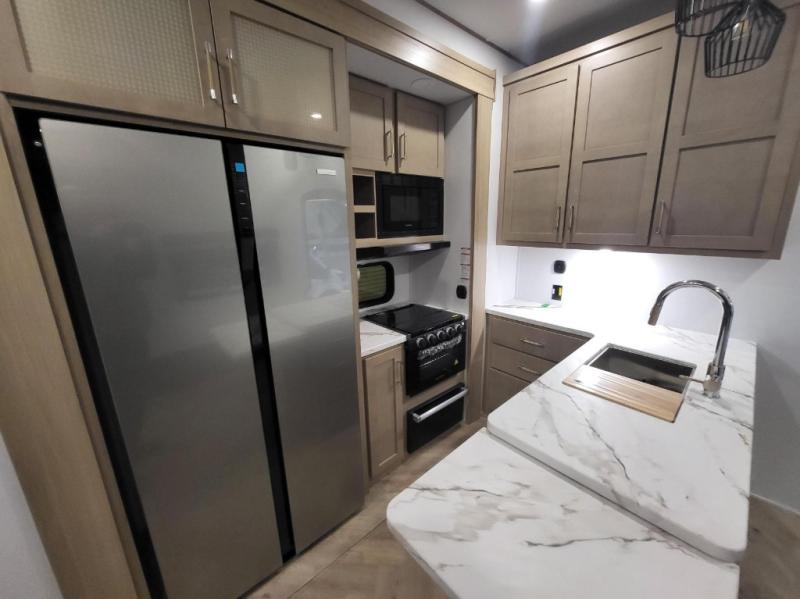 Grab your helmets and load up the dirt bikes in this spacious fifth wheel! Once you've arrived at the campground, you can use the ramp door to unload your toys from the 17' 6" garage area. There are dual opposing sofas here, along with an electric bed for guests to sleep on. The queen bed in the front bedroom offers a good night's rest and all of your clothes can be kept tidy in the wardrobe slide, plus there are dual wardrobes and nightstands on either side of the bed. Head to the kitchen where you'll find generous counter space, a flip-up countertop, a three burner range and a residential microwave, plus a 16.5 cu. ft. 12V refrigerator slide for food storage.