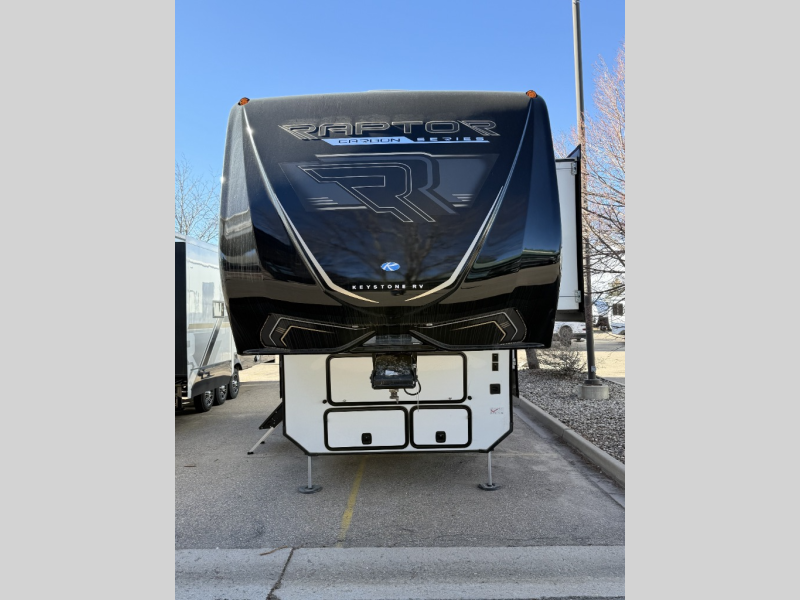 With any Keystone Raptor Carbon Series toy hauler, you will receive a rugged construction from the industry-leading patented 5,000 lb. capacity tie-downs that are welded to the frame to increase hauling safety and security, plus the Dyna Span floor decking in the garage. There is off-grid camping with the Solar Flex which delivers an affordable, high-quality RV solar energy system, and a comfortable interior with the exclusive Omni-Chill technology that offers high-efficiency air conditioning and maximum cooling. Other unexpected conveniences include soft-close hardwood cabinetry allowing you to sneak snacks without others noticing, and designer style flooring throughout for easy care and a stylish look. And each Raptor Carbon Series includes Keystone Exclusives! Now all you have to do is take charge of how you camp in a toy hauler fifth wheel or travel trailer!
