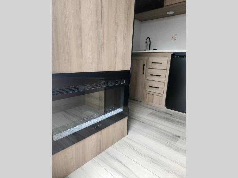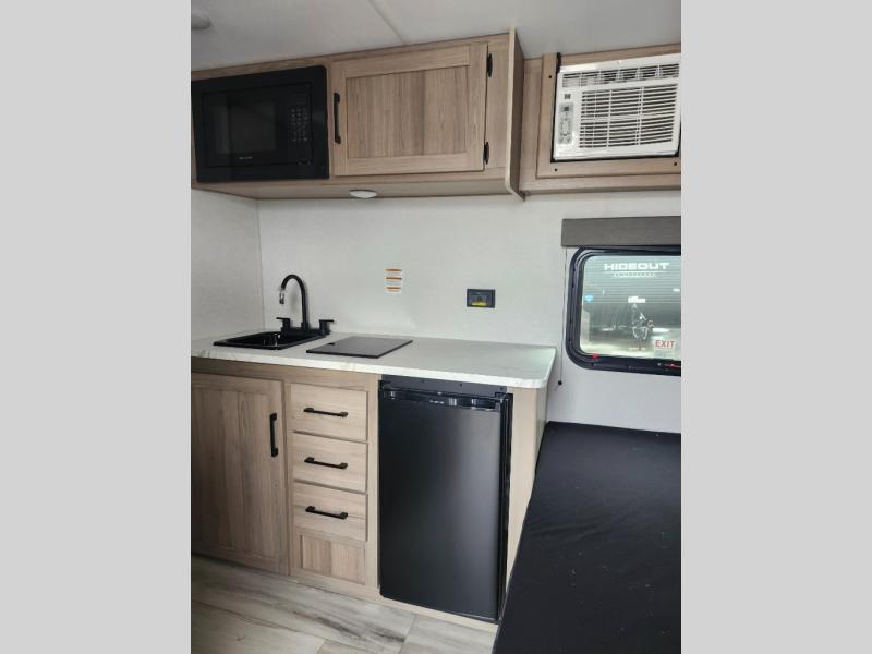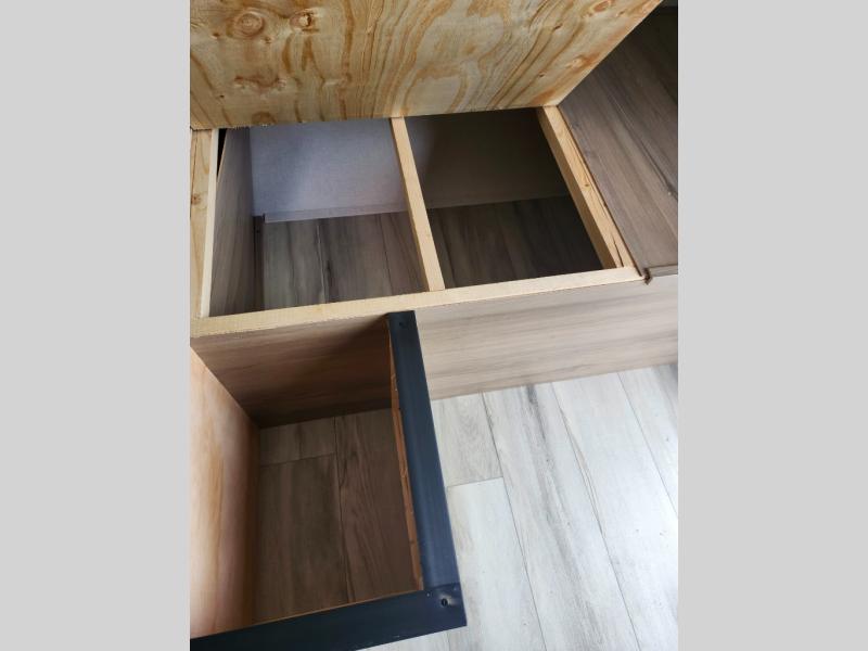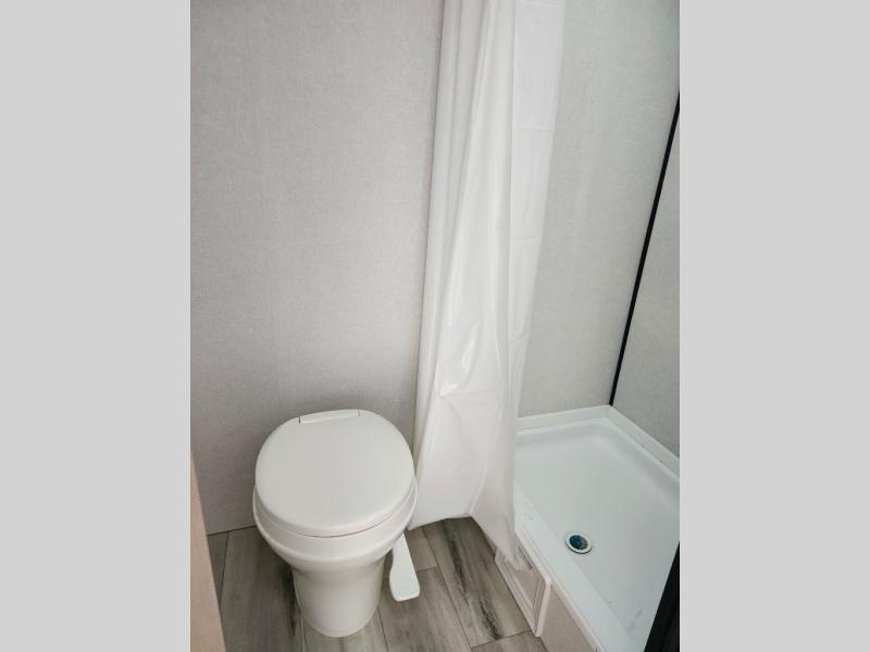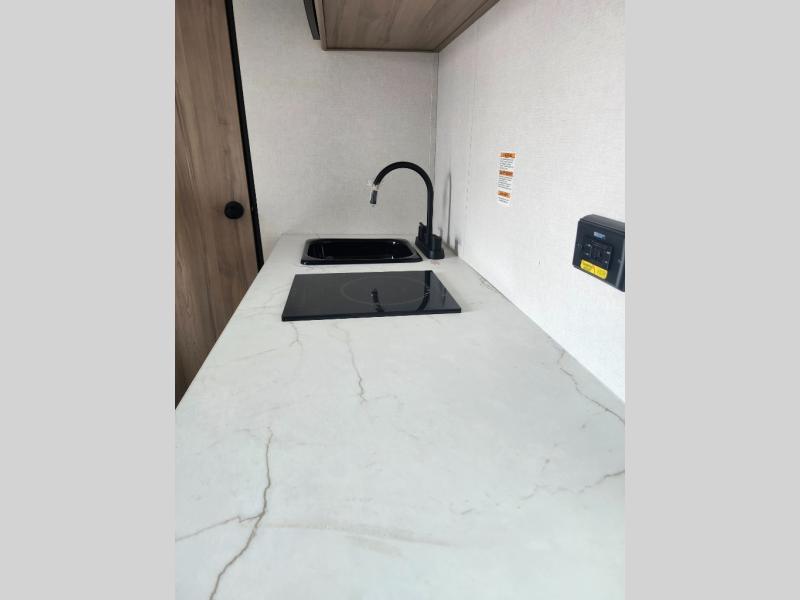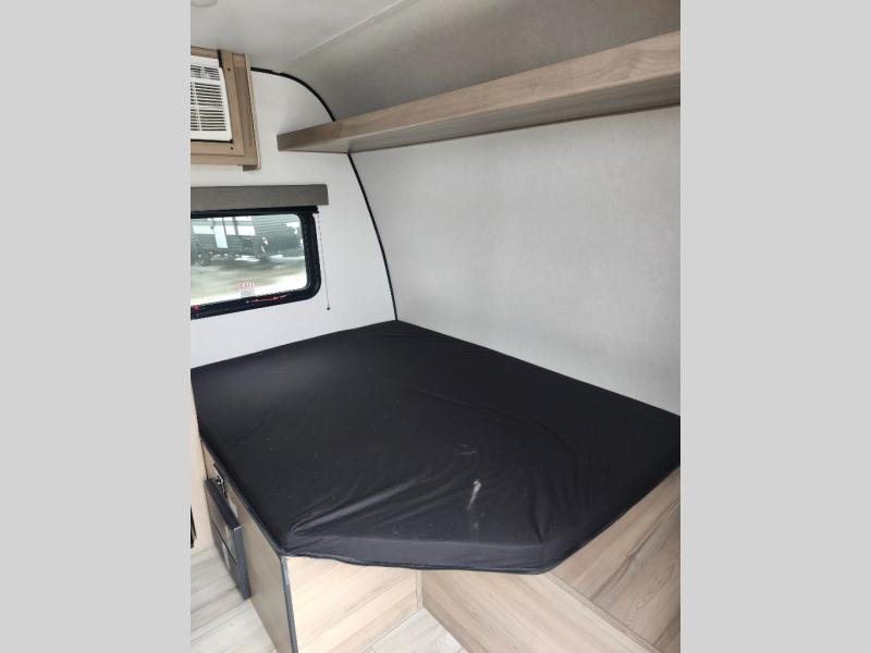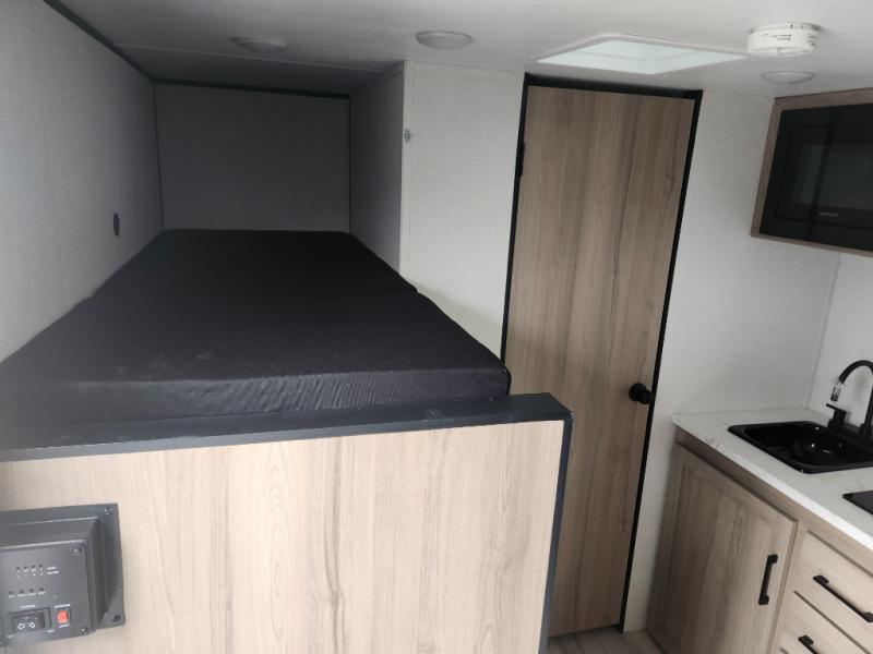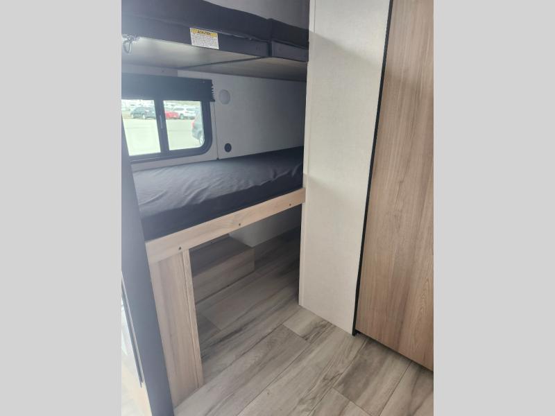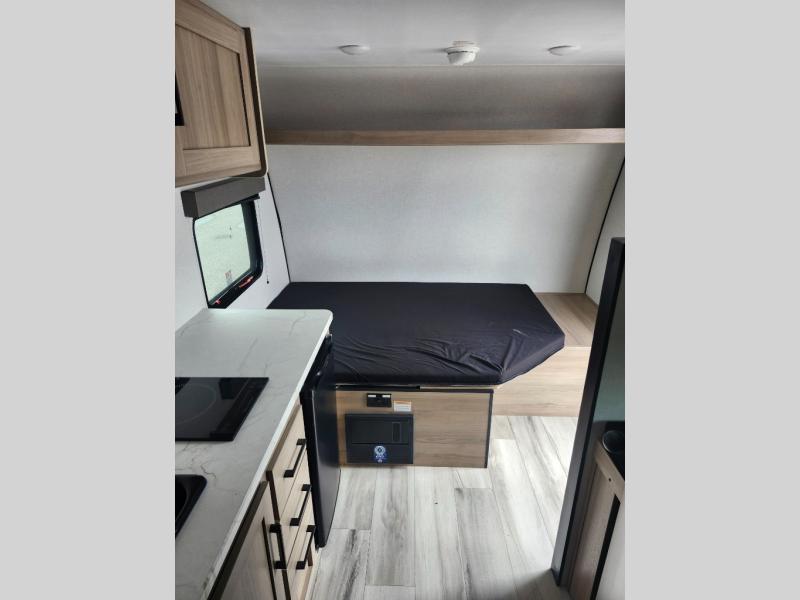 This compact travel trailer lets you camp in comfort at the location of your choice! Since there is a front queen bed, you won't have to sleep on an air mattress, and the shelf above the bed will be perfect for your belongings. Bunk beds provide additional sleeping space for your guests or little ones, and the private bath includes a shower and toilet so you won't have to use the camp's facilities at night. This model includes an induction cooktop and microwave oven to cook meals, plus a 3.2 cu. ft. 110V refrigerator for food storage. And the 8' power awning outdoors provides a place for you to sit in your camp chairs after dinner!