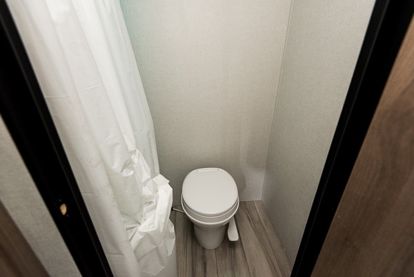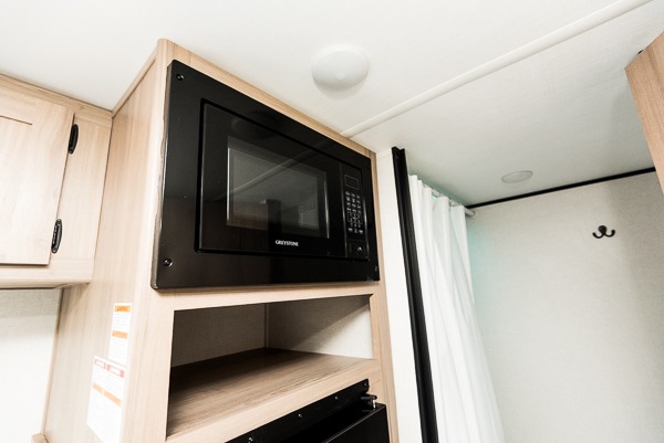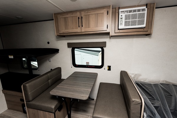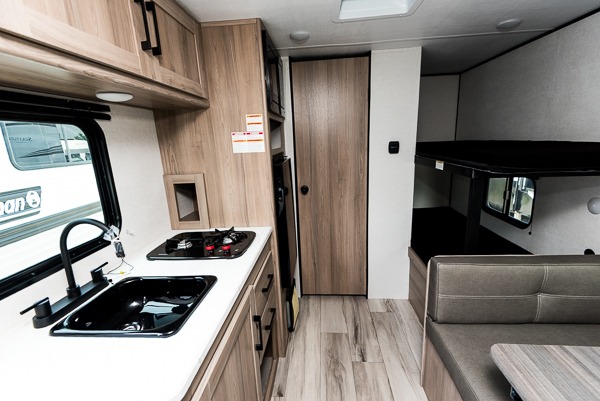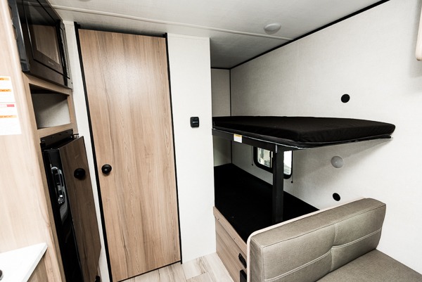 After making dinner on the two burner cooktop or inside the microwave, you can dine at the booth dinette or outside under the 8' power awning if you brought along your camping chairs. Either way you will be comfortable and the dinette may even sleep one person if needed. After playing outdoors all day, everyone can return to get cleaned up in the private toilet and shower room then fall asleep on the queen bed up front or the bunk beds in the rear. And everyone can wake up the next morning to do it over again.