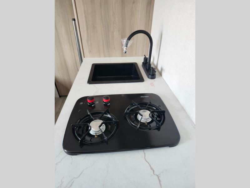 After making dinner on the two burner cooktop or microwave, you can dine at the booth dinette or outside under the 8' power awning if you brought along your camping chairs. Either way you will be comfortable and the dinette can even be converted to sleep one person if needed. After playing outdoors all day, everyone can return to get cleaned up in the full rear bath including a shower. There is even a linen closet and space for some clothes that hang. You may then fall asleep on the queen bed up front or the dinette once converted so you can start enjoying the outdoors again the next day.