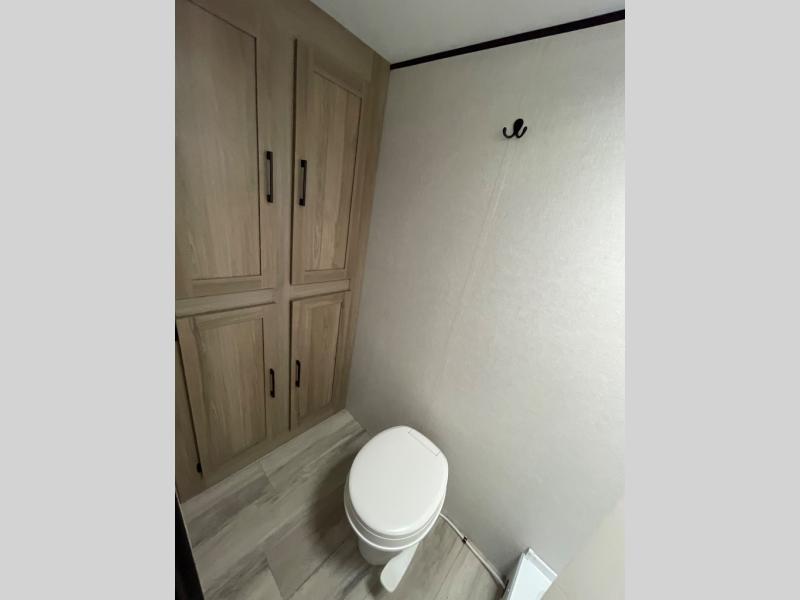 After making dinner on the two burner cooktop or microwave, you can dine at the booth dinette or outside under the 8' power awning if you brought along your camping chairs. Either way you will be comfortable and the dinette can even be converted to sleep one person if needed. After playing outdoors all day, everyone can return to get cleaned up in the full rear bath including a shower. There is even a linen closet and space for some clothes that hang. You may then fall asleep on the queen bed up front or the dinette once converted so you can start enjoying the outdoors again the next day.