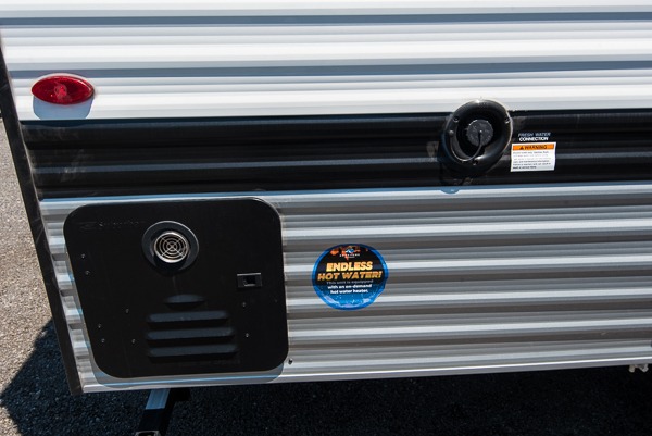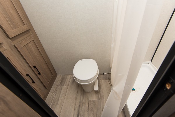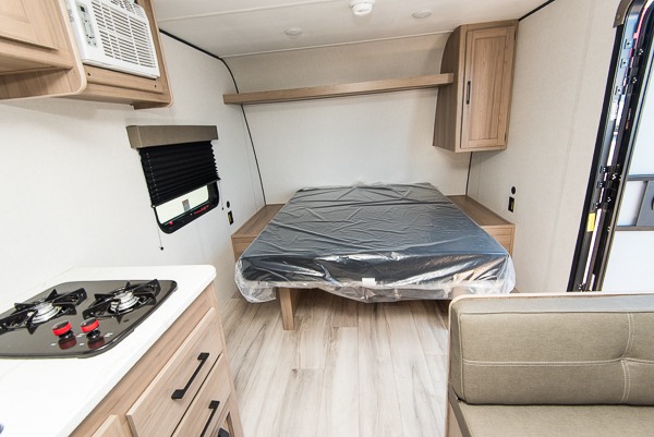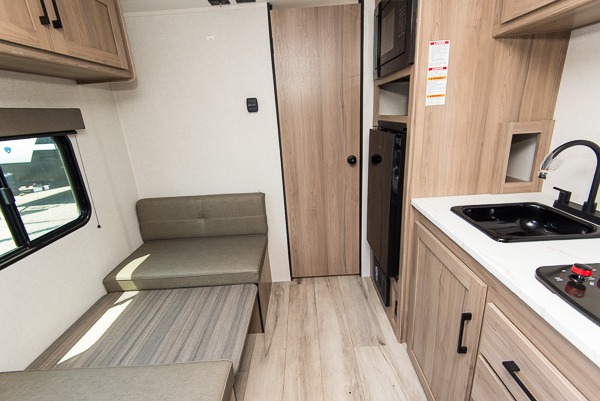 After making dinner on the two burner cooktop or microwave, you can dine at the booth dinette or outside under the 8' power awning if you brought along your camping chairs. Either way you will be comfortable and the dinette can even be converted to sleep one person if needed. After playing outdoors all day, everyone can return to get cleaned up in the full rear bath including a shower. There is even a linen closet and space for some clothes that hang. You may then fall asleep on the queen bed up front or the dinette once converted so you can start enjoying the outdoors again the next day.