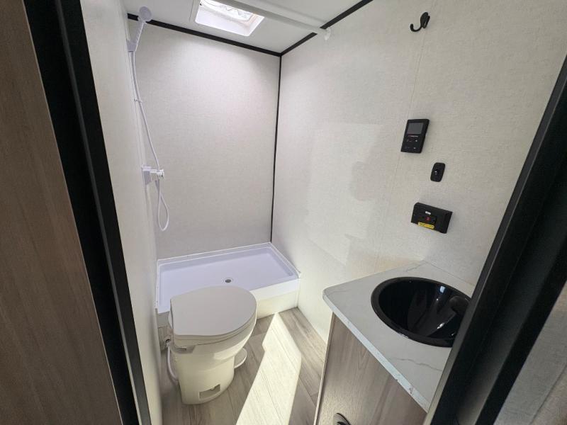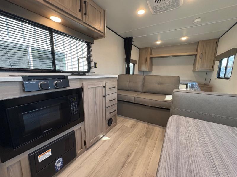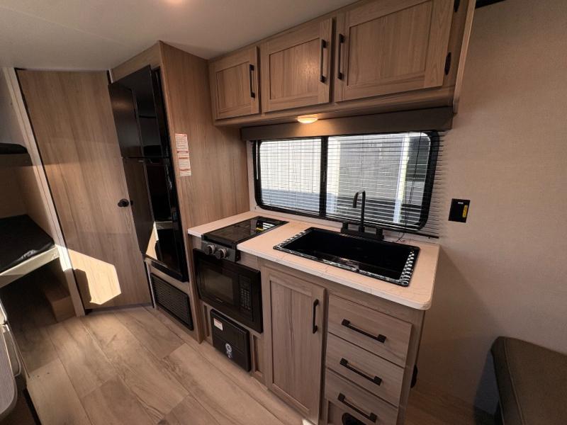 With any Coleman travel trailer, you will experience Keystone's quality throughout, plus enjoy lightweight towing to the campground or RV park. There is a walkable roof, tinted safety glass windows, and a power awning outdoors for an inviting space to relax. The friction hinge entry door is another convenience you'll appreciate, and there is Furrion backup camera prep if you want the option to make parking easier. Inside, you'll find blackout night shades, a 6' 8" ceiling height, bedside outlets, and many more comforts.
