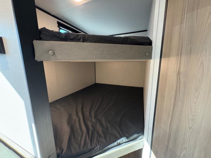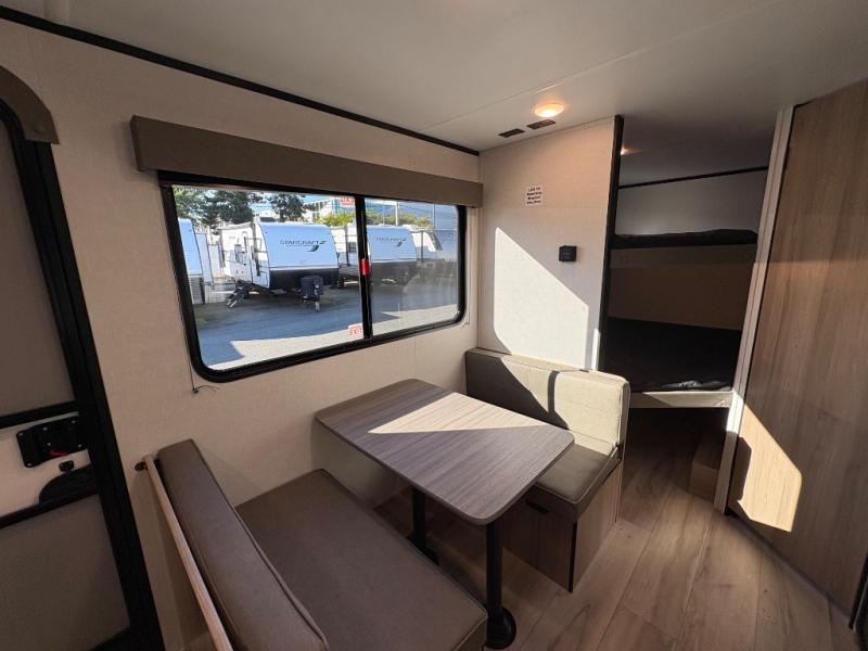 The whole gang will love camping in this no-slide bunkhouse travel trailer! While your guests take the bunks, you can have the queen bed in the front bedroom all to yourselves. There are also dual bedside wardrobes here and a privacy curtain for added convenience. A sofa and booth dinette provide seating space and additional sleeping space, and the full kitchen includes a two burner cooktop and microwave oven to cook meals. Head outdoors to enjoy the 16' power awning, or grab your fishing poles from the pass-through storage and head down to the lake. There is also outside storage under the bunks for even more camp gear!