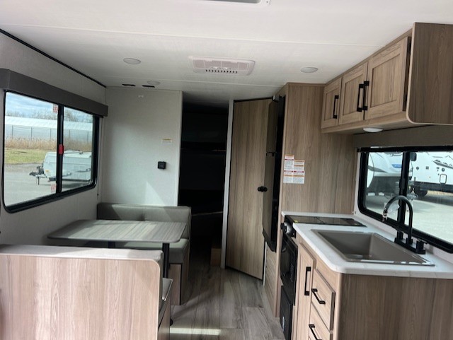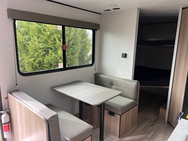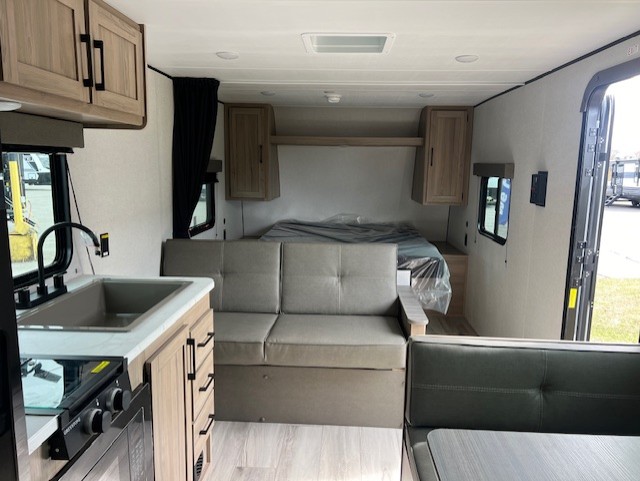 The whole gang will love camping in this no-slide bunkhouse travel trailer! While your guests take the bunks, you can have the queen bed in the front bedroom all to yourselves. There are also dual bedside wardrobes here and a privacy curtain for added convenience. A sofa and booth dinette provide seating space and additional sleeping space, and the full kitchen includes a two burner cooktop and microwave oven to cook meals. Head outdoors to enjoy the 16' power awning, or grab your fishing poles from the pass-through storage and head down to the lake. There is also outside storage under the bunks for even more camp gear!