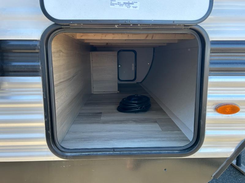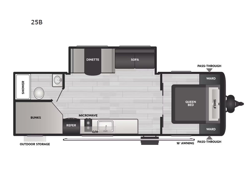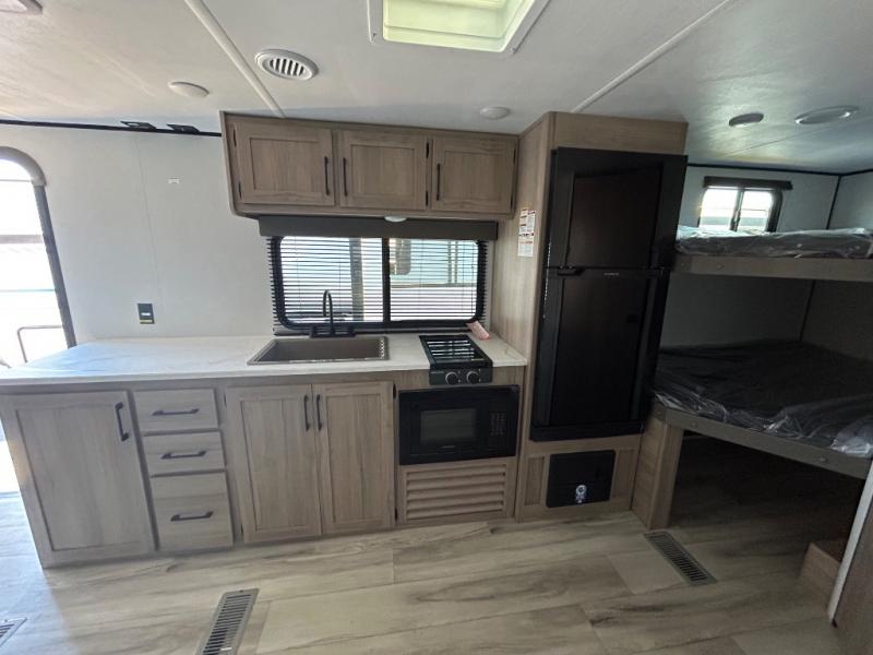 The whole gang will love camping in this bunkhouse model with a super slide! While your guests take the bunks, you can have the queen bed in the front bedroom all to yourselves. A sofa and booth dinette within the slide provide seating space and additional sleeping space, and the full kitchen includes a two burner cooktop and microwave oven to cook meals. Head outdoors to enjoy the 16' power awning, or grab your fishing poles from the pass-through storage and head down to the lake.