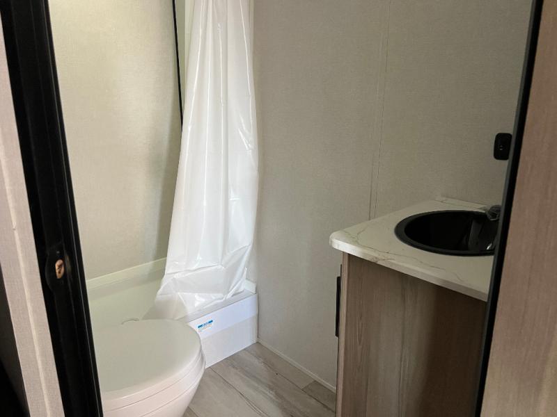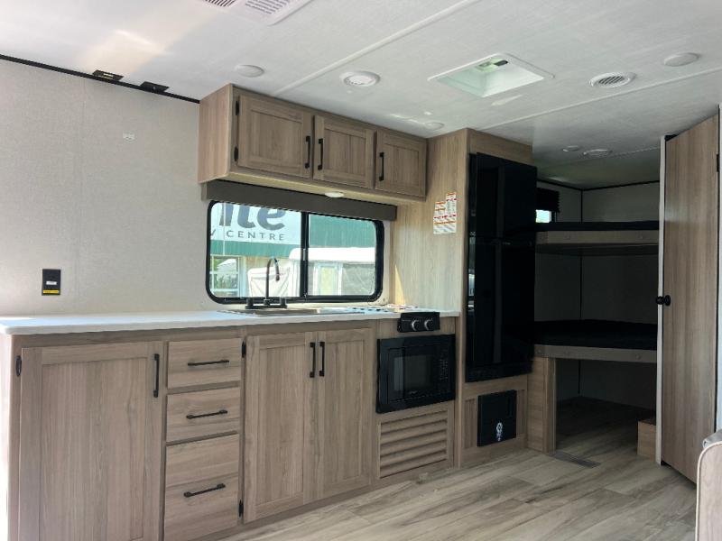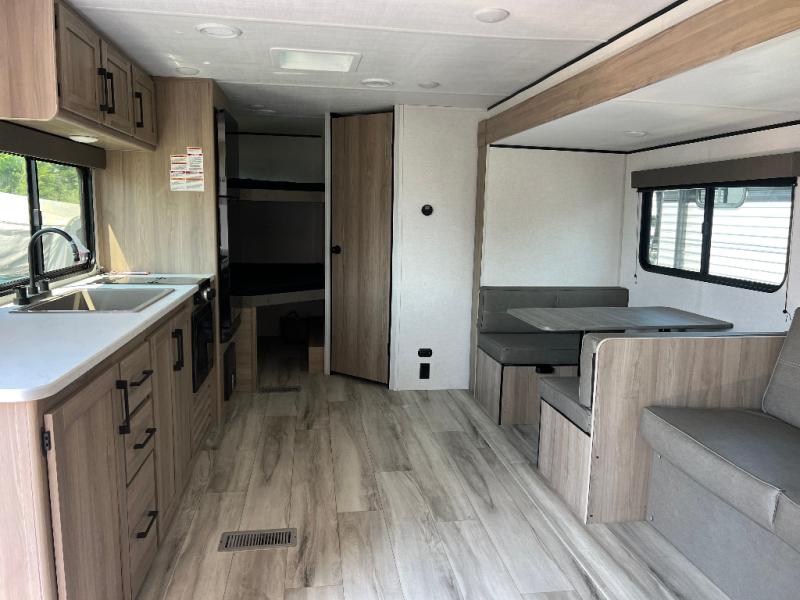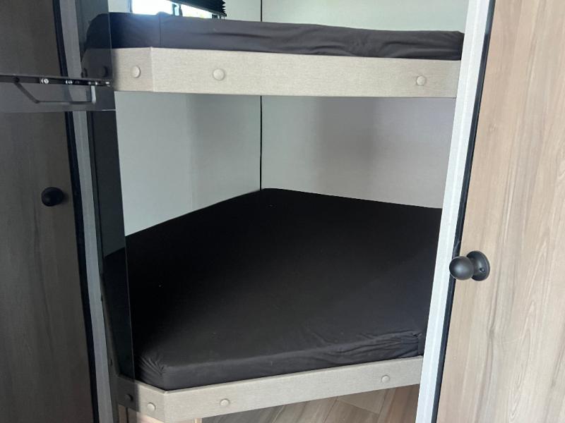The whole gang will love camping in this bunkhouse model with a super slide! While your guests take the bunks, you can have the queen bed in the front bedroom all to yourselves. A sofa and booth dinette within the slide provide seating space and additional sleeping space, and the full kitchen includes a two burner cooktop and microwave oven to cook meals. Head outdoors to enjoy the 16' power awning, or grab your fishing poles from the pass-through storage and head down to the lake.