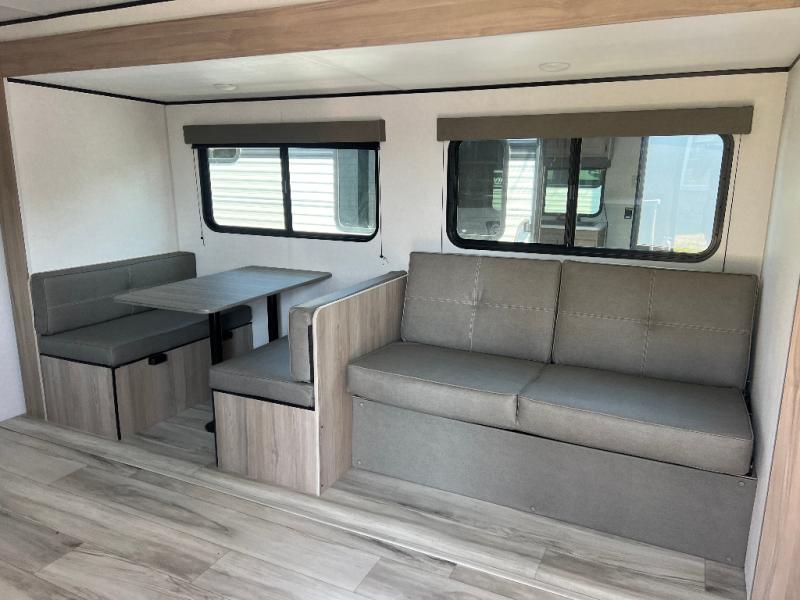 With any Coleman travel trailer, you will experience Keystone's quality throughout, plus enjoy lightweight towing to the campground or RV park. There is a walkable roof, tinted safety glass windows, and a power awning outdoors for an inviting space to relax. The friction hinge entry door is another convenience you'll appreciate, and there is Furrion backup camera prep if you want the option to make parking easier. Inside, you'll find blackout night shades, a 6' 8" ceiling height, bedside outlets, and many more comforts.
