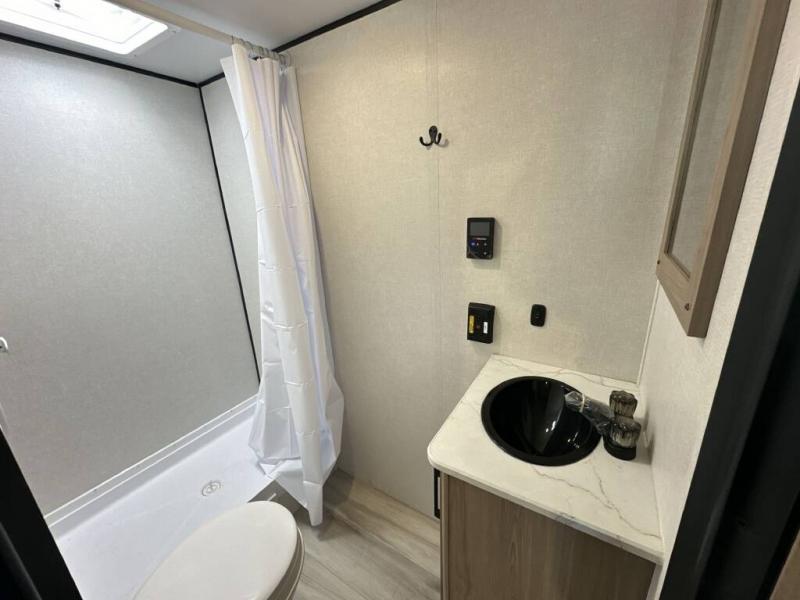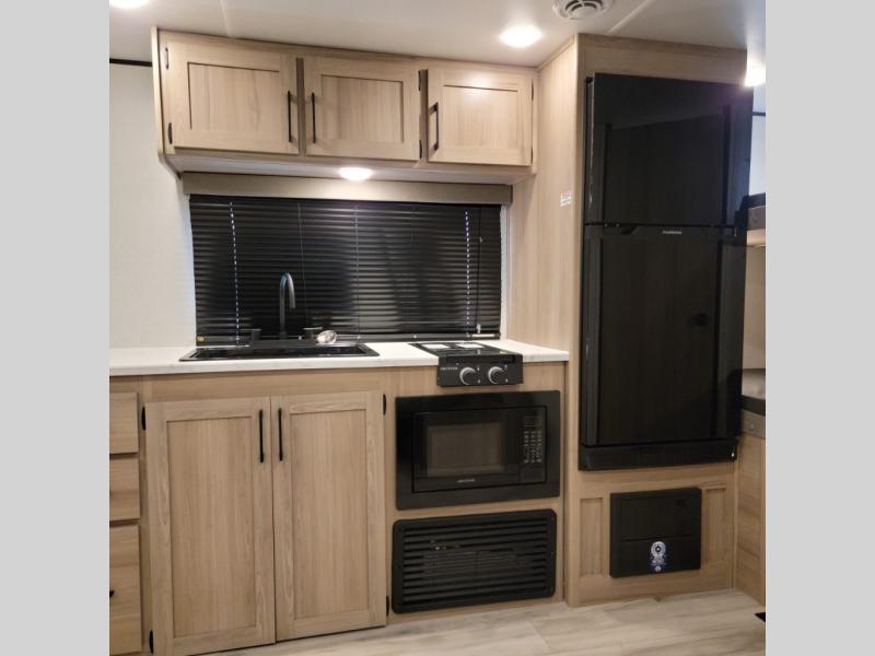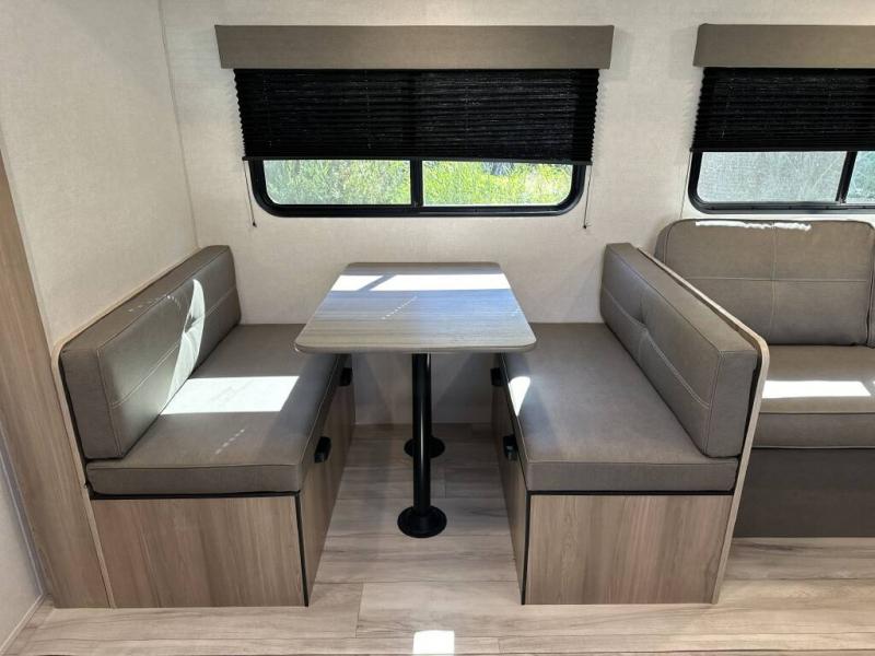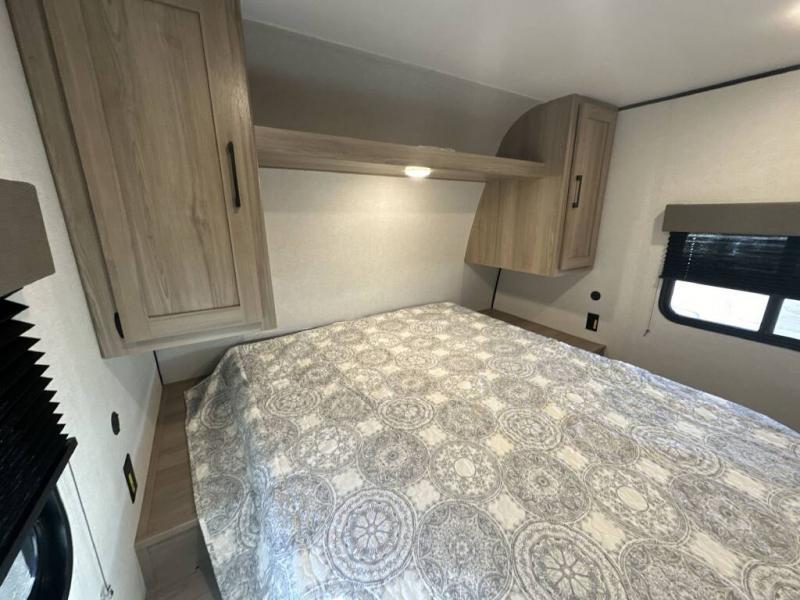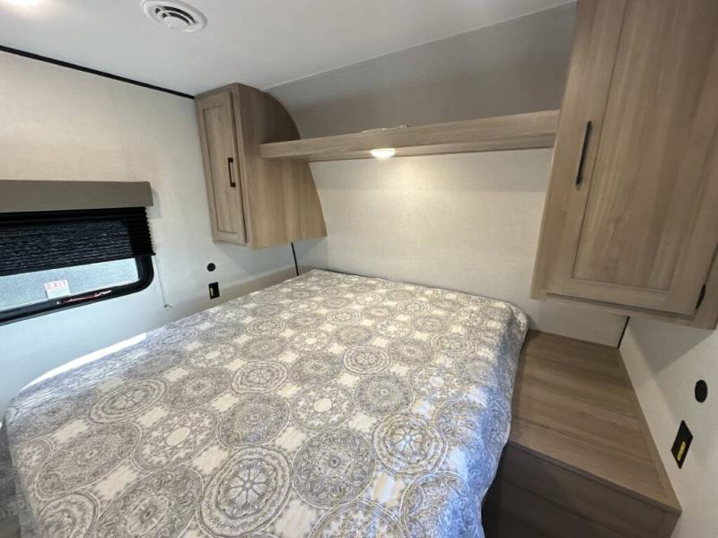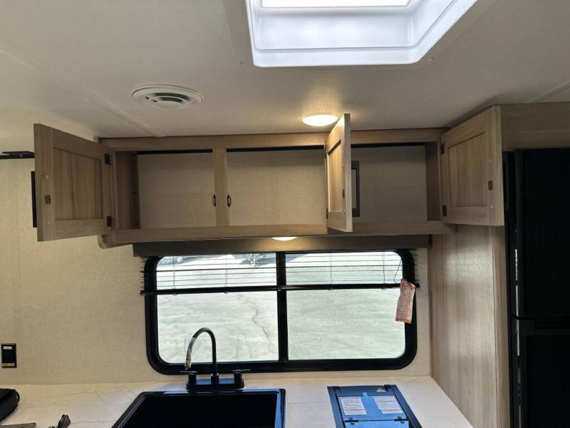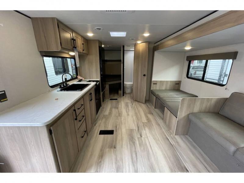With any Coleman travel trailer, you will experience Keystone's quality throughout, plus enjoy lightweight towing to the campground or RV park. There is a walkable roof, tinted safety glass windows, and a power awning outdoors for an inviting space to relax. The friction hinge entry door is another convenience you'll appreciate, and there is Furrion backup camera prep if you want the option to make parking easier. Inside, you'll find blackout night shades, a 6' 8" ceiling height, bedside outlets, and many more comforts.