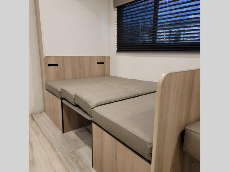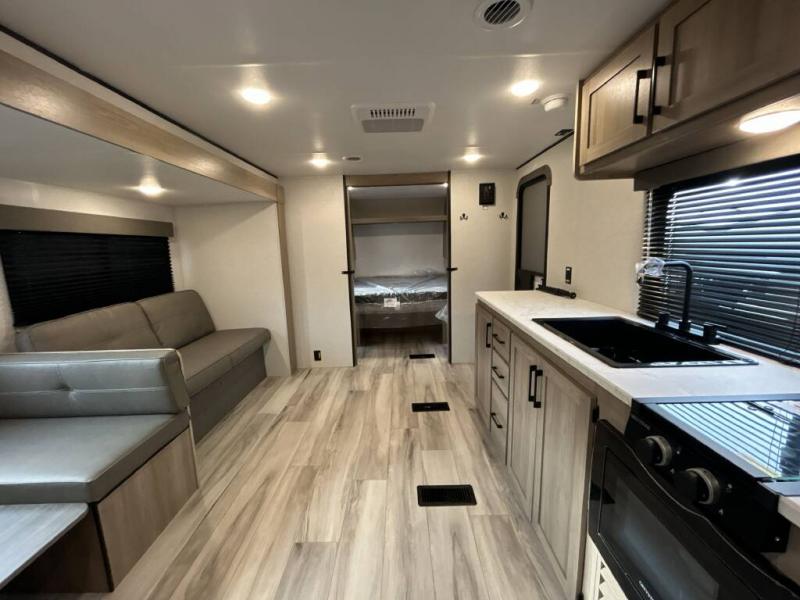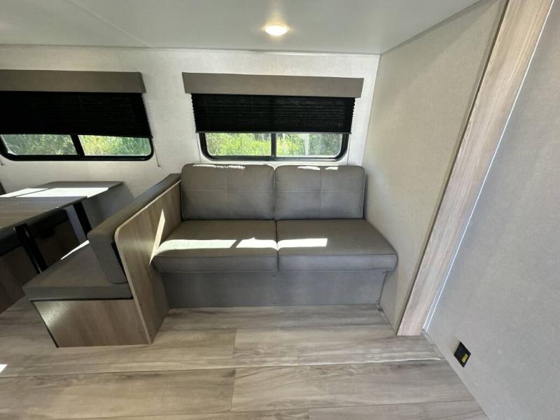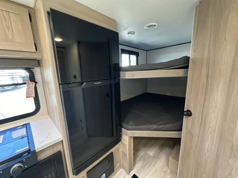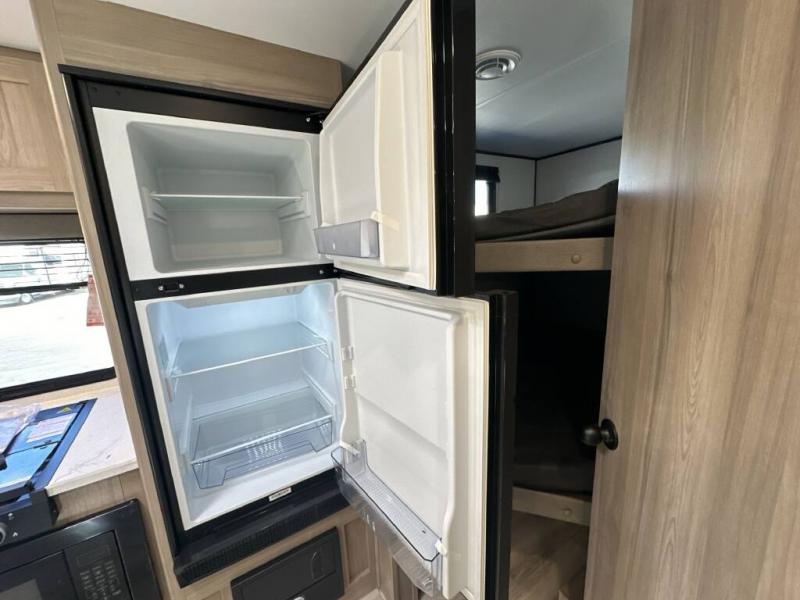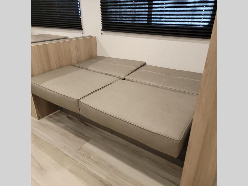 The whole gang will love camping in this bunkhouse model with a super slide! While your guests take the bunks, you can have the queen bed in the front bedroom all to yourselves. A sofa and booth dinette within the slide provide seating space and additional sleeping space, and the full kitchen includes a two burner cooktop and microwave oven to cook meals. Head outdoors to enjoy the 16' power awning, or grab your fishing poles from the pass-through storage and head down to the lake.