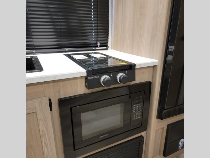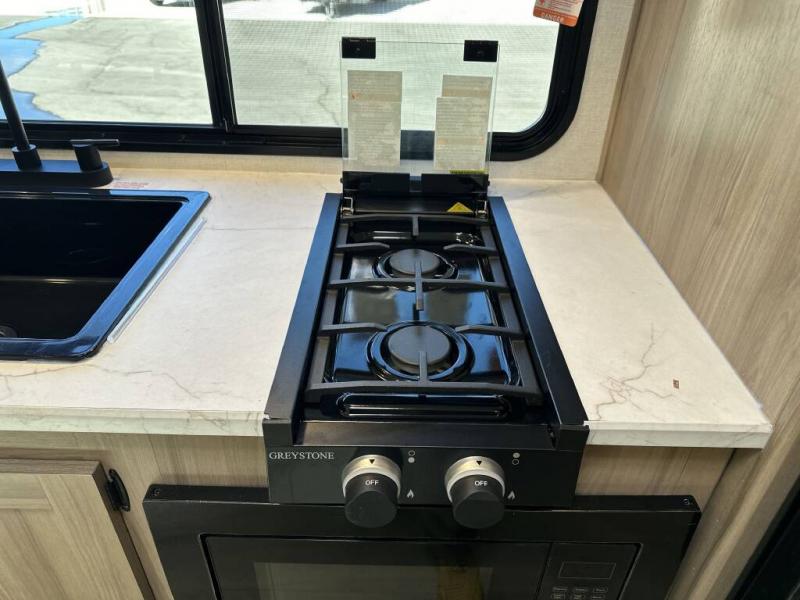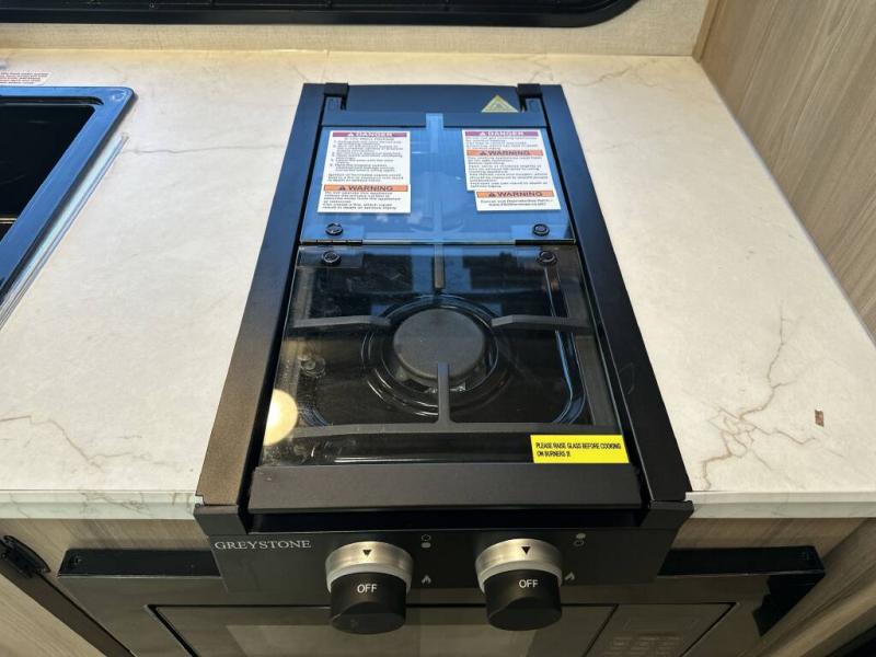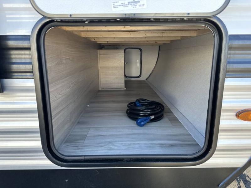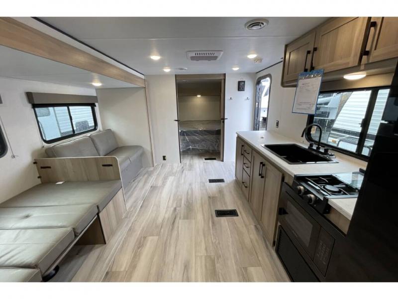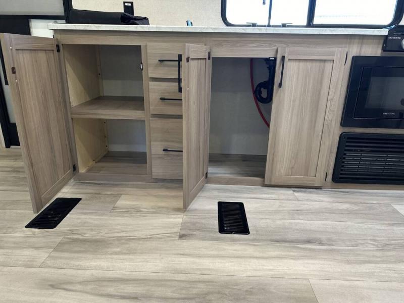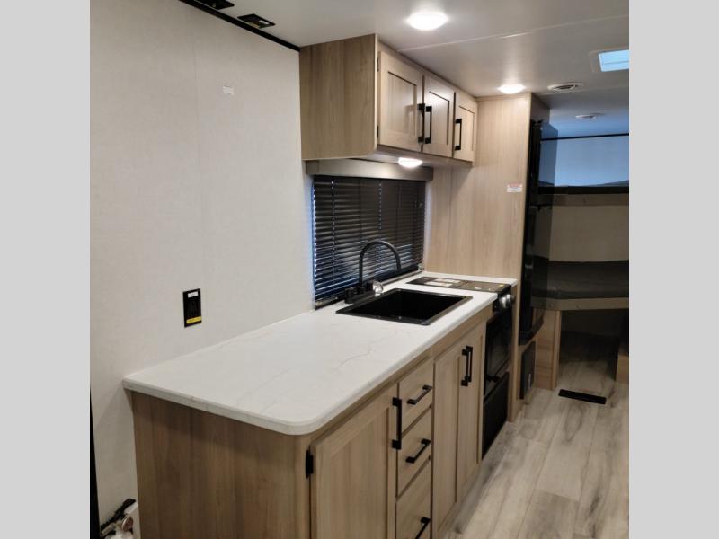 The whole gang will love camping in this bunkhouse model with a super slide! While your guests take the bunks, you can have the queen bed in the front bedroom all to yourselves. A sofa and booth dinette within the slide provide seating space and additional sleeping space, and the full kitchen includes a two burner cooktop and microwave oven to cook meals. Head outdoors to enjoy the 16' power awning, or grab your fishing poles from the pass-through storage and head down to the lake.