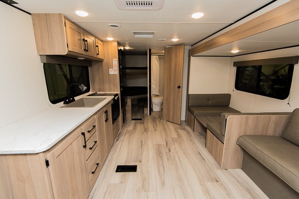 The whole gang will love camping in this bunkhouse model with a super slide! While your guests take the bunks, you can have the queen bed in the front bedroom all to yourselves. A sofa and booth dinette within the slide provide seating space and additional sleeping space, and the full kitchen includes a two burner cooktop and microwave oven to cook meals. Head outdoors to enjoy the 16' power awning, or grab your fishing poles from the pass-through storage and head down to the lake.